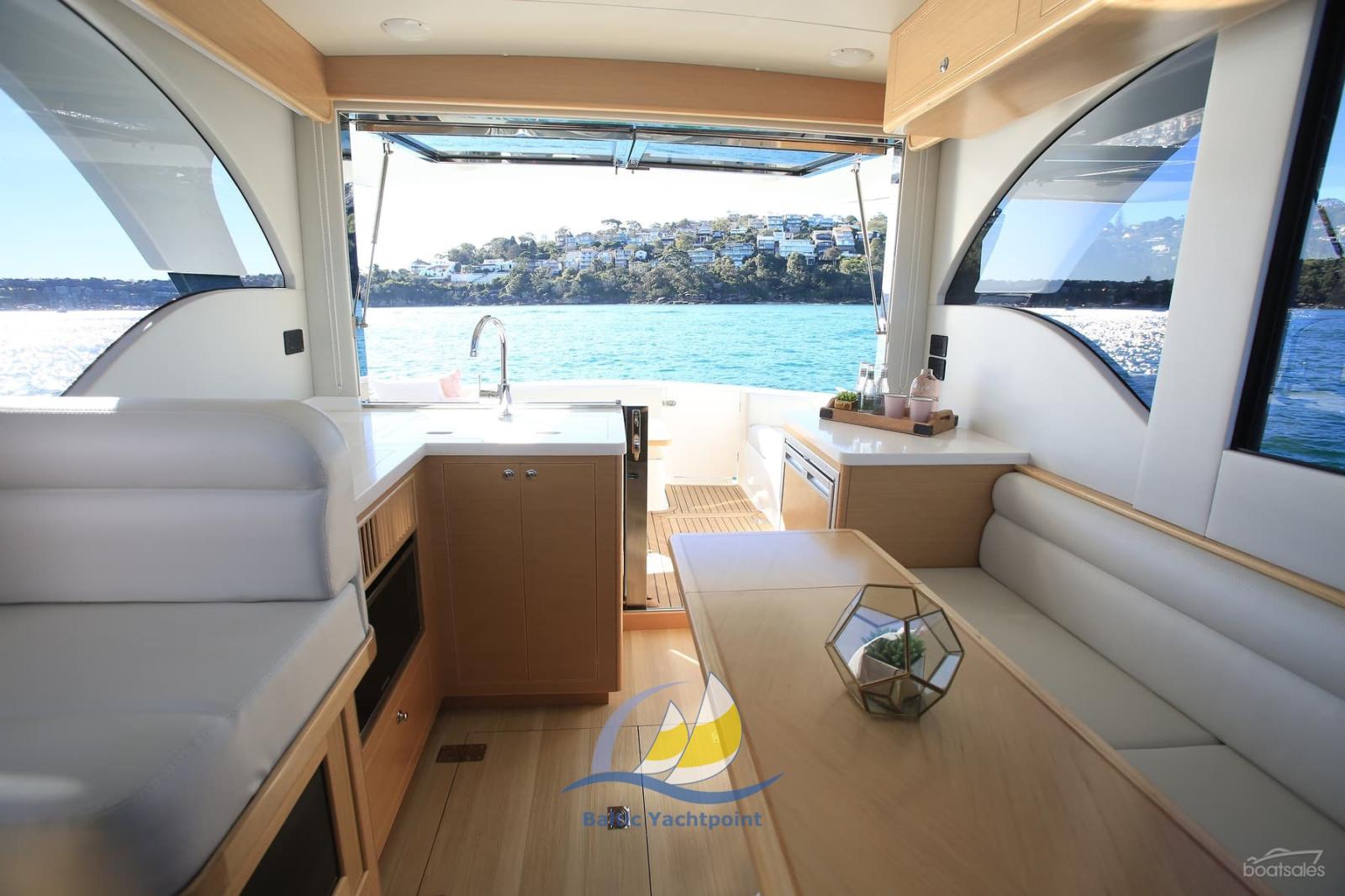 Cuisine exceptionnellement généreuse avec réfrigérateur et double évier plan de travail en Corian de haute qualité et luminaires accès facile au cockpit et au salon avec coin repas. Très aéré et lumineux, avec beaucoup d’espace de rangement!