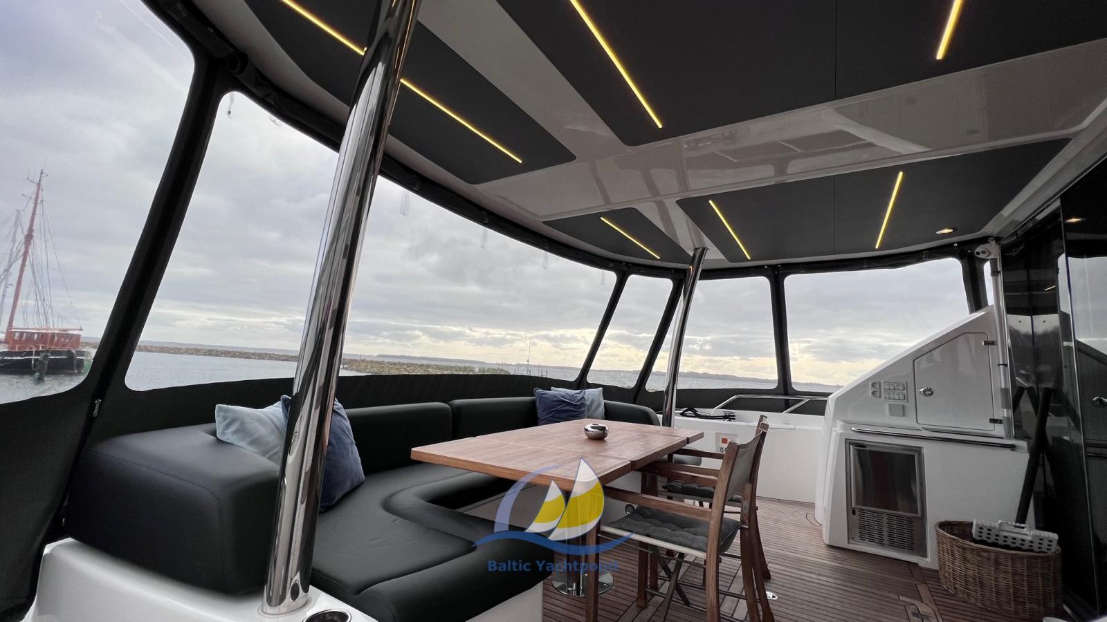 Ce MANHATTAN 73 dispose d’un salon spacieux avec salon et salle à manger, spécialement conçu pour le propriétaire, ainsi que de fenêtres panoramiques et d’un cockpit spacieux. Il dispose également d’une vaste terrasse qui comprend un toit ouvrant électrique entouré de belles fenêtres transparentes amovibles pour s’assurer qu’il peut être apprécié quel que soit le temps. Ouvrez le toit la nuit et dégustez des cocktails sous les étoiles ou fermez la canopée pour empêcher la pluie d’entrer – vous n’avez pas besoin de remettre les couvertures pendant des heures à la fin de la journée. La terrasse contient une télévision intégrée dans le toit rigide, un bar bien approvisionné avec réfrigérateur, machine à glaçons et grill, et un fantastique spa jacuzzi; Idéal pour les enfants et parfait pour voyager vers le nord.