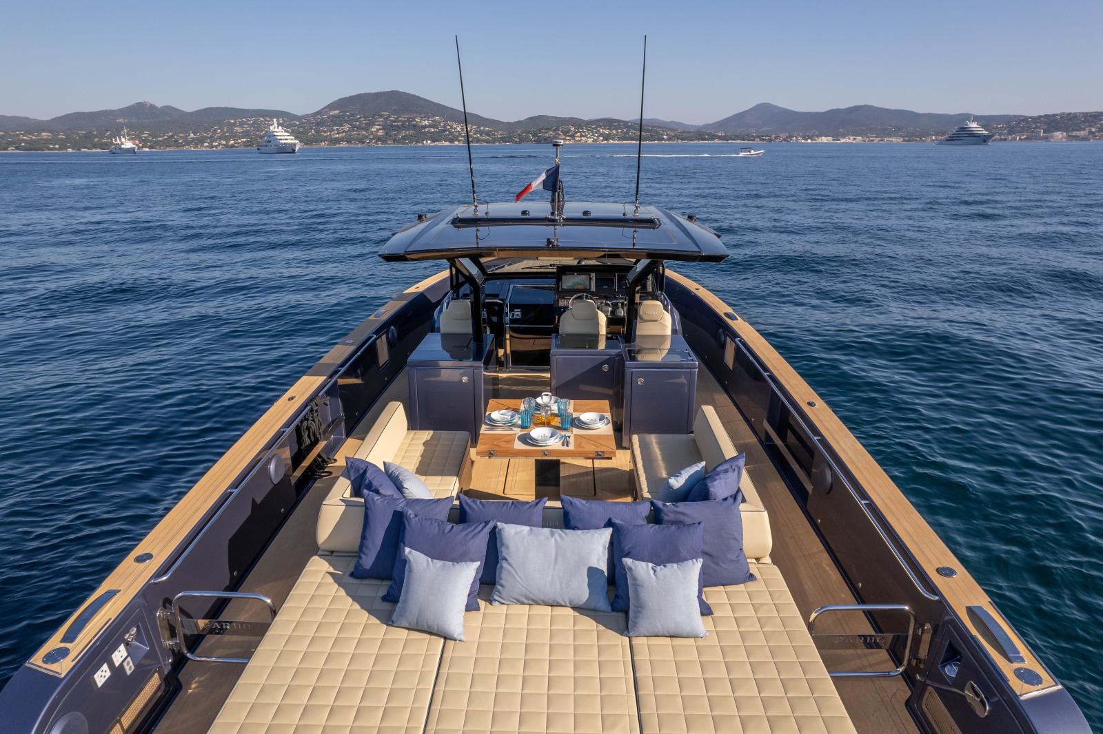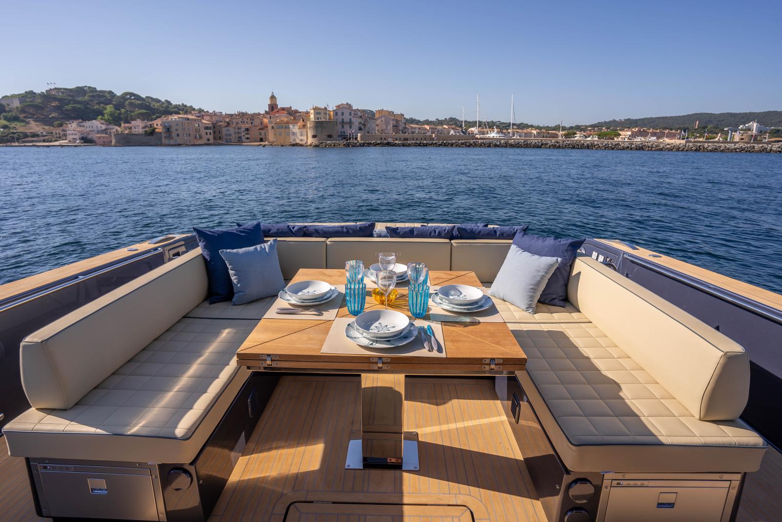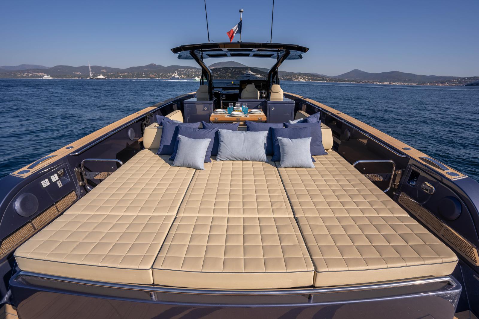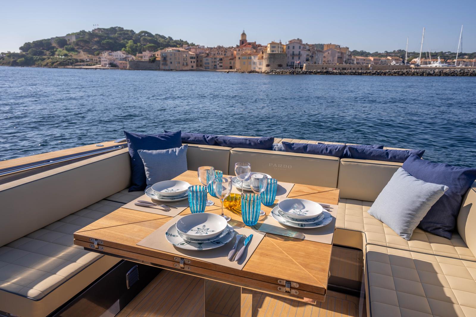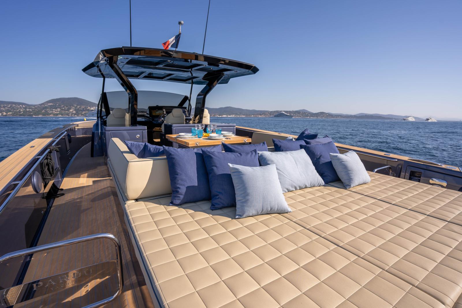 Les bains de soleil avant et arrière offrent 2 espaces distincts pour se reposer et profiter du soleil de St-Tropez. La table du grand salon extérieur à la possibilité d’être montée sur vérin électrique, celle-ci peut monter ou descendre et se transforme en un troisième bain de soleil ; avec cette option astucieuse le bateau Pardo 50 peux accueillir jusqu’à 16 personnes.