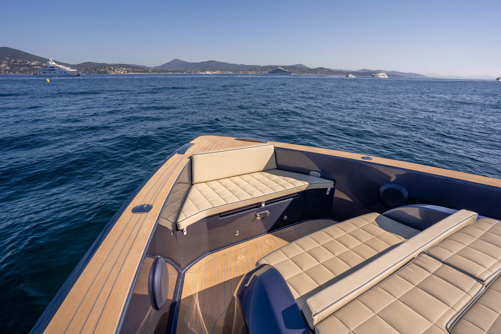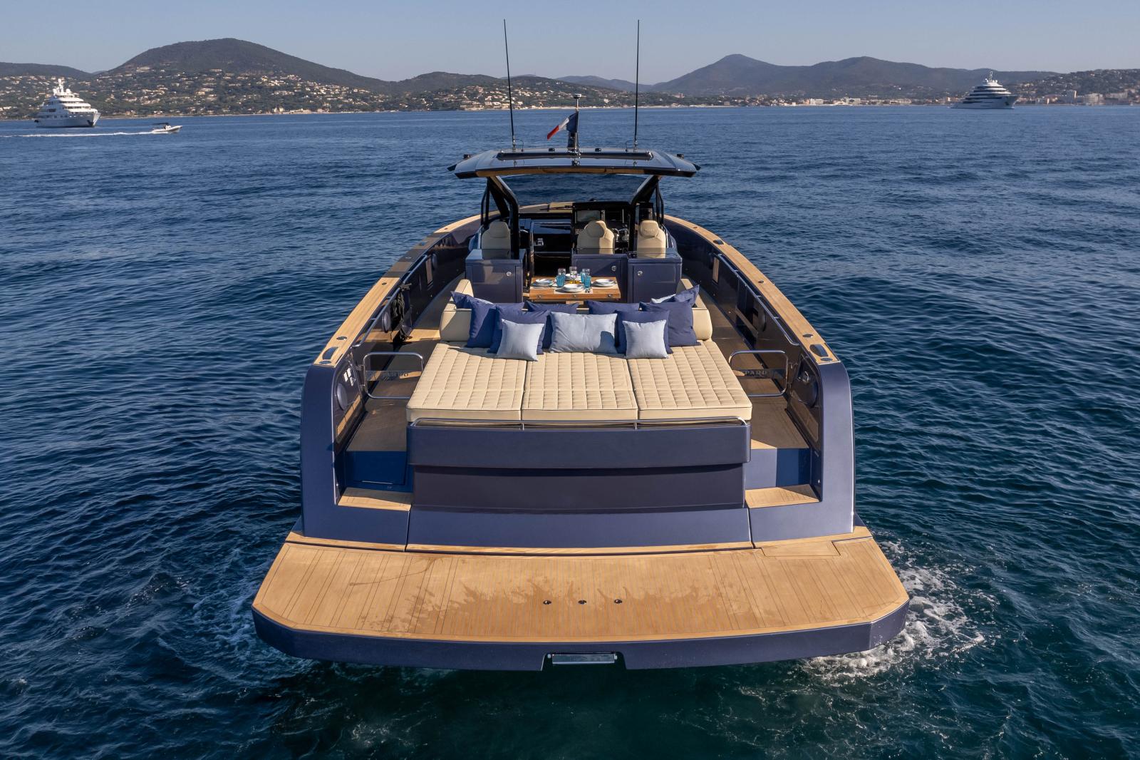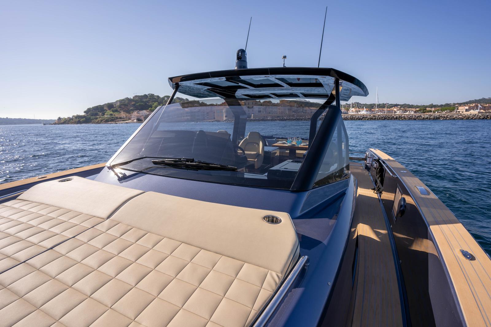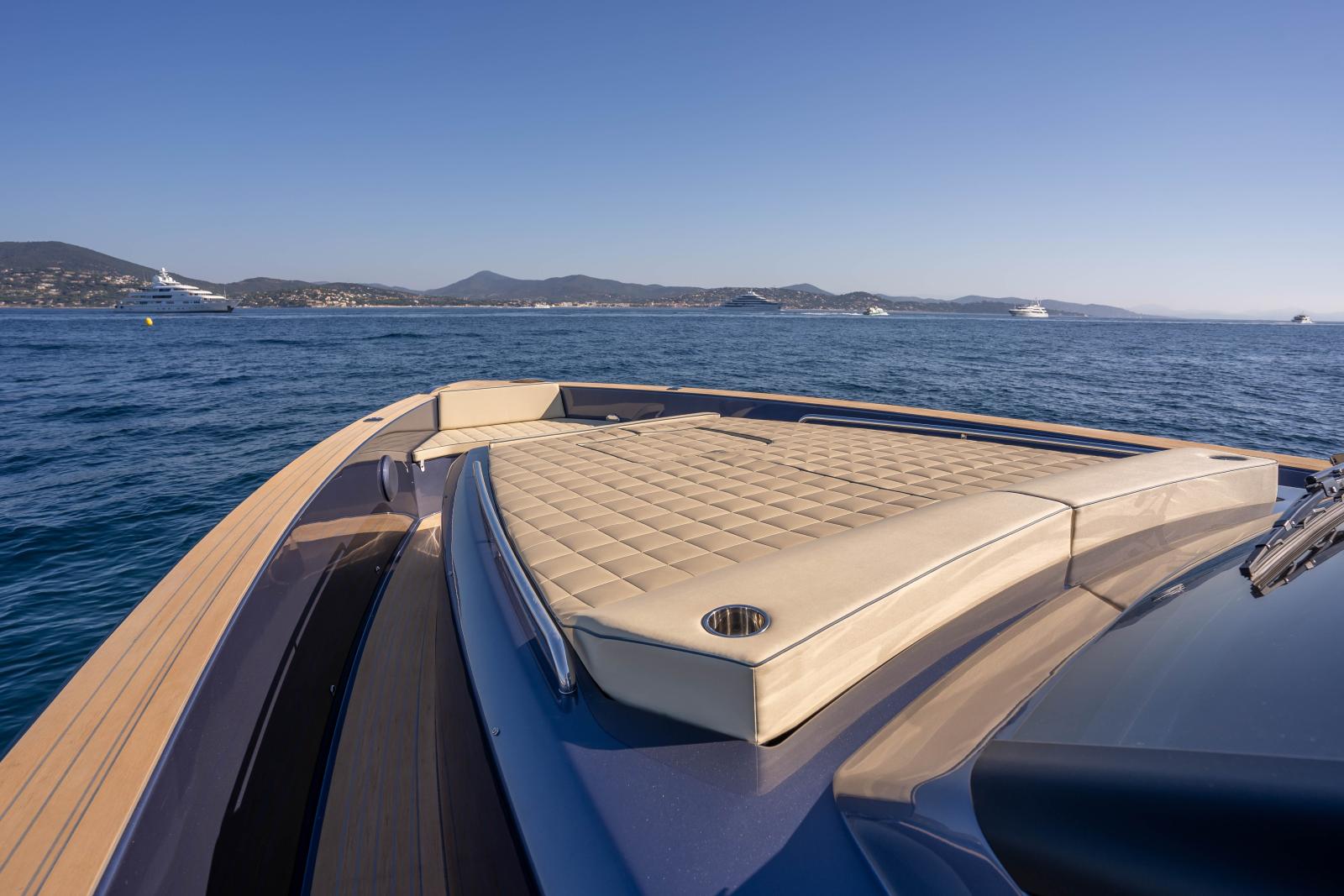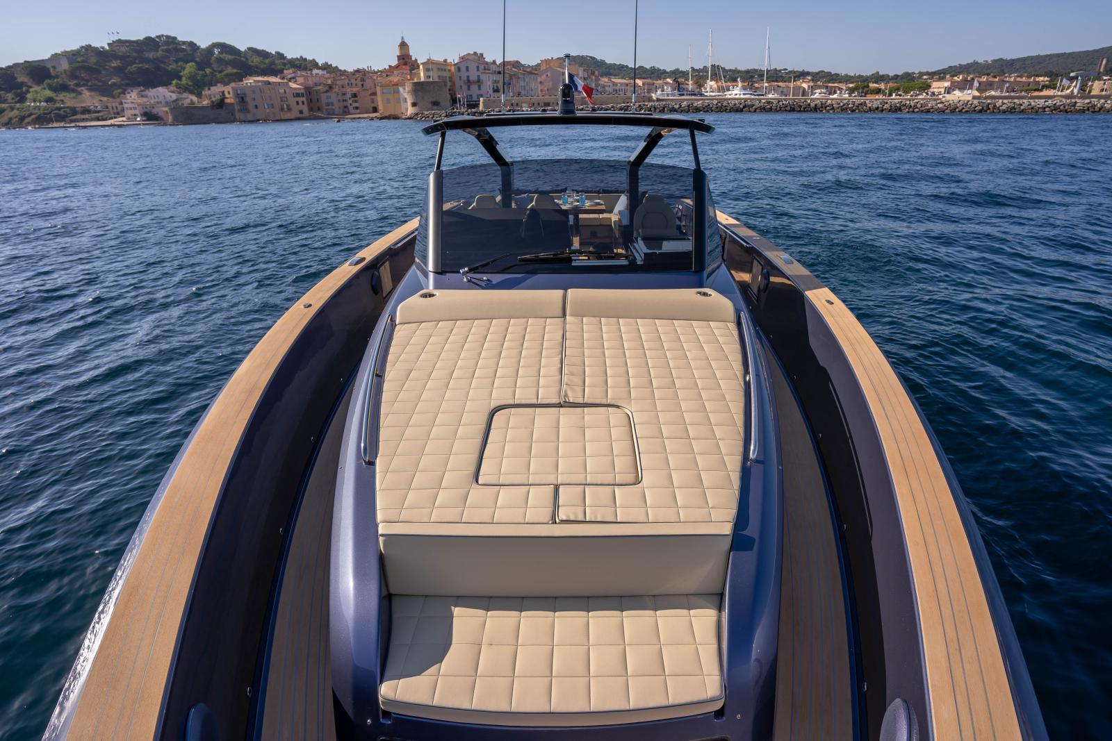 Les bains de soleil avant et arrière offrent 2 espaces distincts pour se reposer et profiter du soleil de St-Tropez. La table du grand salon extérieur à la possibilité d’être montée sur vérin électrique, celle-ci peut monter ou descendre et se transforme en un troisième bain de soleil ; avec cette option astucieuse le bateau Pardo 50 peux accueillir jusqu’à 16 personnes.