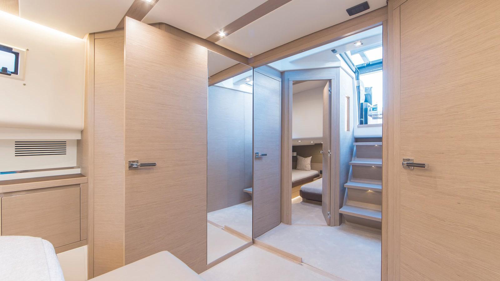 A l’intérieur du bateau, l’espace est vaste et lumineux on y retrouve 2 grandes cabines avec leur salle de bain privative, un système de cloison repliable permet de séparer la chambre du propriétaire bu bateau doté d’un grand lit double tandis que la cabine invitée dispose de 2 lits séparés. L’utilisation des espaces a été optimisée pour même accueillir une cabine skipper avec son entrée privative qui se fait depuis la cuisine extérieure, cet espace destiné à l’équipage comprend un lit pour une personne ainsi que des toilettes. Il est également possible d’aménager ce quart en lazaret pour y stocker l’avitaillement ou des produits d’entretiens.