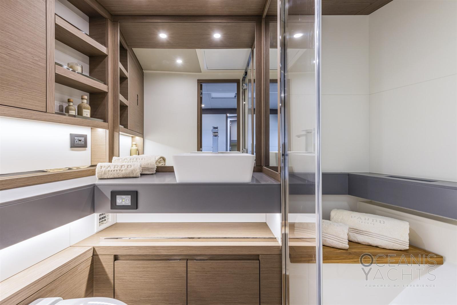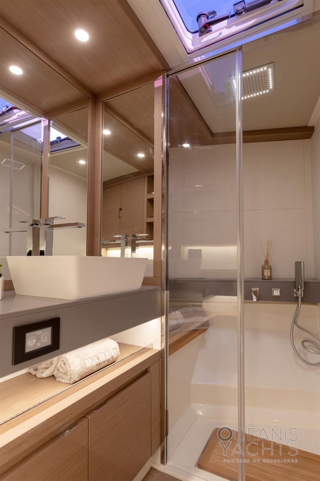 Alarme gaz, Alarme moteur, Alarme de pompe de cale, Eau sous pression, Taquets pliants, Passavant en teck, Câble d’alimentation à quai, Filière, Douche de cockpit, Phare de poursuite, Flaps électriques, Hard top, Extincteur(s) fixe(s), Éclairage de courtoisie, Spots sous-marins, 8 Défenses, Passerelle (idraulica a scomparsa), Plateforme arrière (idraulica tender lift), Pompe de cale automatique, Pompe de cale manuelle, Pont en teck, Porte latérale, Cockpit en teck, Prise de quai, Connexion eau sous pression à quai, Guindeau électrique, Echelle de bain, table de cockpit, Table pliante de salon (elettrico), Corne, Winch électrique arrière, Winch électrique avant.