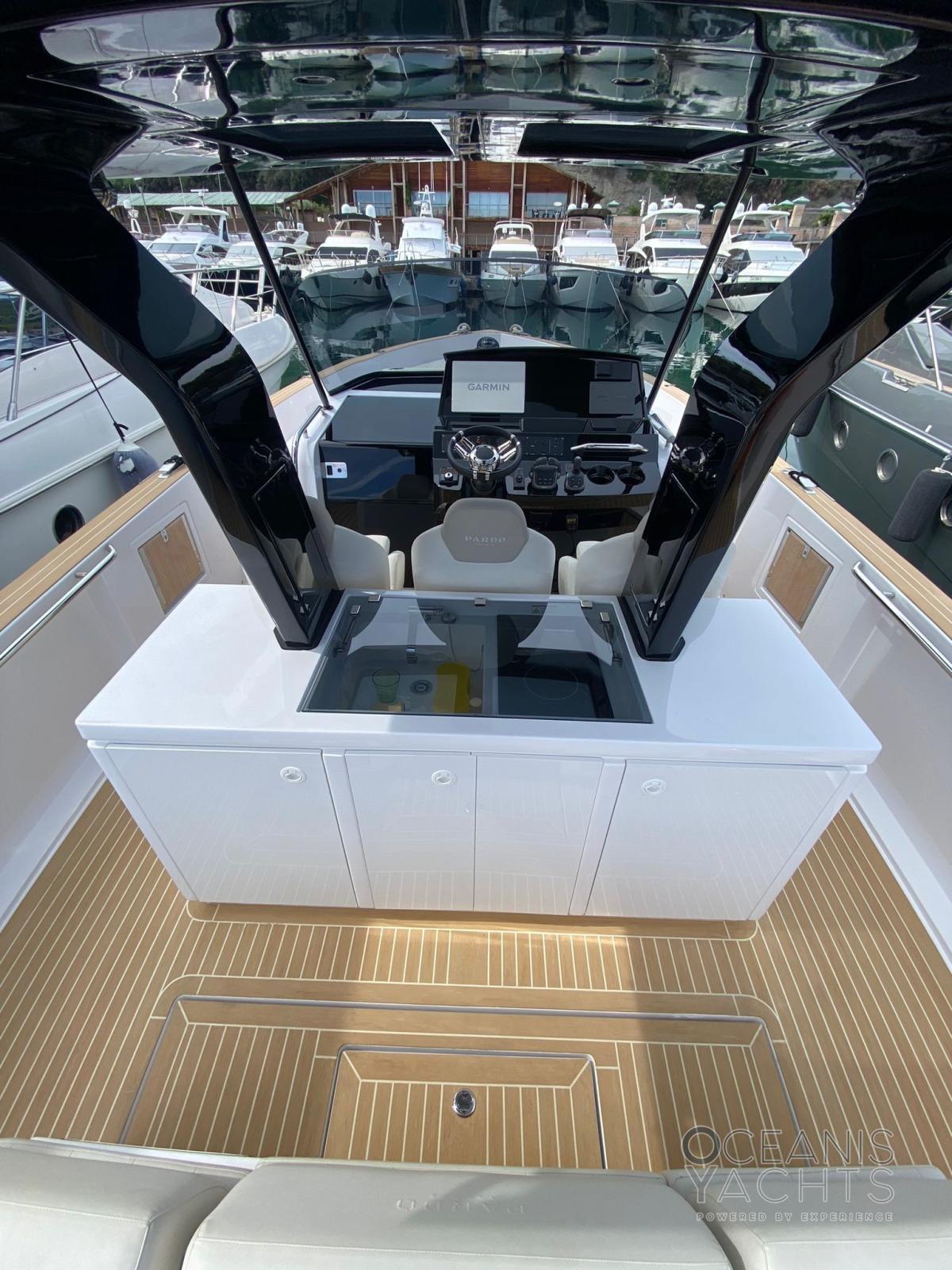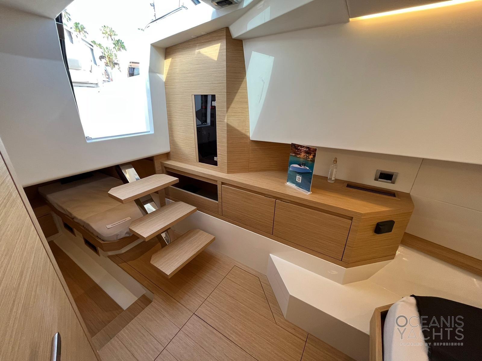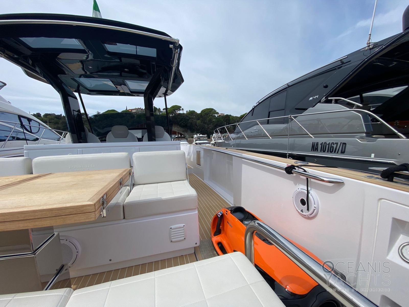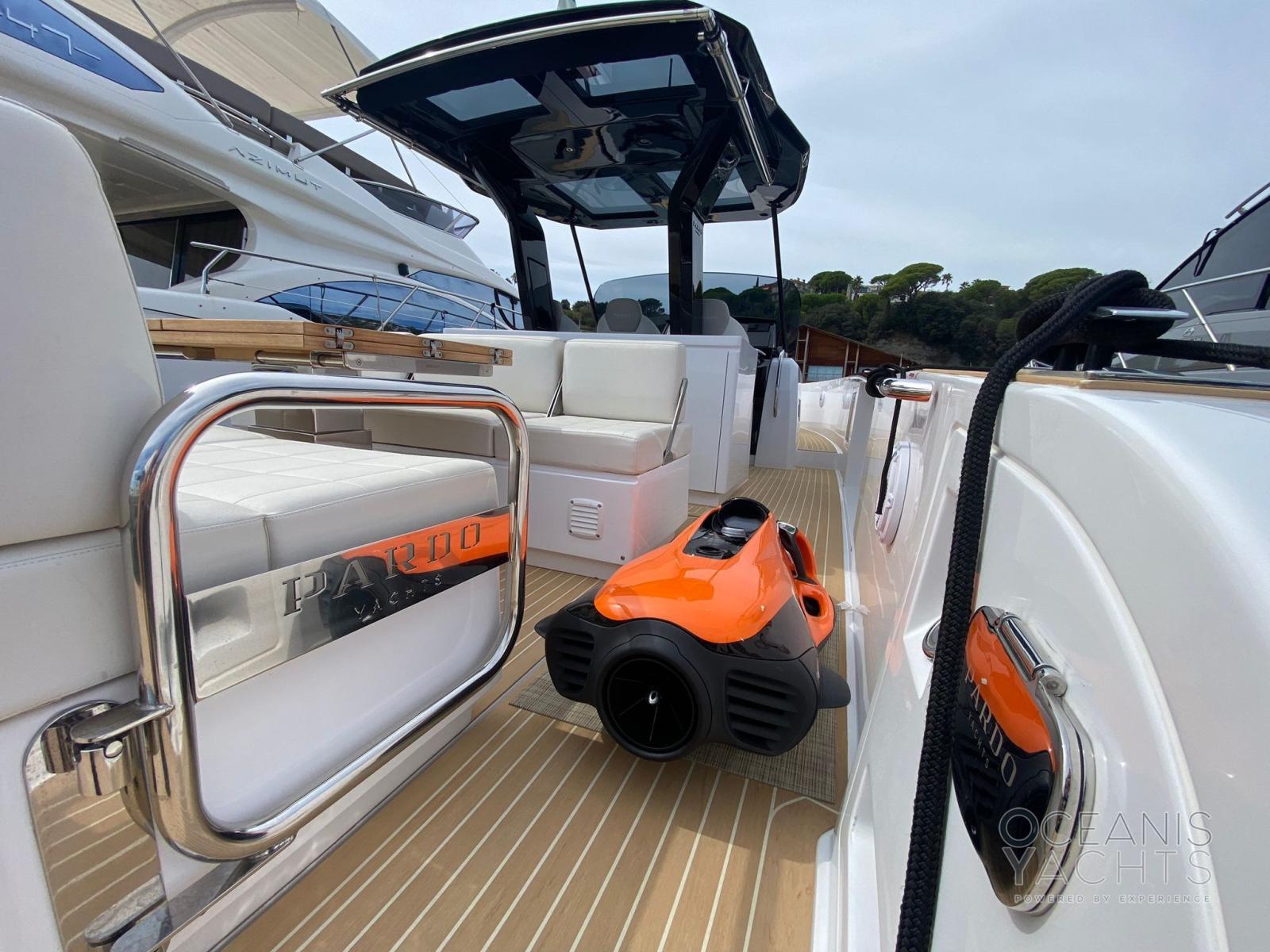 Eau sous pression, Trim hydraulique (Zipwake), 6 Batteries, Taquets pliants, Chargeur de batterie (60 Ah), Douche de cockpit, Plateforme arrière (maggiorata), Porte latérale, Cockpit en teck (Flexiteck), Prise de quai, Guindeau électrique, Echelle de bain (con tinetibene integrato), table de cockpit (elettrico), T-Top.