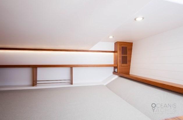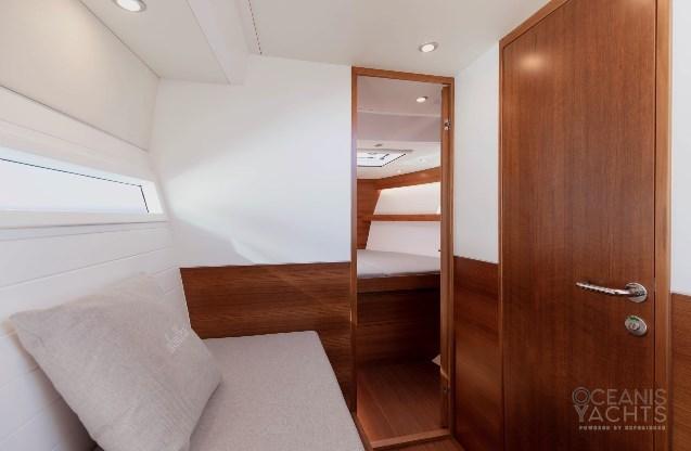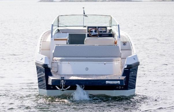 L’aménagement extérieur sûr et extraordinairement efficace comprend une cuisine entièrement équipée et un salon de pont arrière réglable qui se transforme facilement en transat ou en cote. Sous les ponts, un intérieur sophistiqué en teck peut accueillir confortablement quatre personnes dans deux cabines séparées.