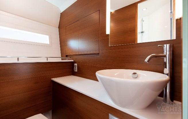 Passavant en teck, Douche de cockpit, Prise de quai, Connexion eau sous pression à quai, Guindeau électrique.
