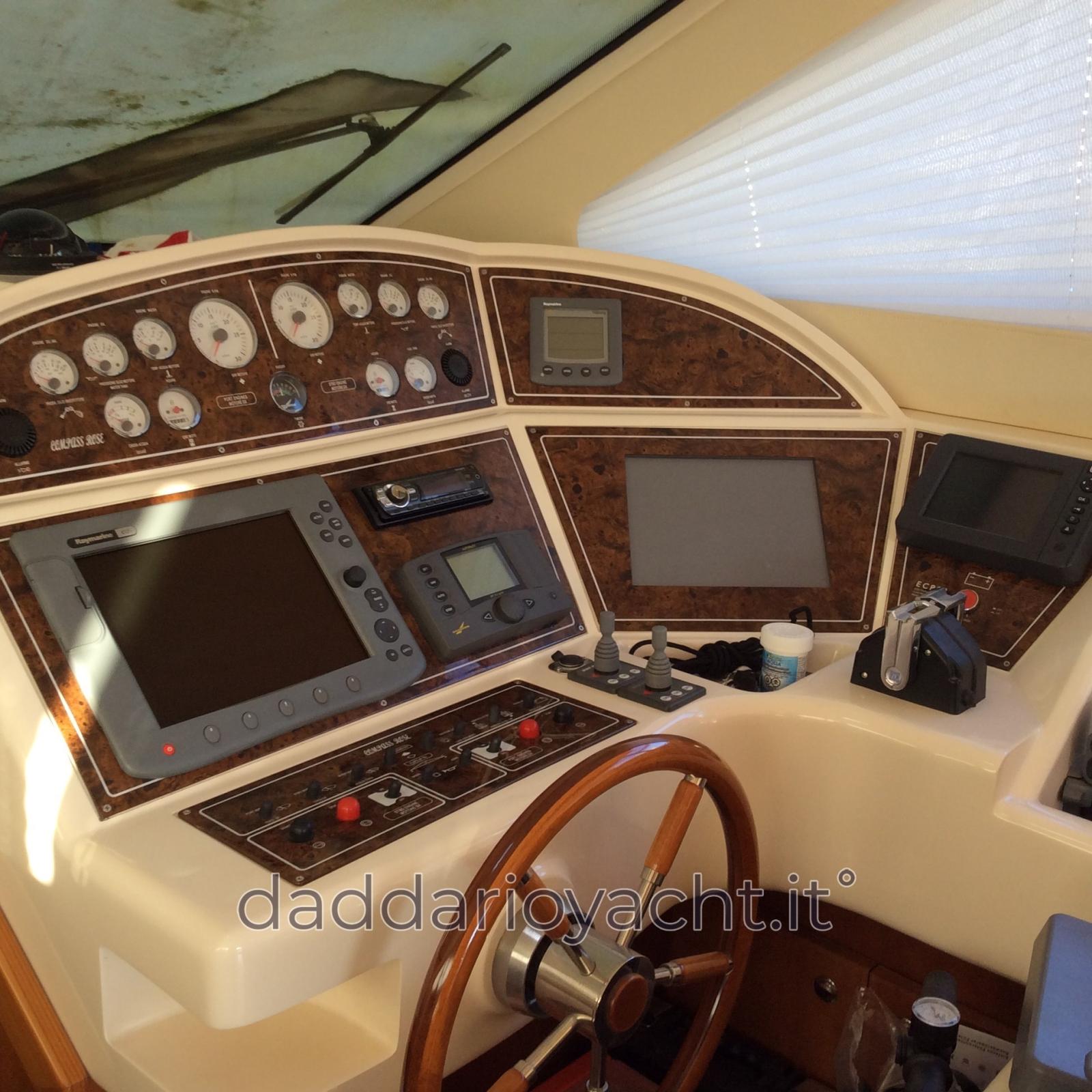 Eau sous pression, Douche de cockpit, Double barre à roue, Flaps hydrauliques (N°2), Passerelle (IDRAULICA CON TELECOMANDO), Plateforme arrière (TEAK), Pompe de cale automatique, Porte latérale, Cockpit en teck, Connexion eau sous pression à quai, Guindeau électrique, Echelle de bain, table de cockpit, Annexe, Corne, Winch électrique arrière.
