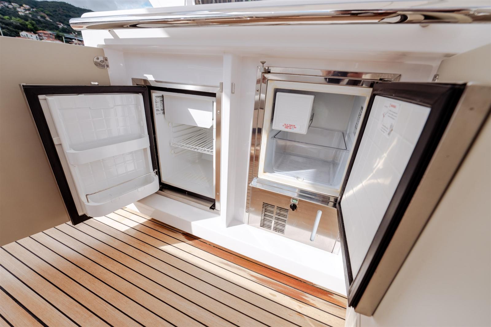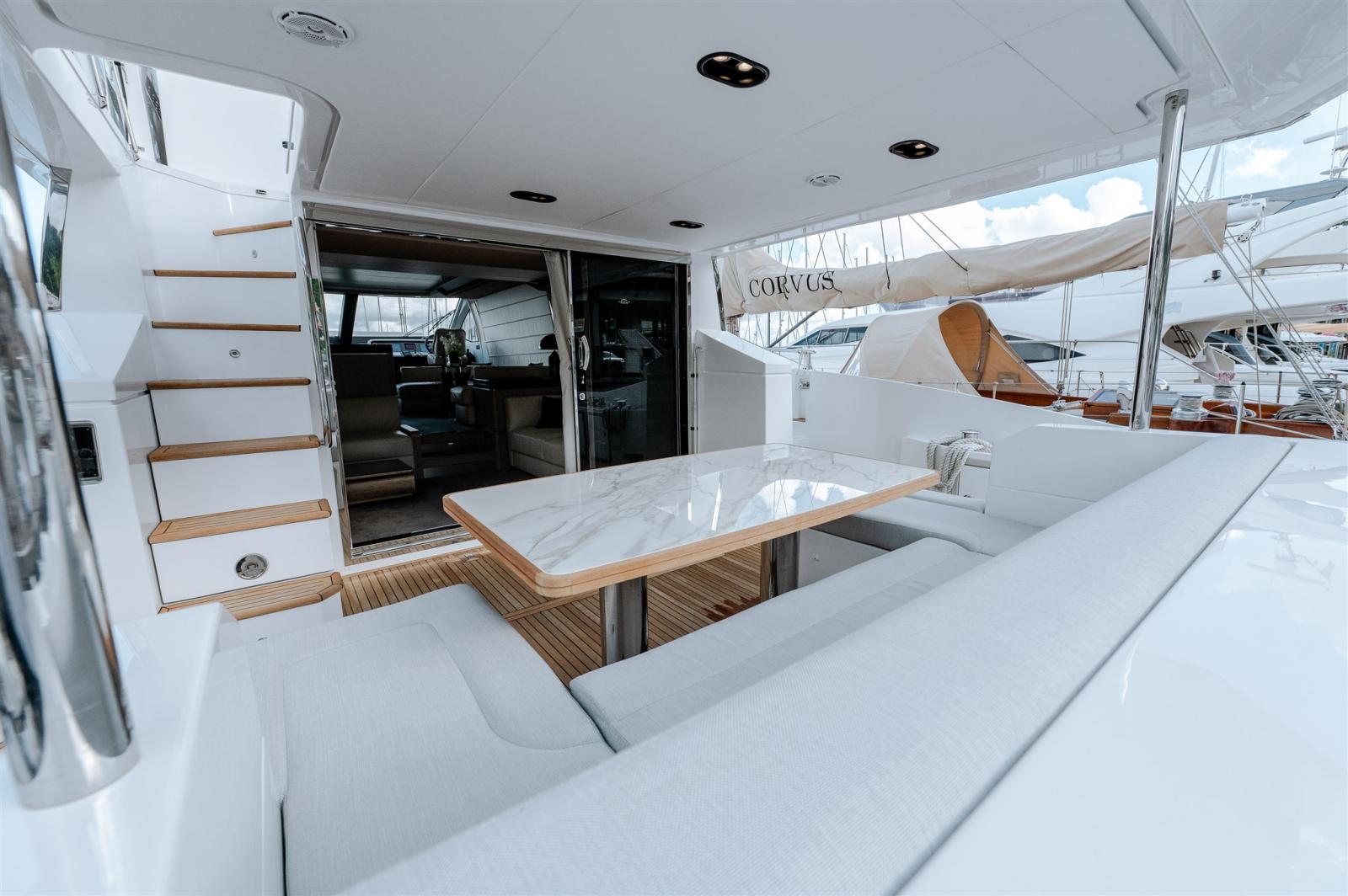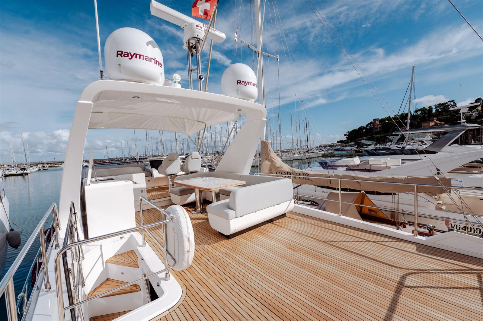 Trim hydraulique, Douche de cockpit, Propulseur de poupe (10kw), Phare de poursuite, Flaps hydrauliques, Extincteur(s) fixe(s) (seafire), Lavage de chaine, Éclairage de courtoisie, Passerelle (telescopic), Plateforme arrière (up down), 2 Porte latérale, Cockpit en teck, Guindeau électrique, Echelle de bain, Selles pour Annexe, table de cockpit (and table on flybridge with marble insert + bow teak table), Annexe (Williams 285 Turbojet - 46 hours), 2 Winch électrique avant.