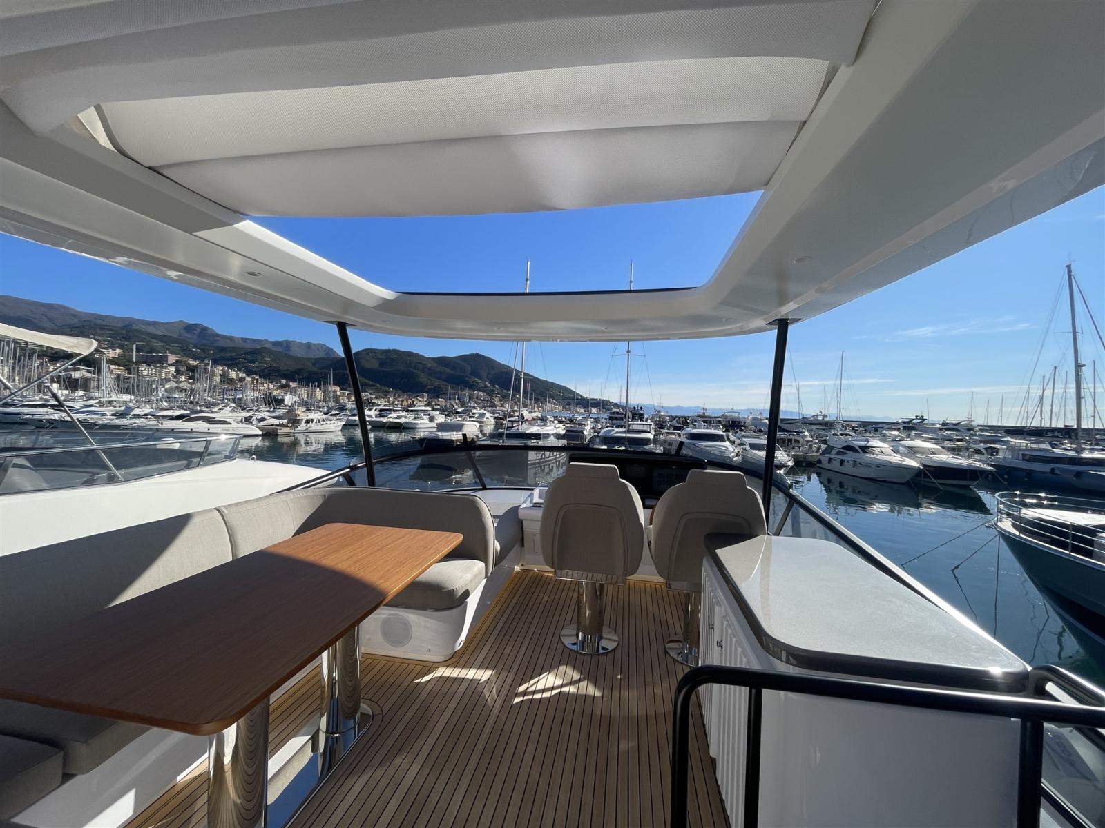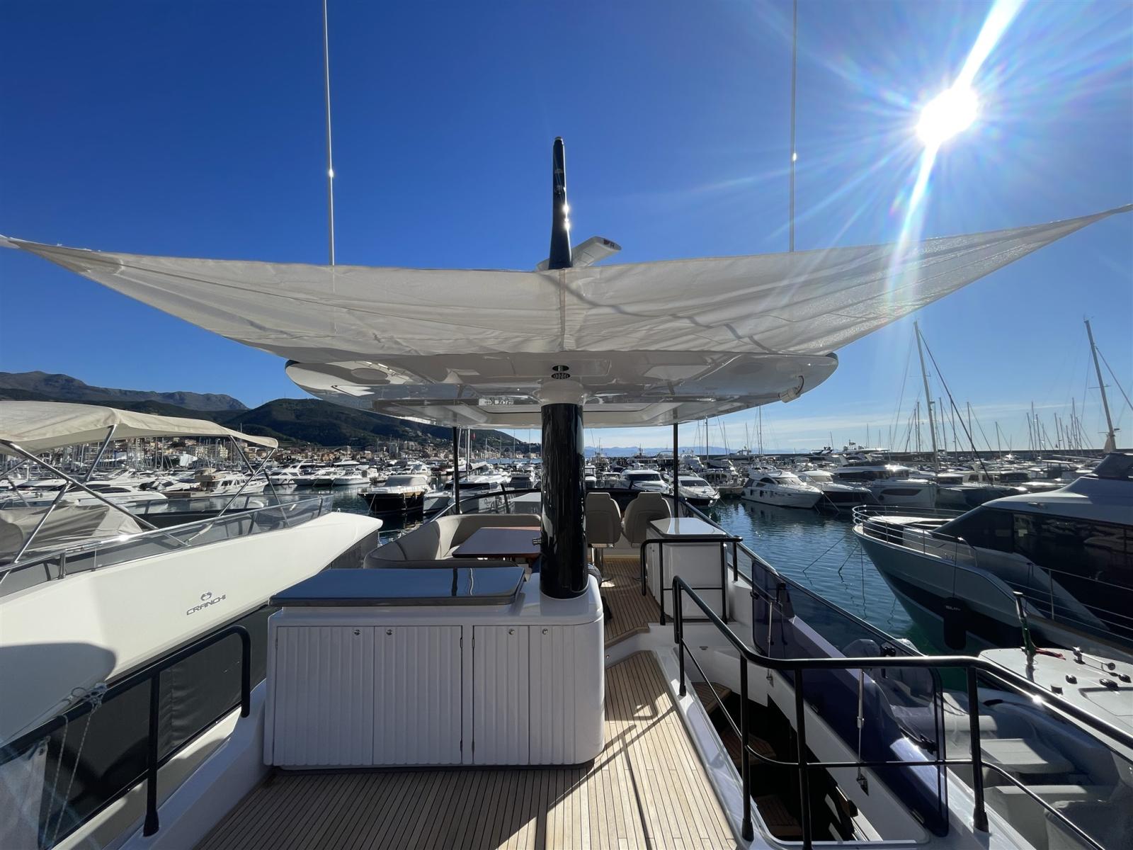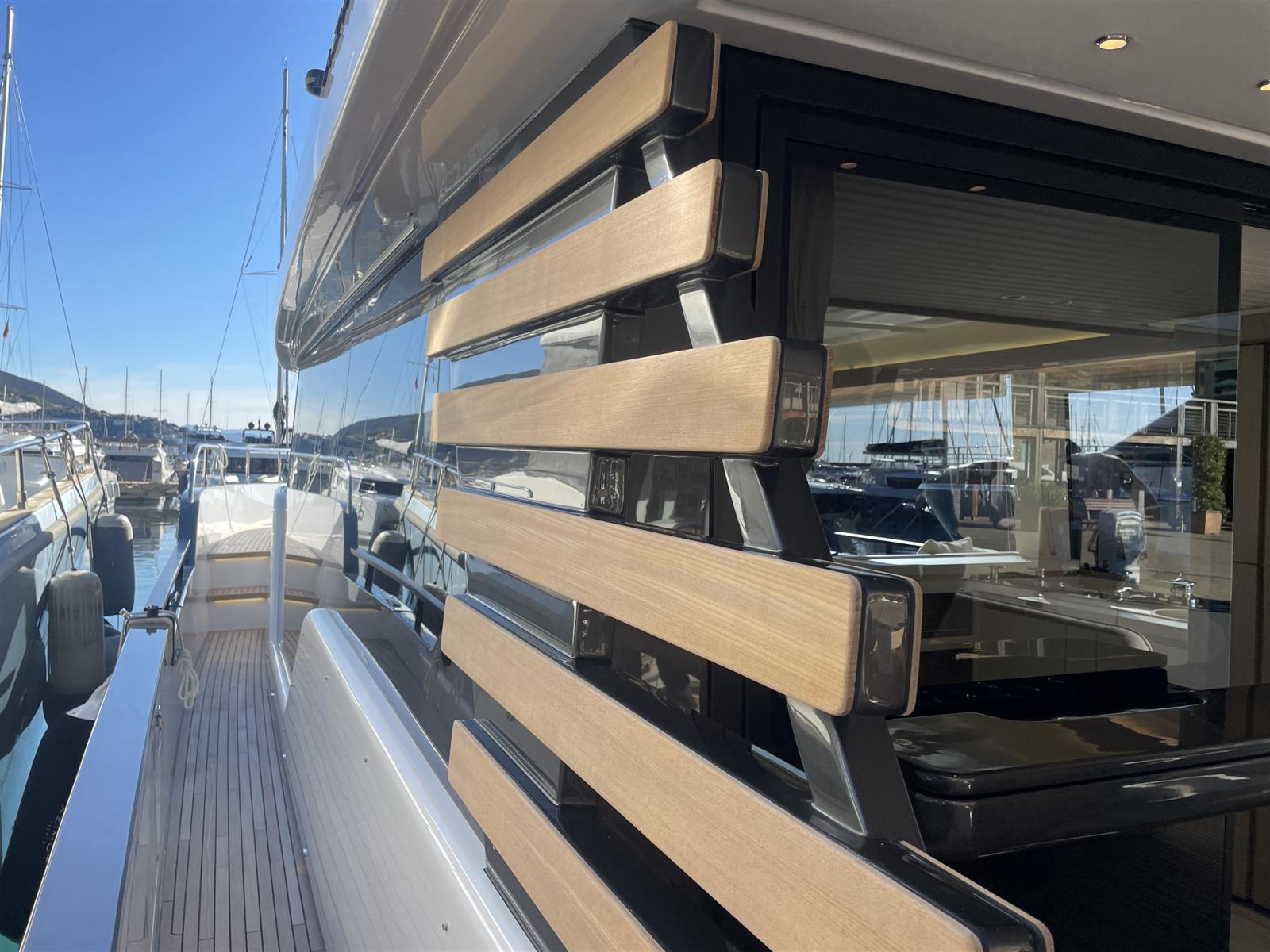 Taquets pliants (Mid ship cleats (N.2), Pop-up cleats on transom (Nr.4)), Passavant en teck, Couleur spéciale (hull in grey Thames Met and upper part of the hard top in Island Volcanic), Douche de cockpit, Double barre à roue (main helm and flybridge), Phare de poursuite (electric), Hard top (with electric awning and painted mast in grey Island Volcanic), Extincteur(s) fixe(s), Éclairage de courtoisie, 2 Spots sous-marins, Passerelle (Telescopic gangway), Plateforme arrière (hi-lo ectrohydraulic), 2 Porte latérale (side gates), Cockpit en teck, Connexion eau sous pression à quai, Guindeau électrique, Echelle de bain, Selles pour Annexe (Rapid Marine Universal chocks), Stabilisateurs (seakeeper NG18), table de cockpit (with hi-lo system in teak), Table pliante de salon (Extendable dinette and two pouffs), Annexe (Pirelli J33), Corne, Pont en teck (+ flybridge), 2 Winch électrique arrière.