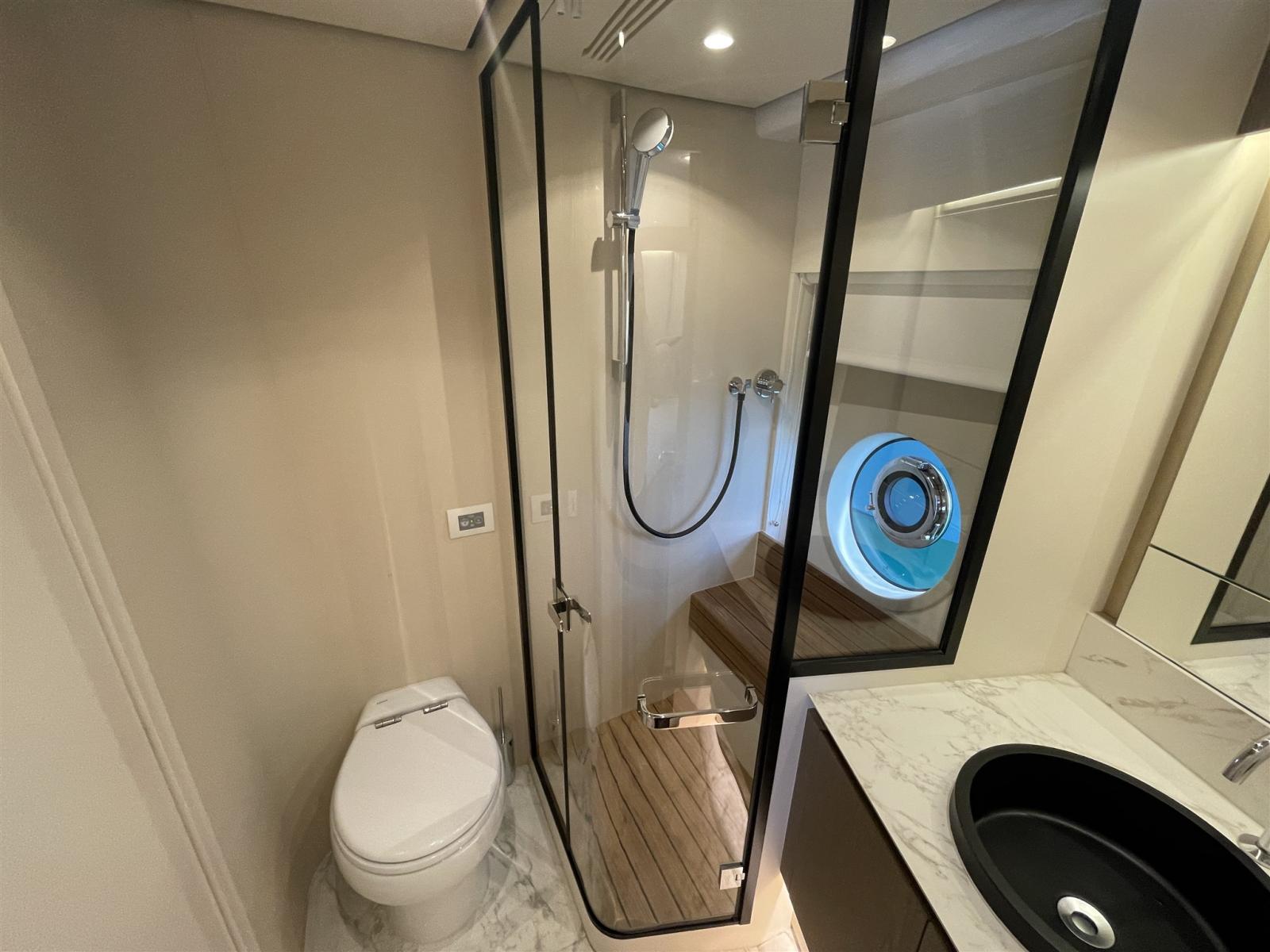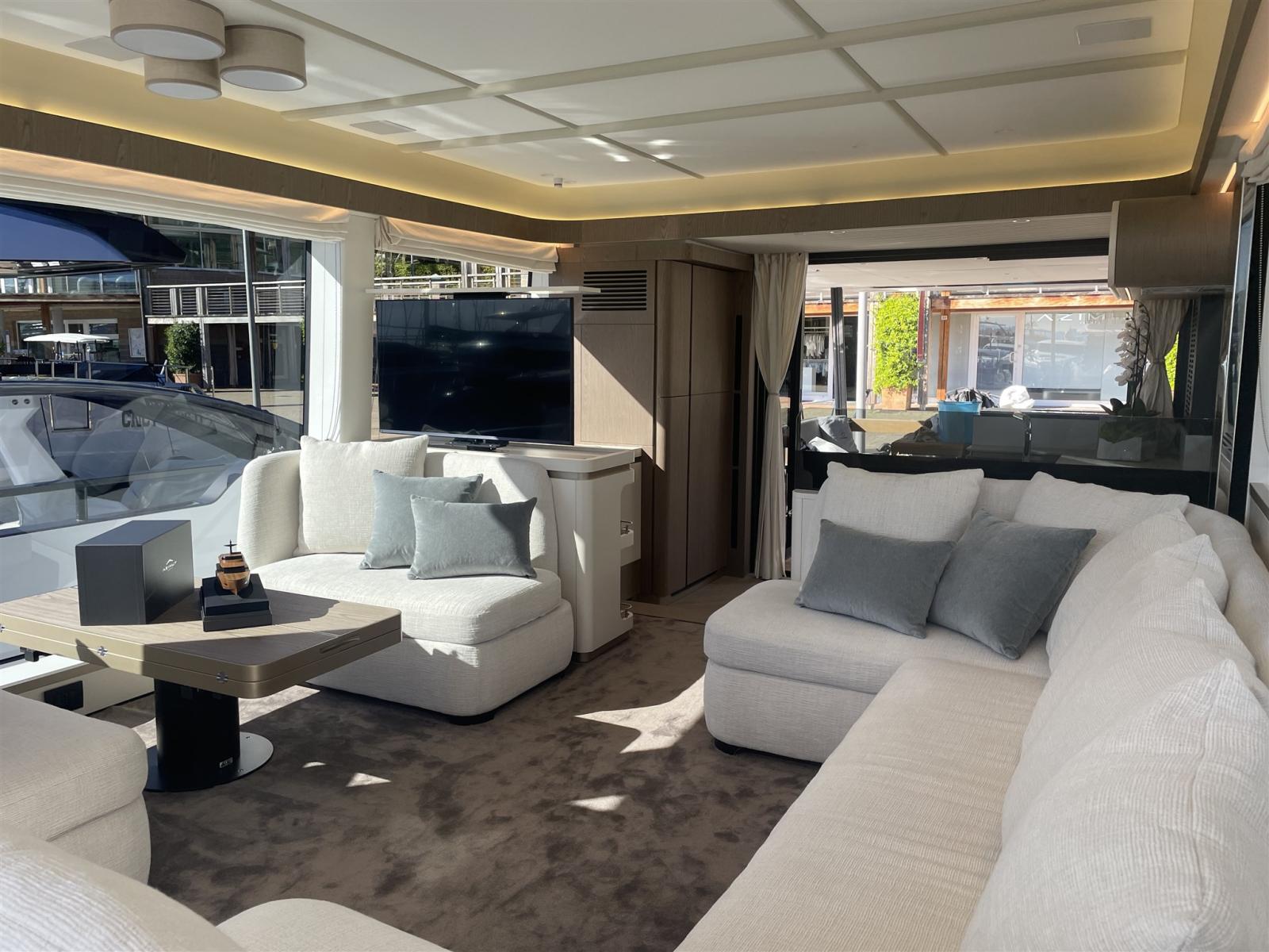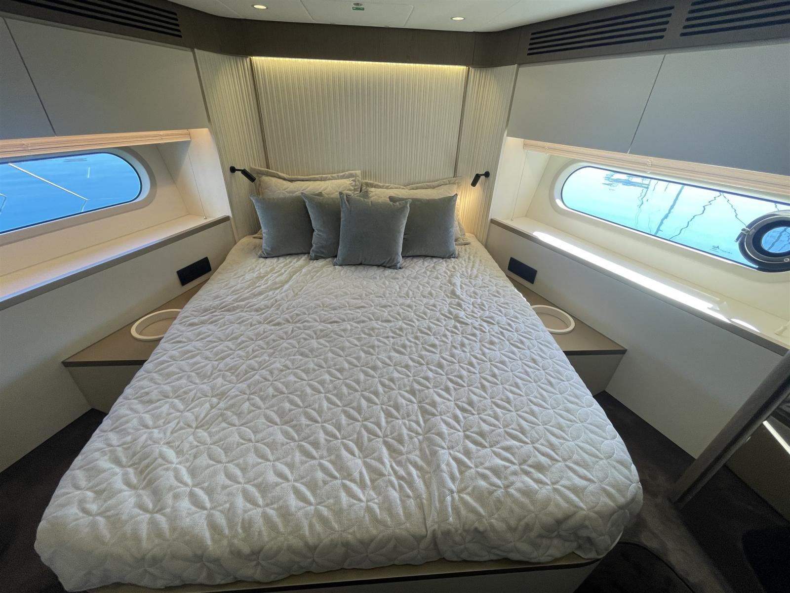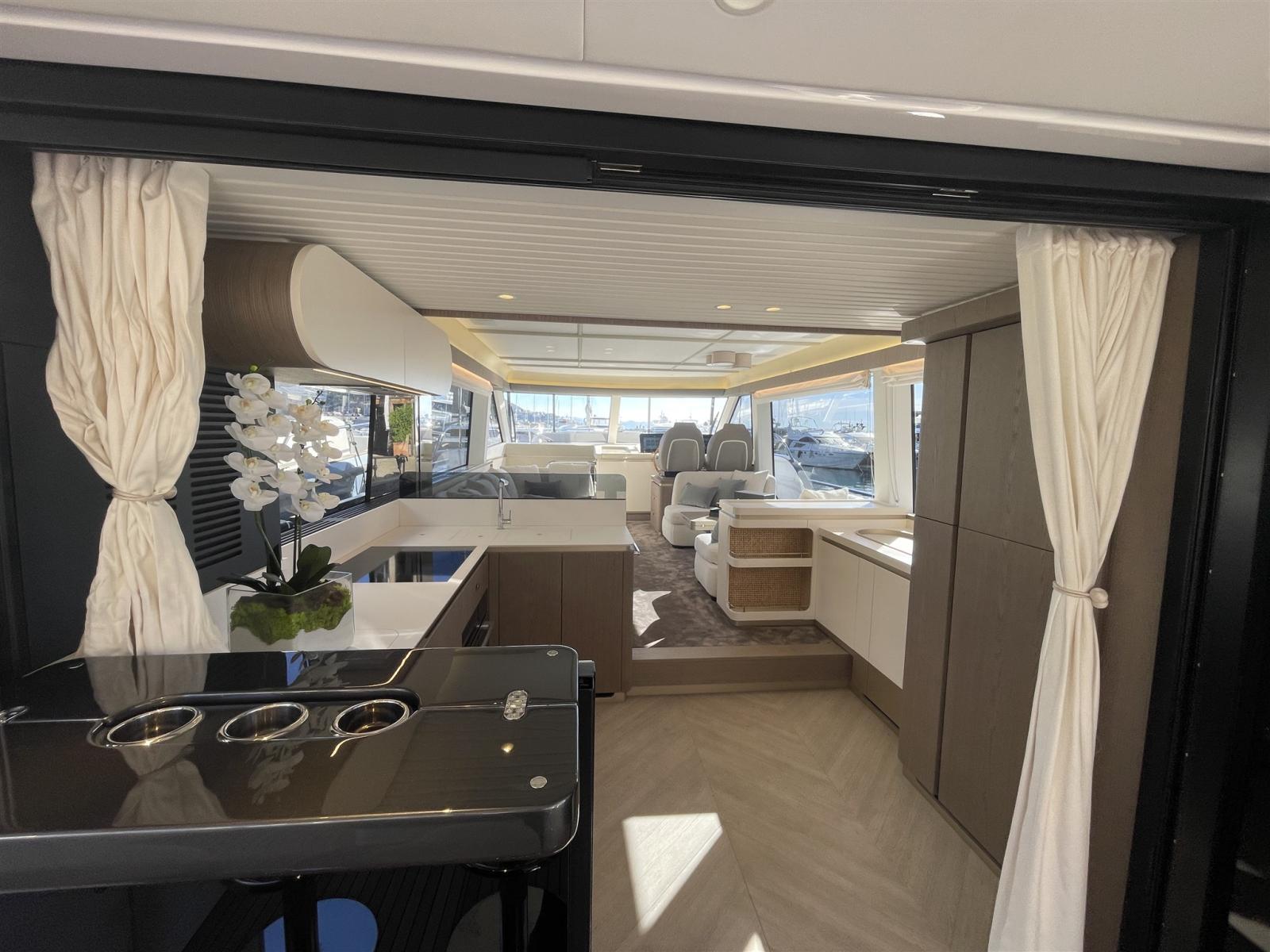 Taquets pliants (Mid ship cleats (N.2), Pop-up cleats on transom (Nr.4)), Passavant en teck, Couleur spéciale (hull in grey Thames Met and upper part of the hard top in Island Volcanic), Douche de cockpit, Double barre à roue (main helm and flybridge), Phare de poursuite (electric), Hard top (with electric awning and painted mast in grey Island Volcanic), Extincteur(s) fixe(s), Éclairage de courtoisie, 2 Spots sous-marins, Passerelle (Telescopic gangway), Plateforme arrière (hi-lo ectrohydraulic), 2 Porte latérale (side gates), Cockpit en teck, Connexion eau sous pression à quai, Guindeau électrique, Echelle de bain, Selles pour Annexe (Rapid Marine Universal chocks), Stabilisateurs (seakeeper NG18), table de cockpit (with hi-lo system in teak), Table pliante de salon (Extendable dinette and two pouffs), Annexe (Pirelli J33), Corne, Pont en teck (+ flybridge), 2 Winch électrique arrière.