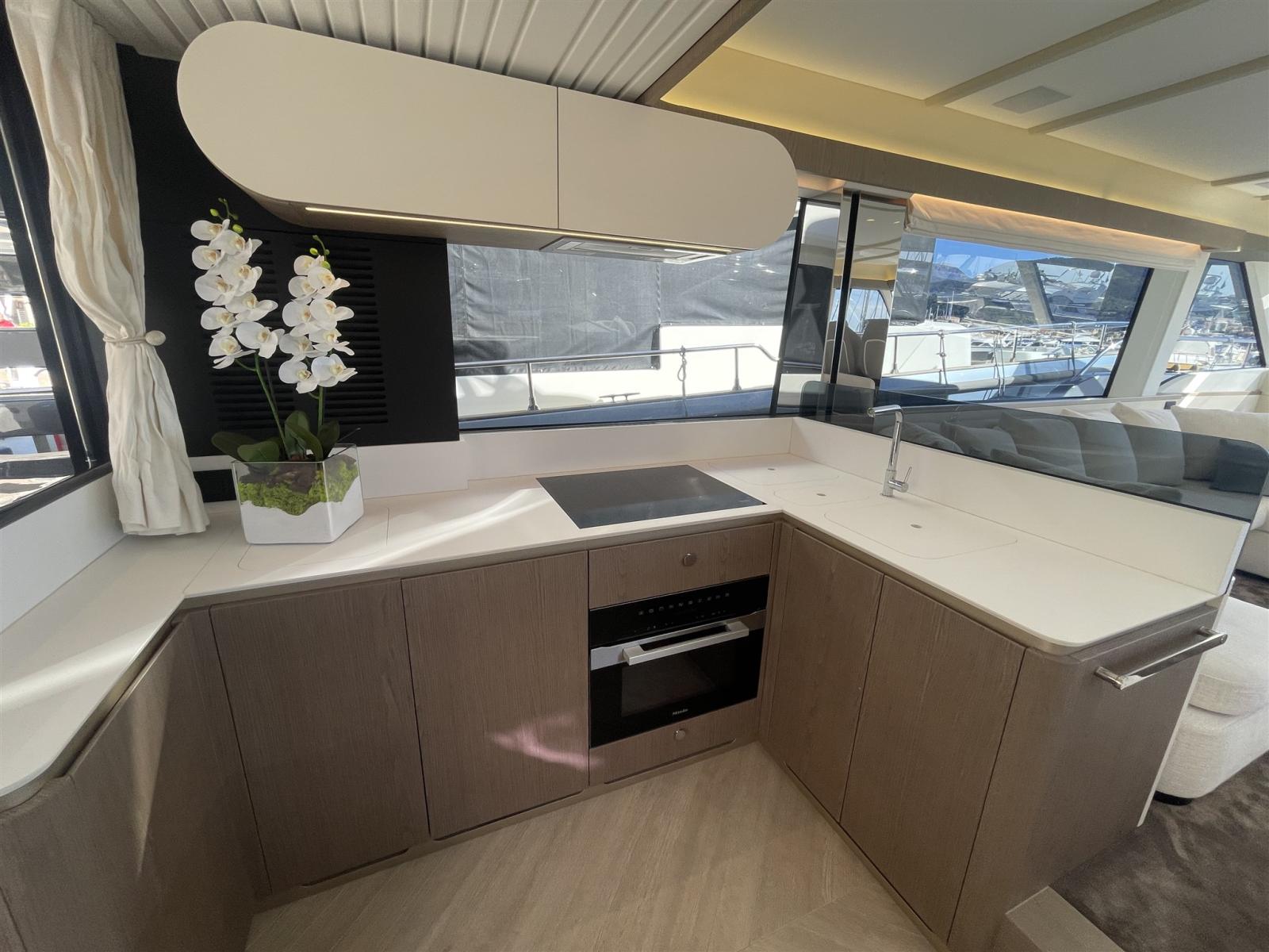 Four (Miele), Réfrigérateur intérieur (+ freezer Miele), Machine à glaçons (for flybridge furniture), Lave et sèche-linge, Lave-vaisselle, Plaque vitrocéramique (Miele), Winecooler (in galley).
