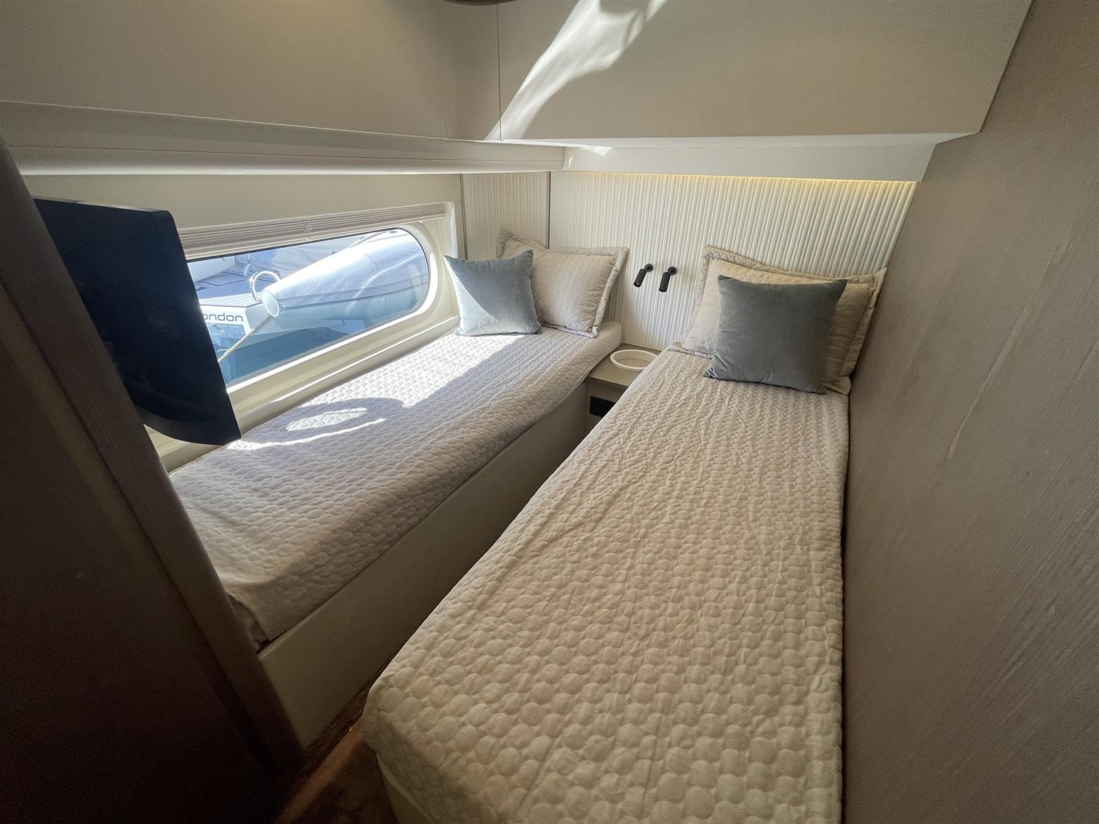 Sellerie complète (in batyline fabric), 3 Tauds de pare-brise, Taud de fly, Taud de console, Taud de siège (all extrior cushons), Taud électrique (Privacy awning in cockpit), 2 Taud de soleil (Sun shade sail on aft fly and on bow with removable carbon fiber poles), Moustiquaires (for portholes).