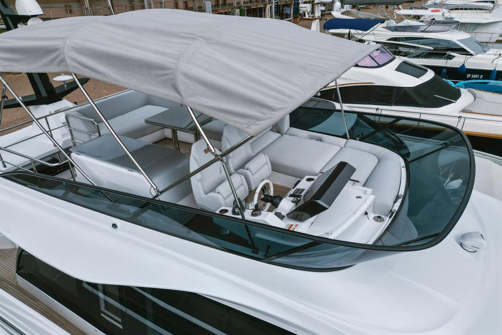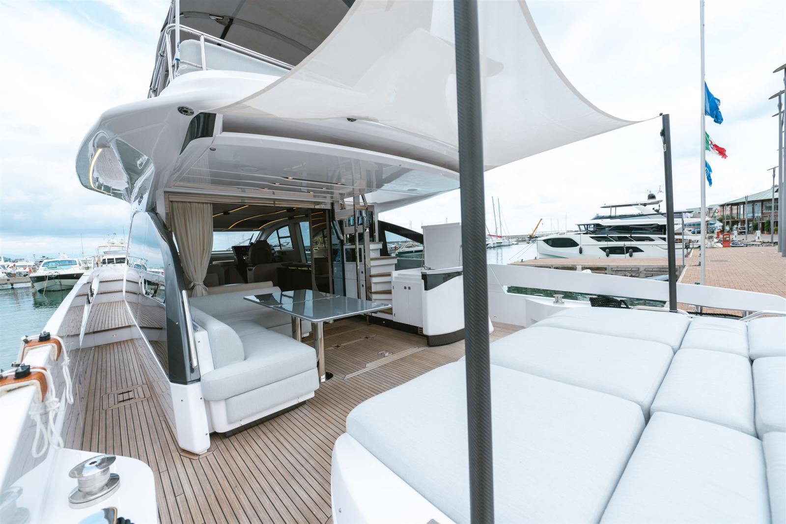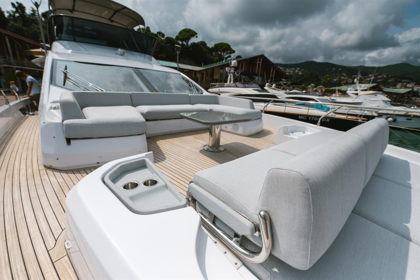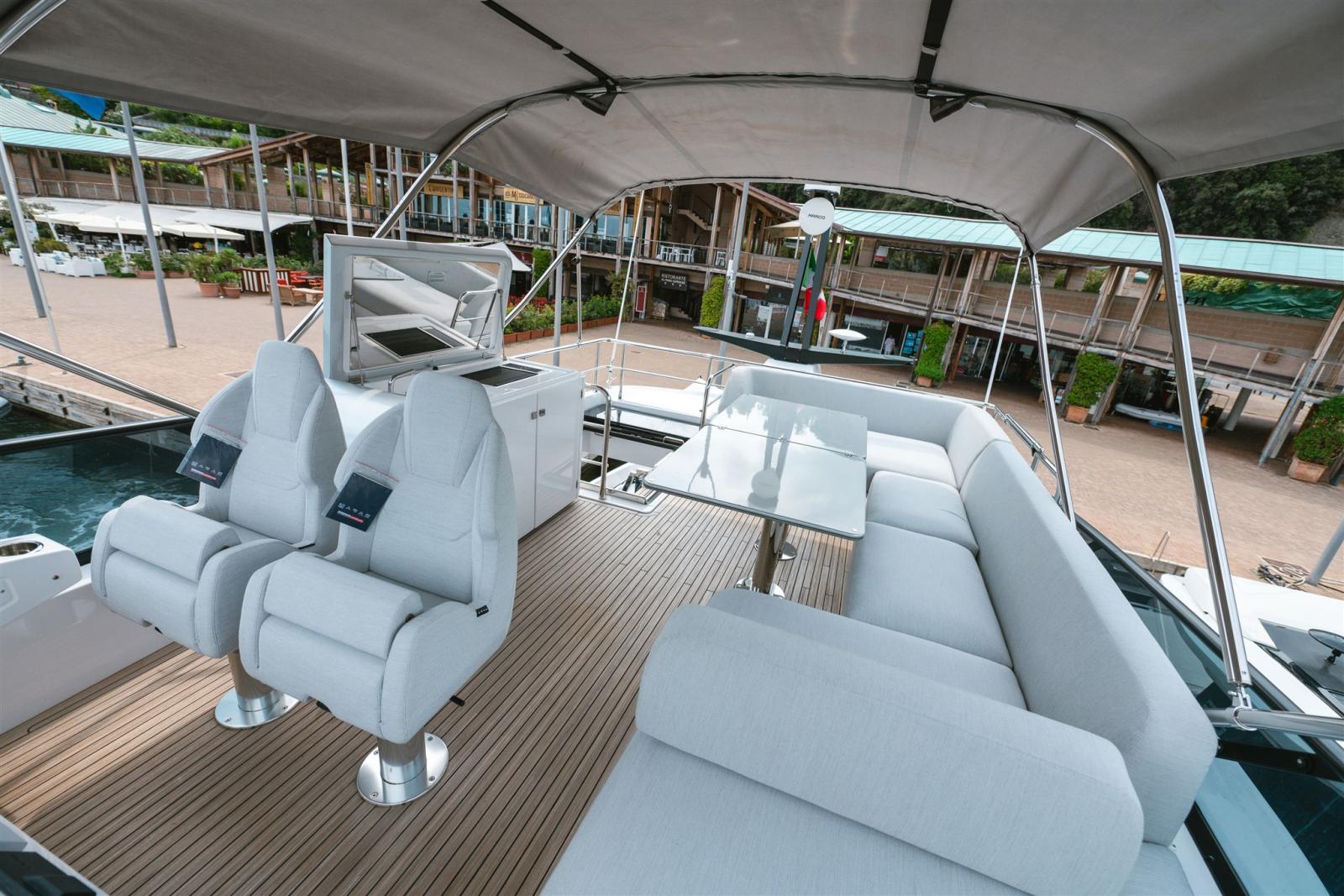 Passavant en teck (+ bow, stern + fly), Douche de cockpit, Double barre à roue, Phare de poursuite, Garage à annexe (+ hauling launching system for tender and jetski), Lavabo dans le cockpit, Éclairage de courtoisie, 2 Spots sous-marins, Passerelle, Plateforme arrière, Porte latérale, Cockpit en teck, Echelle de bain, Stabilisateurs (Seakeeper NG18), table de cockpit (carbon look).