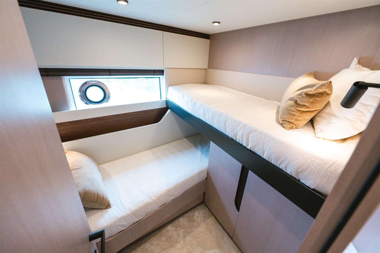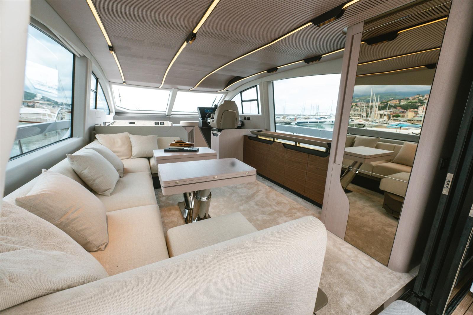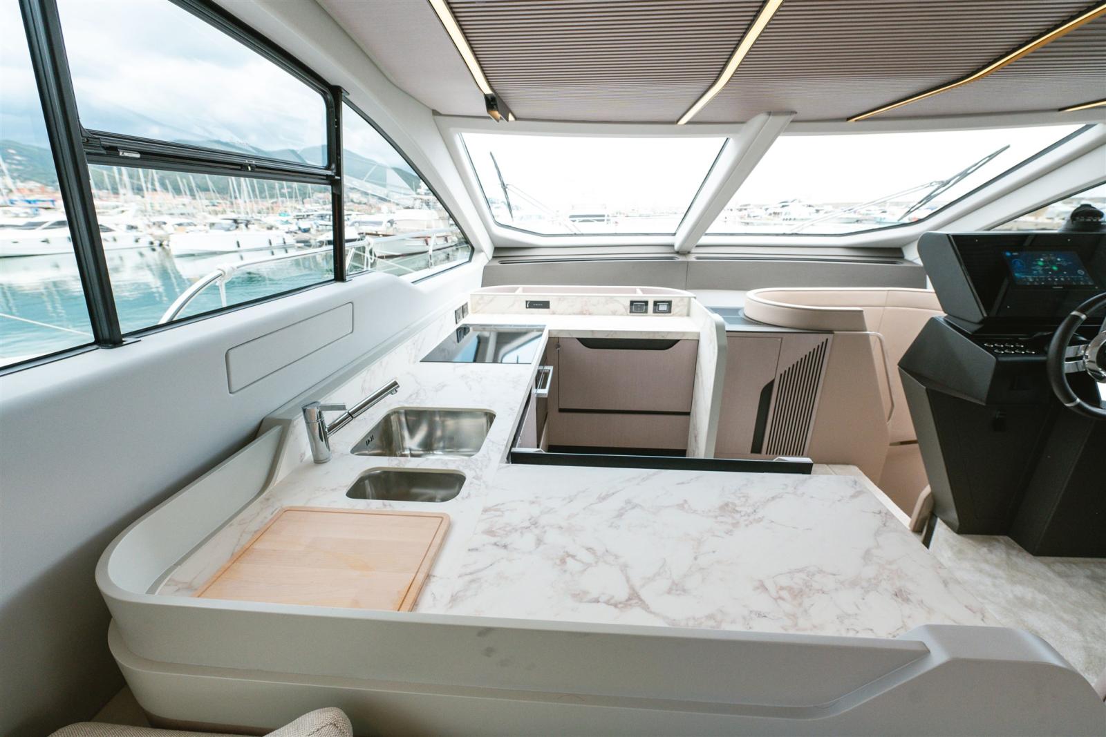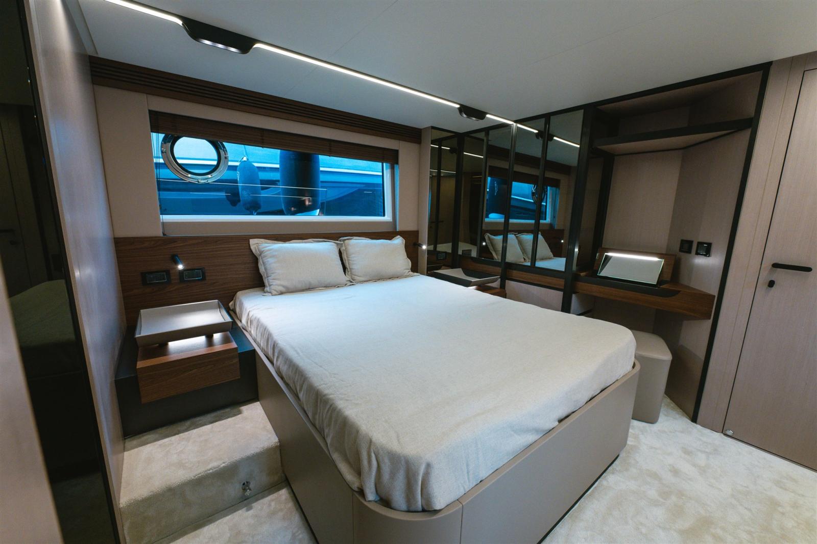 Passavant en teck (+ bow, stern + fly), Douche de cockpit, Double barre à roue, Phare de poursuite, Garage à annexe (+ hauling launching system for tender and jetski), Lavabo dans le cockpit, Éclairage de courtoisie, 2 Spots sous-marins, Passerelle, Plateforme arrière, Porte latérale, Cockpit en teck, Echelle de bain, Stabilisateurs (Seakeeper NG18), table de cockpit (carbon look).