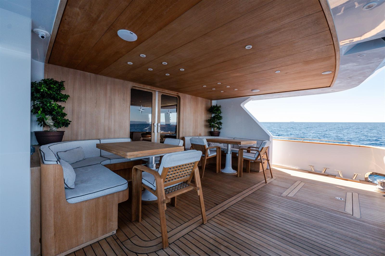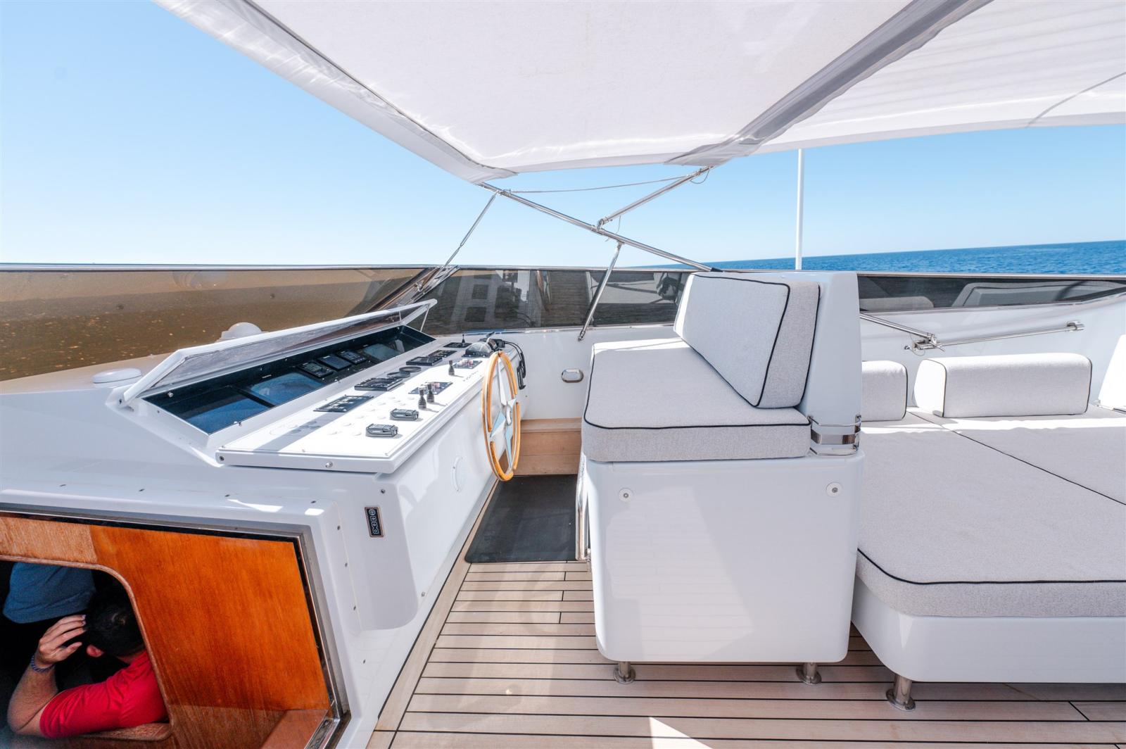 Le pont le plus haut est le flybridge : il mesure plus de 50 mètres carrés et comprend une deuxième zone de contrôle, une grande dinette entourée de canapés et de fauteuils et un solarium supplémentaire et, dans la partie arrière, une zone de service aménagée avec une grue et réservée à l’abri des annexes et des jet-skis.