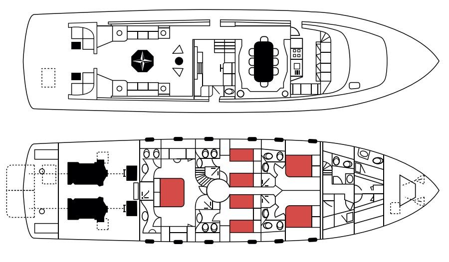 Sous le pont, tout a été conçu pour assurer un maximum de confort aux invités à bord. L’aménagement du pont inférieur, entièrement recouvert de teck sablé et de moquette, est très rationnel et prévoit une grande cabine propriétaire avec des armoires, des meubles et un bureau sur la poutre maximale ; la salle de bain dispose d’un double accès avec une douche au centre, ainsi que d’une belle vasque avec compartiments et poufs.