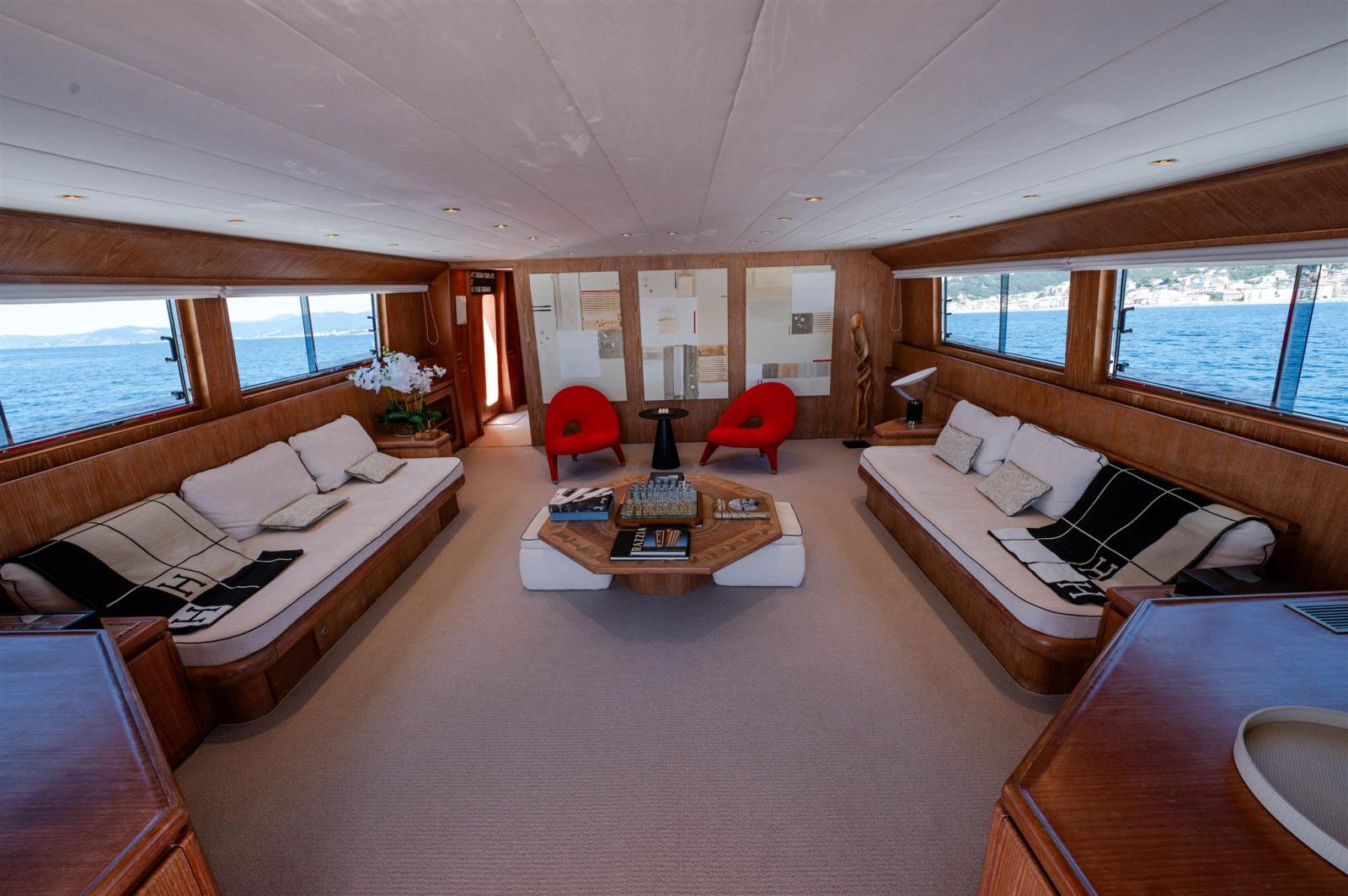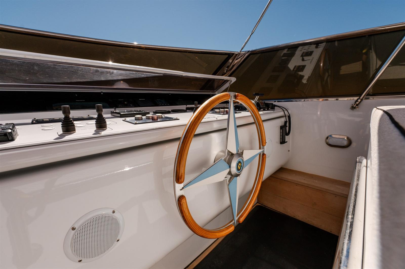 Passavant en teck, Douche de cockpit, Double barre à roue, Propulseur d'étrave (HYDRO SYSTEM 85 cv), Phare de poursuite, Flaps hydrauliques, Grue de flybridge, Extincteur(s) fixe(s), Éclairage de courtoisie, Spots sous-marins, Passerelle, Plateforme arrière, Porte latérale, Cockpit en teck (+ teak fly), Echelle de bain, Stabilisateurs (fins CMC MARINE srl type SE 060-120HS ZERO SPEED), 2 table de cockpit, Corne, 2 Winch électrique arrière.