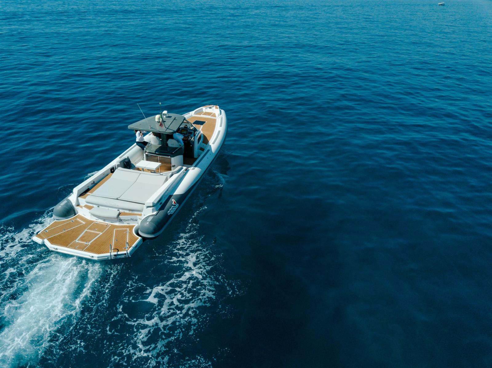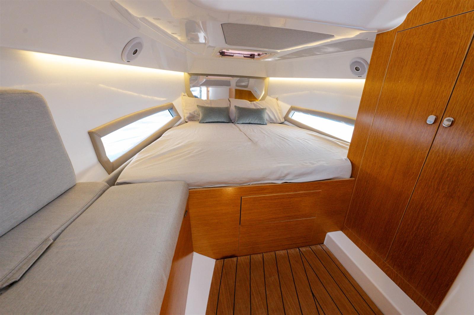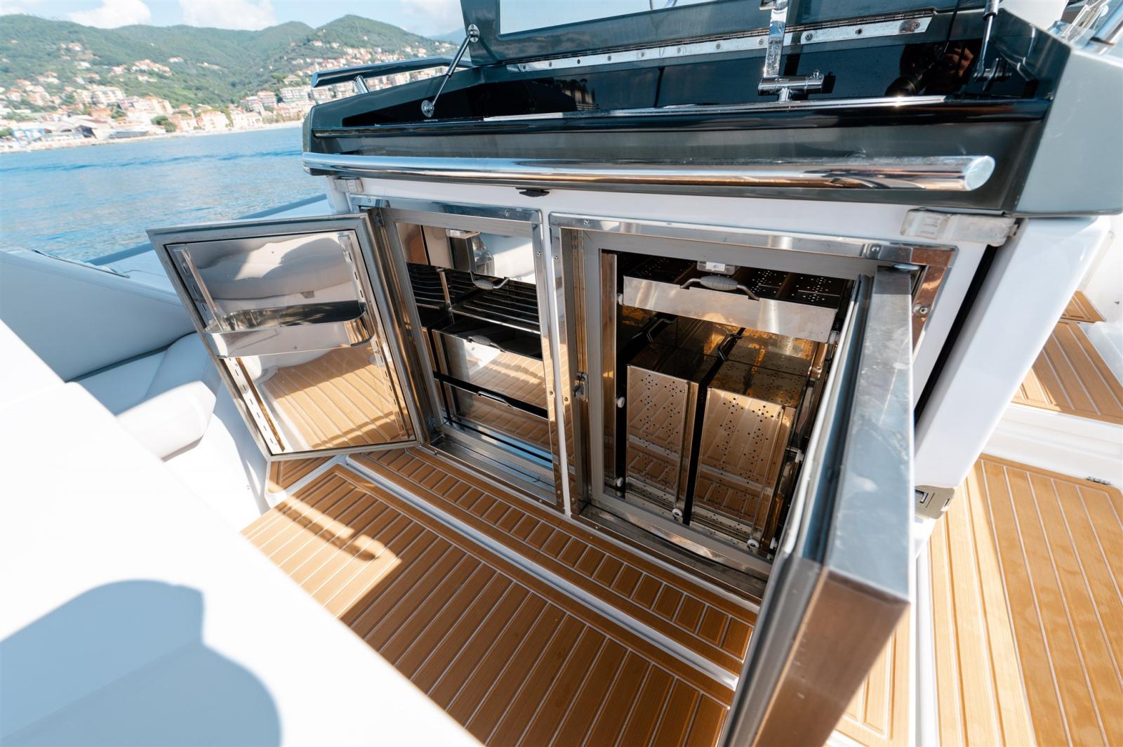 Ouverture du compartiment moteur électrique (electrohydraulic pistons), Passavant en teck, Douche de cockpit, Phare de poursuite, Extincteur(s) fixe(s), Éclairage de courtoisie, Spots sous-marins, Cockpit en teck, Prise de quai, Connexion eau sous pression à quai, Echelle de bain, Table (teak), Corne.