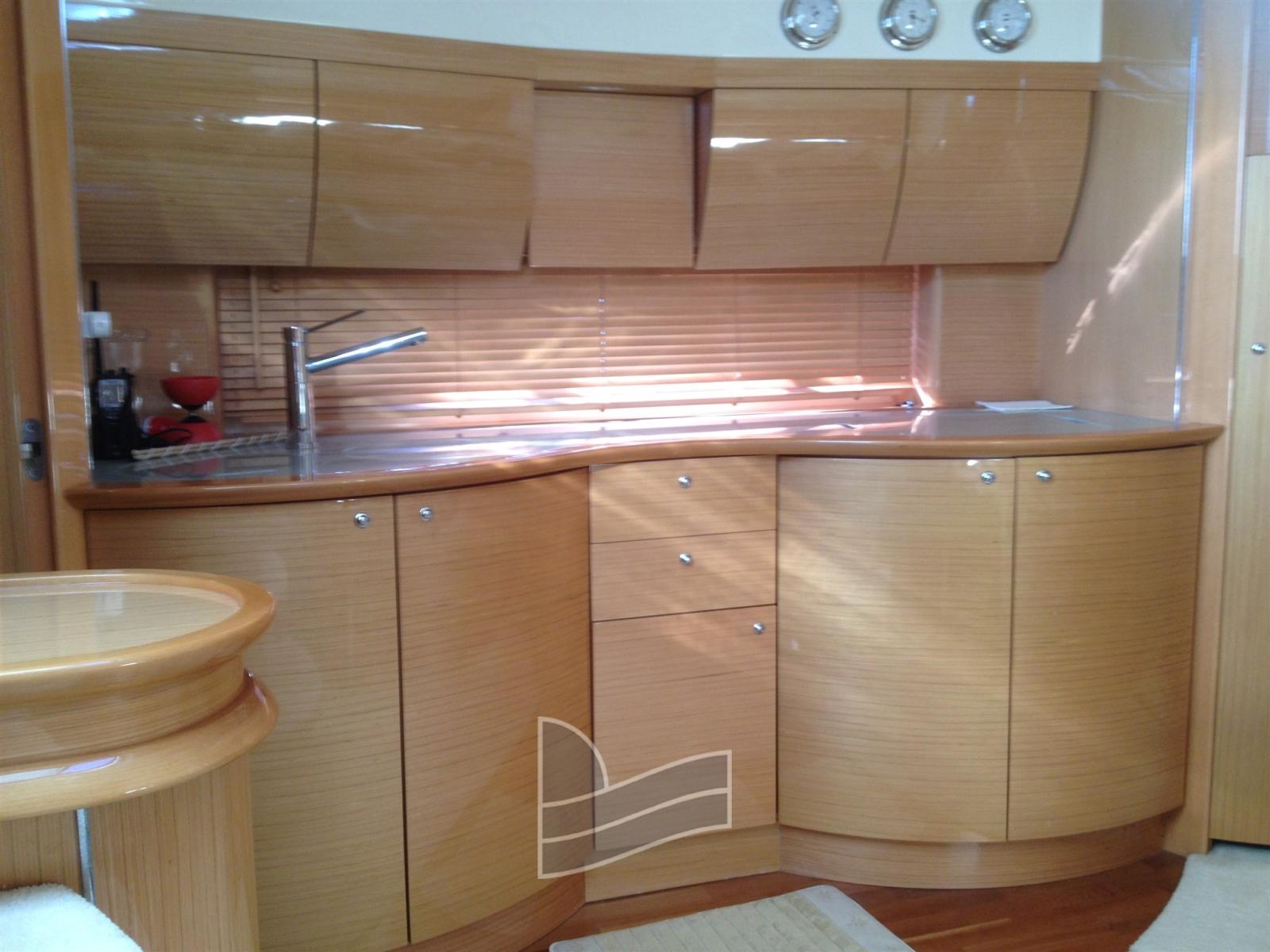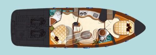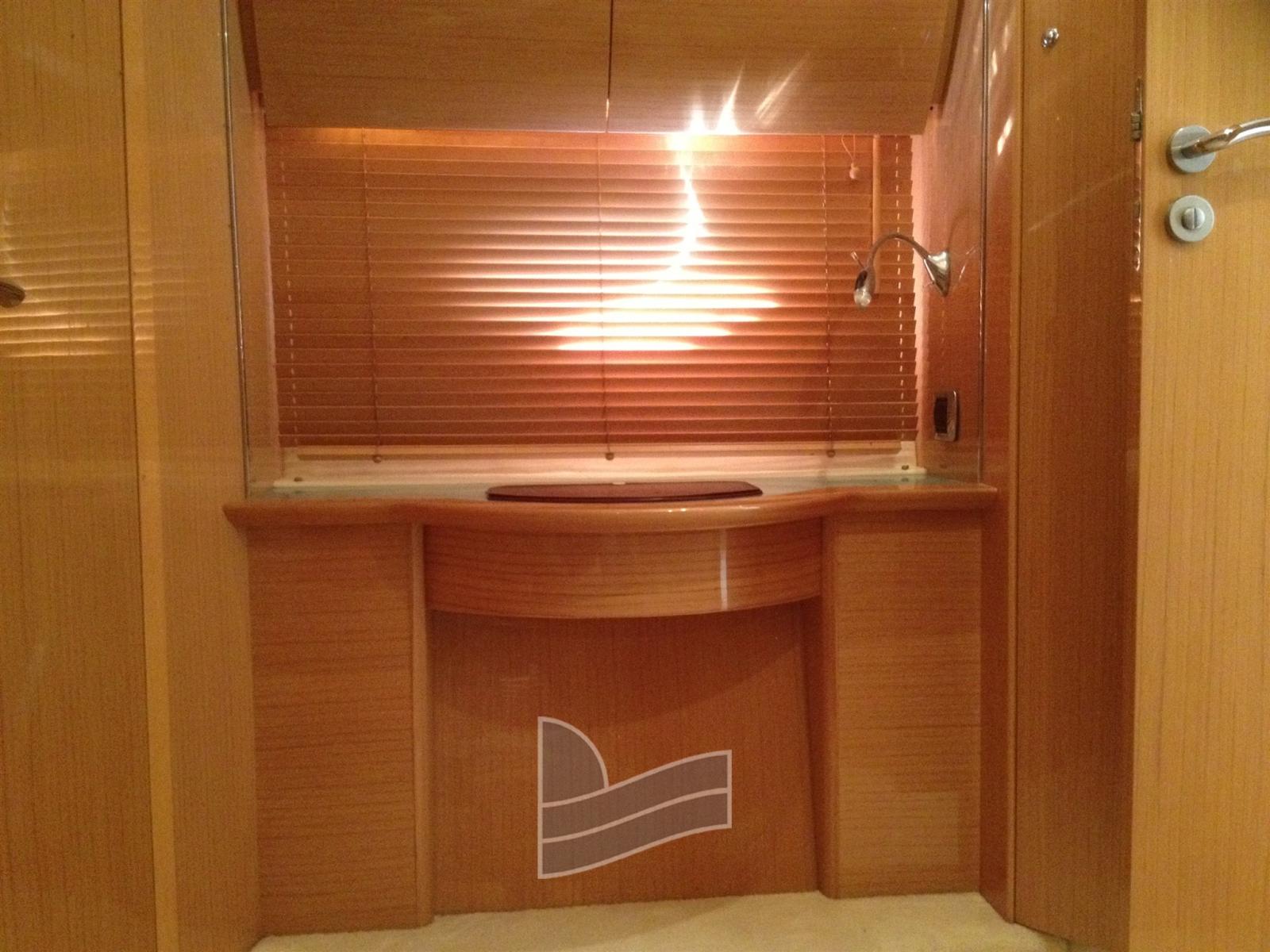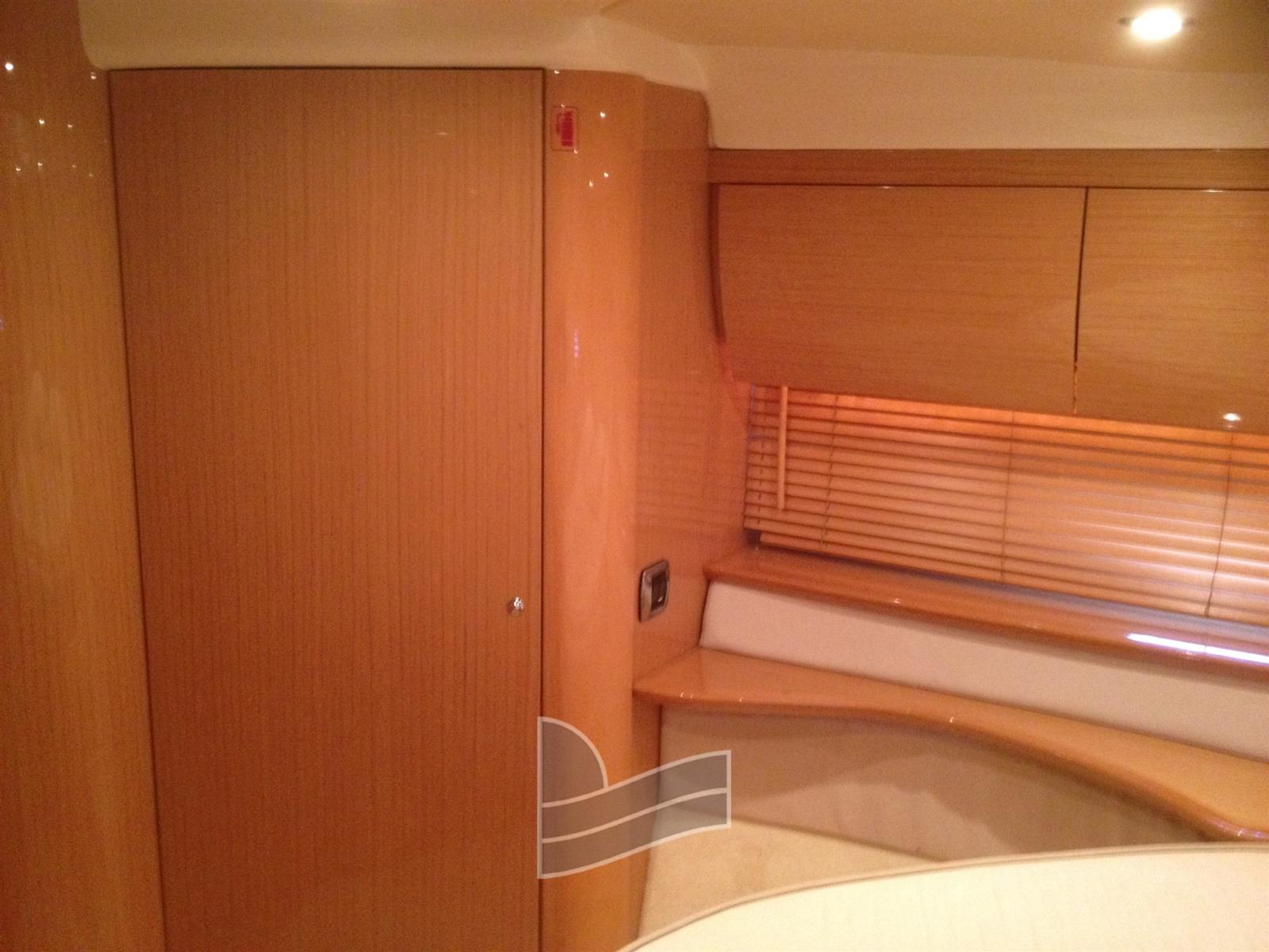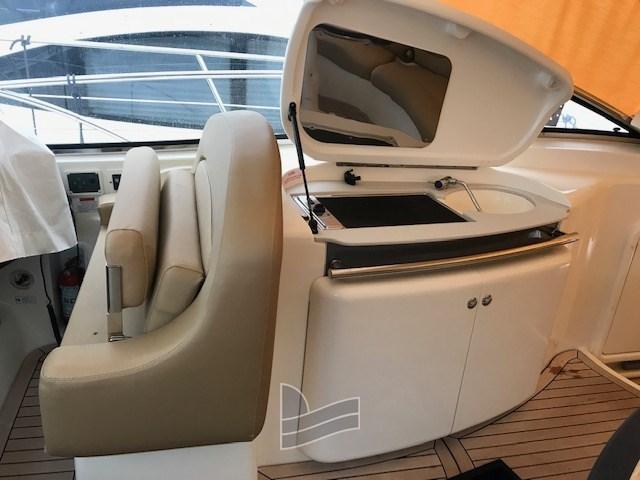 Alarme moteur, Eau sous pression, Douche de cockpit, 2 Flaps hydrauliques, Garage à annexe, Hard top, Passerelle (a scomparsa), Plateforme arrière, Pompe de cale automatique, Cockpit en teck, Prise de quai, Guindeau électrique, Echelle de bain, table de cockpit.