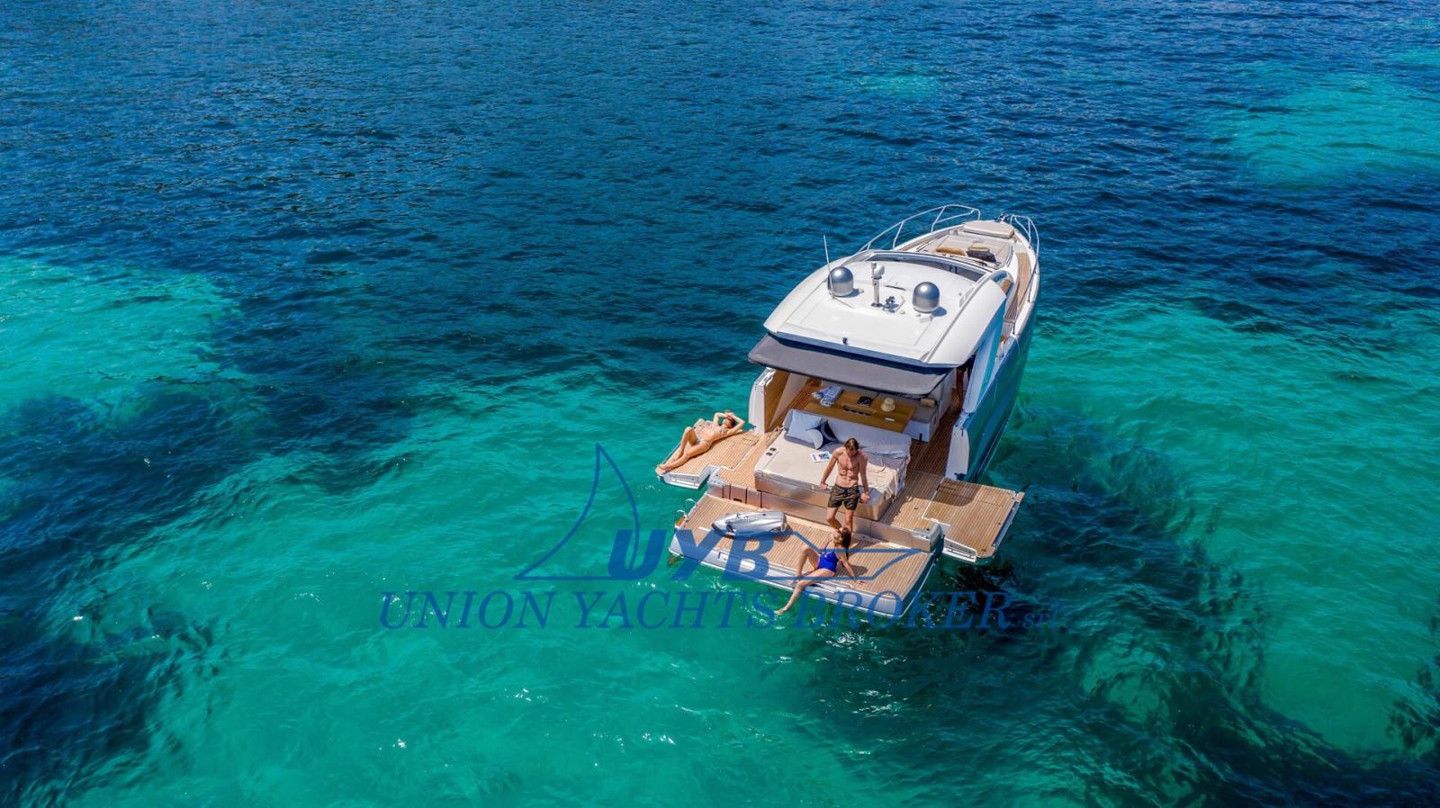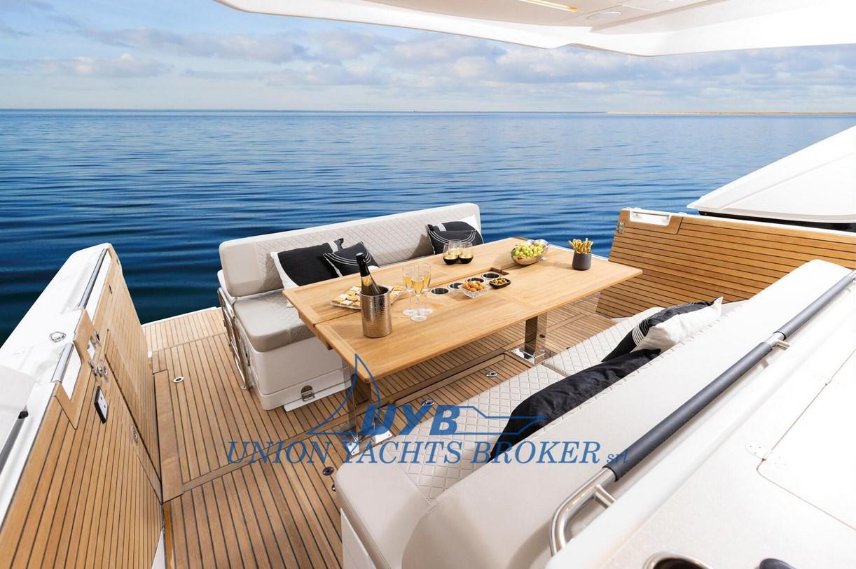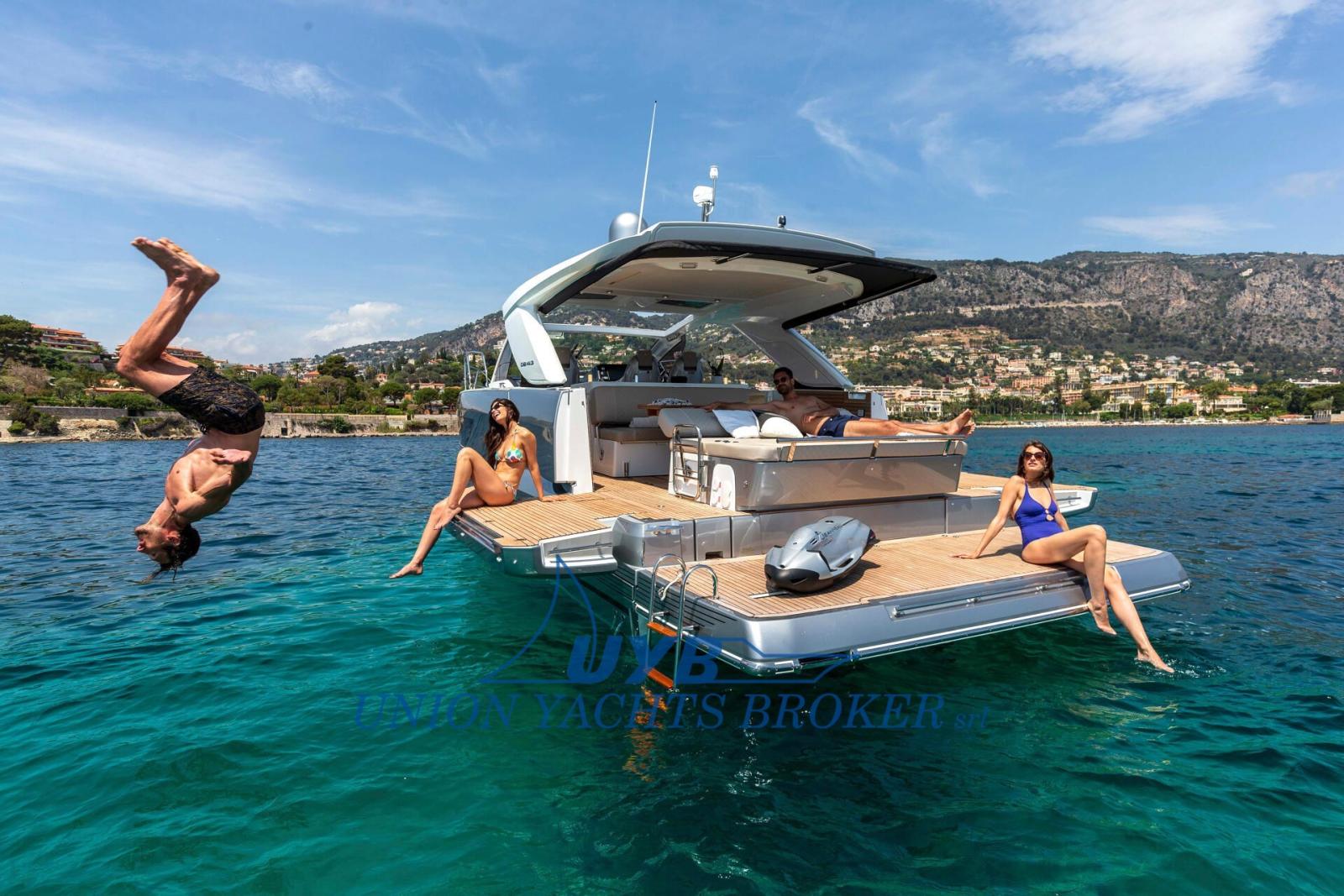 Batteries (+ batterie supplementari), Passavant en teck, Douche de cockpit, Flaps électriques (Zipwake 600), Hard top (scorrevole elettrico), Plateforme arrière (idraulica), Pompe de cale automatique, Porte latérale, Cockpit en teck, Prise de quai, Connexion eau sous pression à quai, Guindeau électrique, Echelle de bain, table de cockpit.