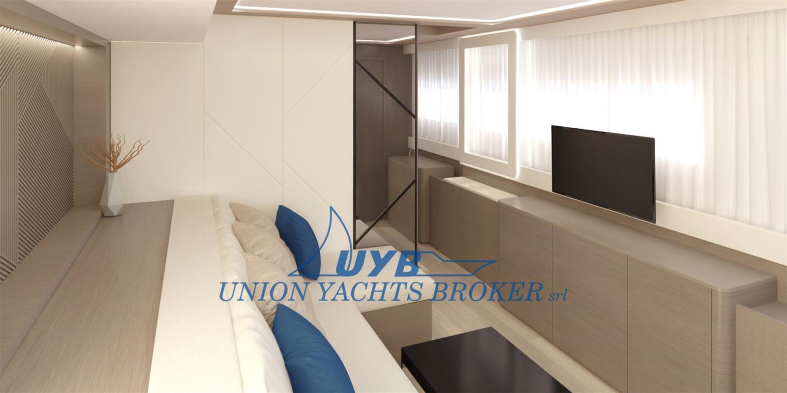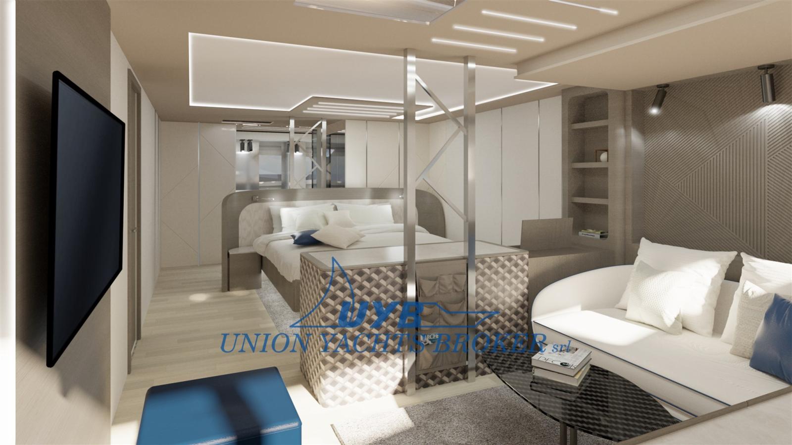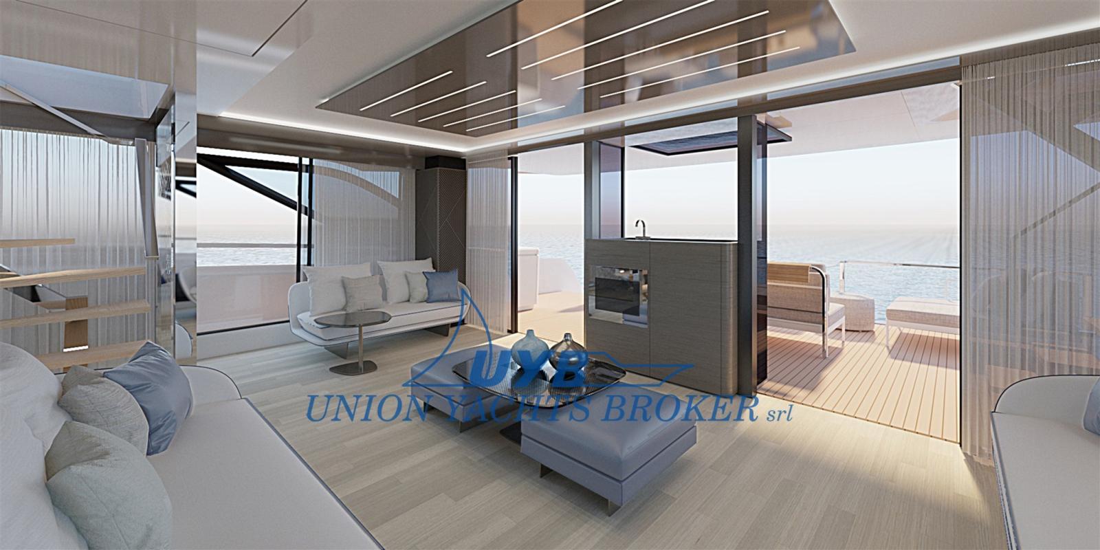 Couleur spéciale (verniciatura sulla parte anteriore del fly), Douche de cockpit, Double barre à roue, Hard top (fly con apertura elettrica softop), Spots sous-marins, Passerelle (Opacmare), Plateforme arrière (Opacmare Transformer 500Kg multifunzione), 8 Pompe de cale automatique, Prise de quai, Guindeau électrique, table de cockpit.