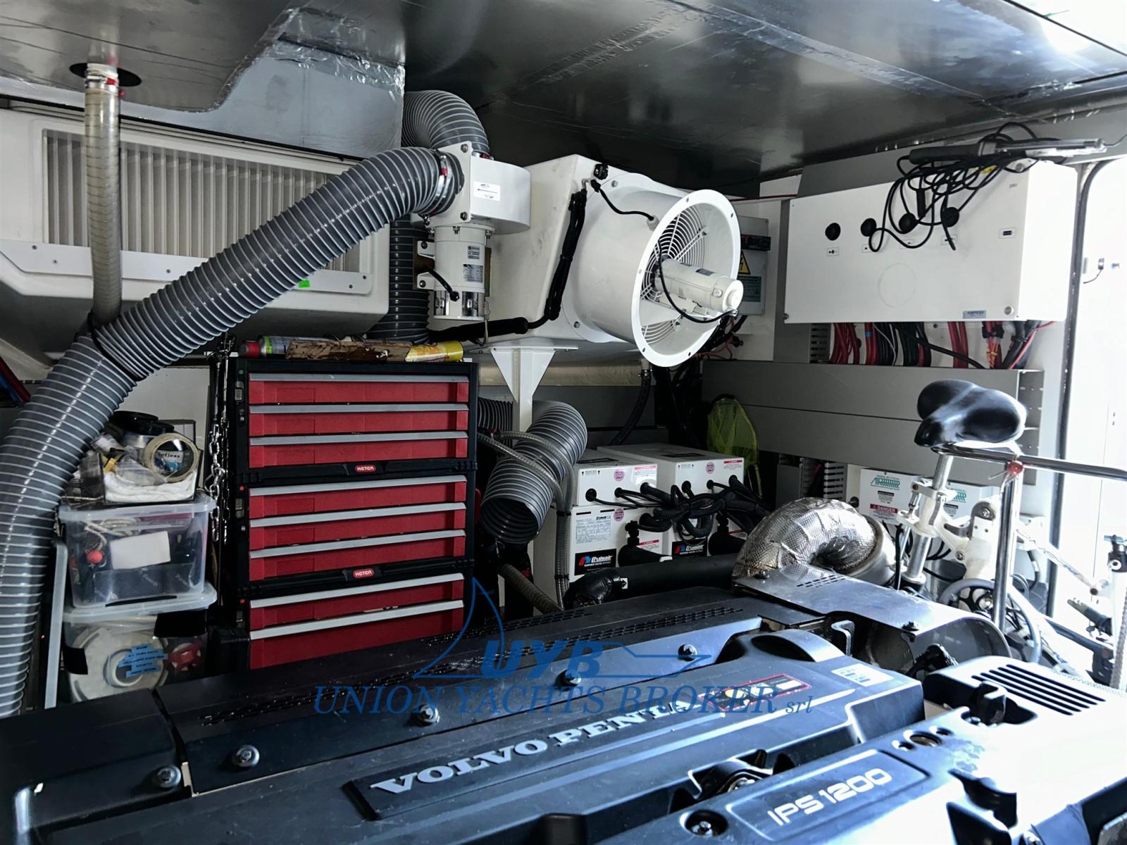 Air conditionné (86.000 BTU), BBQ/ Grill (Fly), Ballon d'eau chaude, Air Conditionné, Cuve à eaux noires, Prises interieures 12v, Prises interieures 220v, Réservoir d'eau noire, Caméra vidéo (Fly + sala macchine), 4 Toilettes électriques.