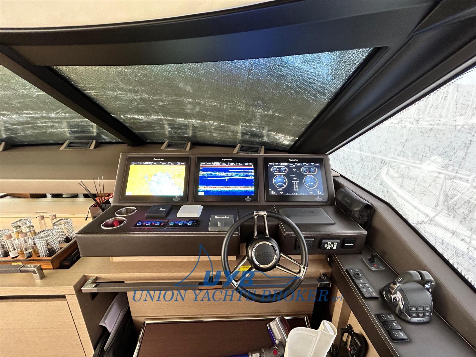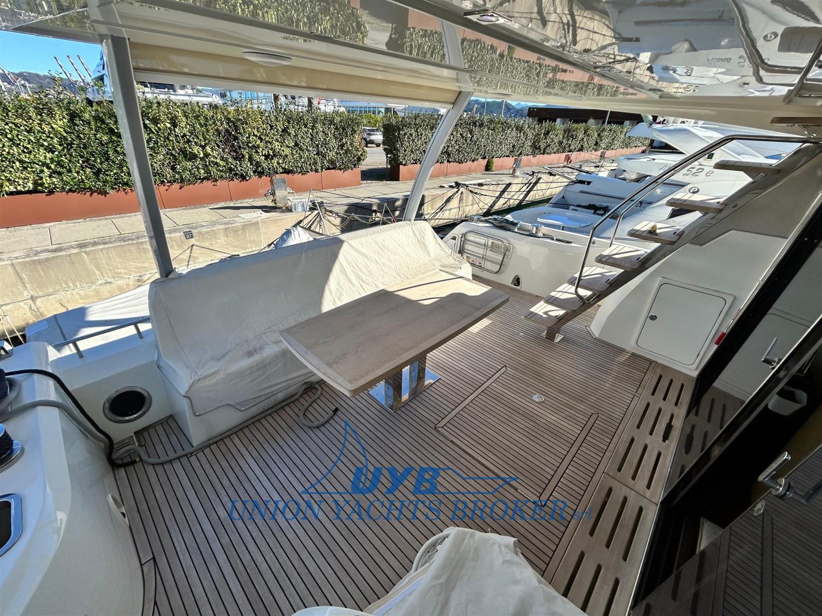 Alarme moteur, Alarme de pompe de cale, Eau sous pression, Douche de cockpit, Double barre à roue, Propulseur d'étrave (240 Kgf), Flaps électriques, Indicateurs de flaps, Éclairage de courtoisie, Passerelle (idraulica), Plateforme arrière (idraulica), Pompe de cale automatique, Porte latérale, Porte latérale, Cockpit en teck, Prise de quai, Connexion eau sous pression à quai, Rollbar, Guindeau électrique, Echelle de bain, Stabilisateurs (Seakeeper NG9), table de cockpit, Corne, Winch électrique arrière.