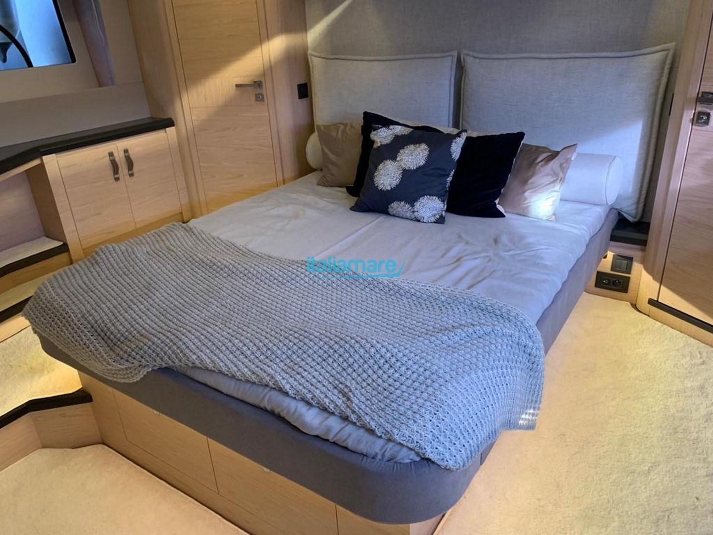 Accessoires principaux : Climatisation, Antenne satellite, GPS, Joystick, Pilote automatique, Passerelle hydraulique, Plate-forme, Stabilisateur Seakeeper, TV.