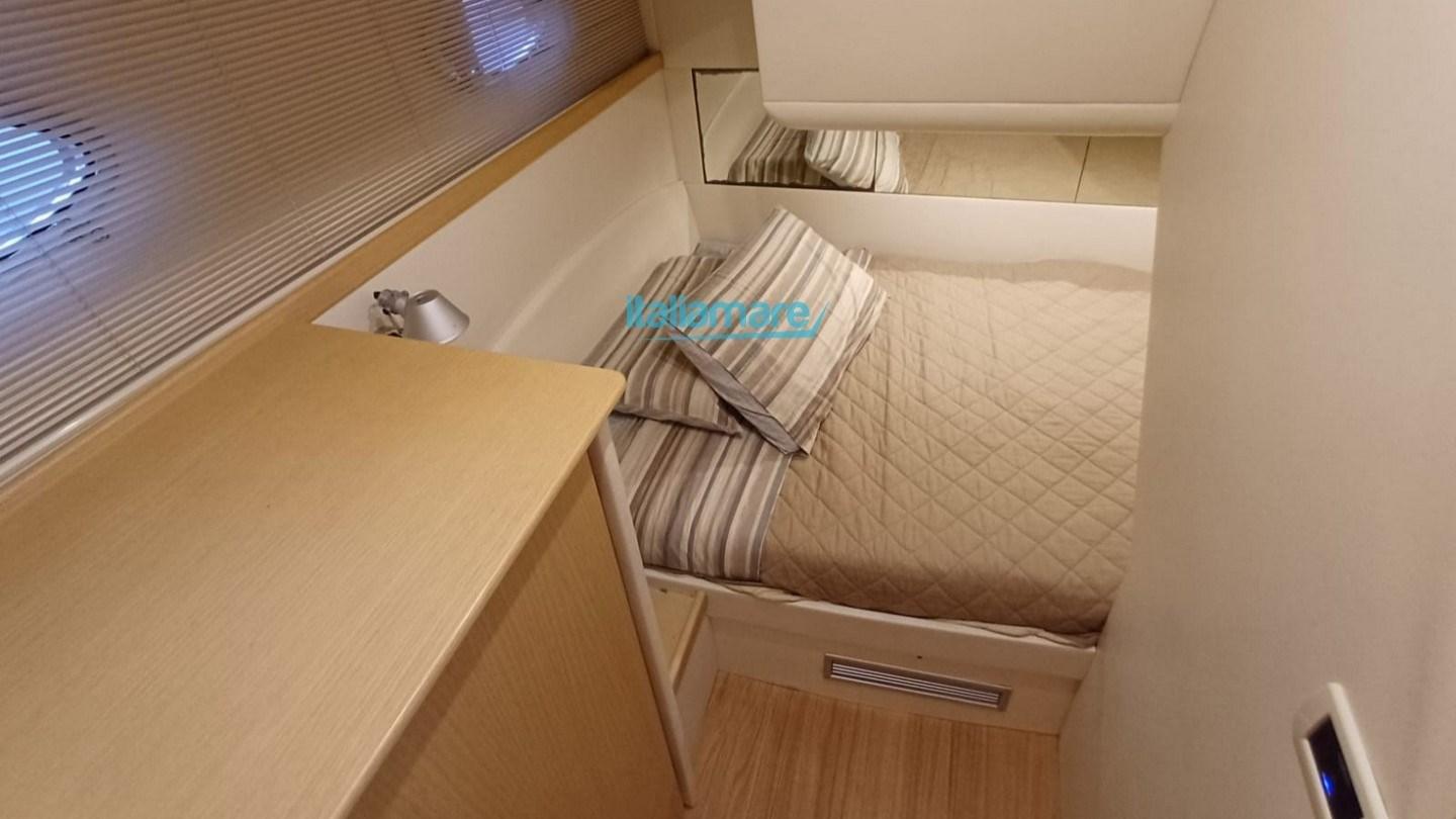 Cabine principale à l’avant avec salle de bain attenante, cabine double VIP, cabine d’invités avec deux lits simples et salle de bain avec douche.