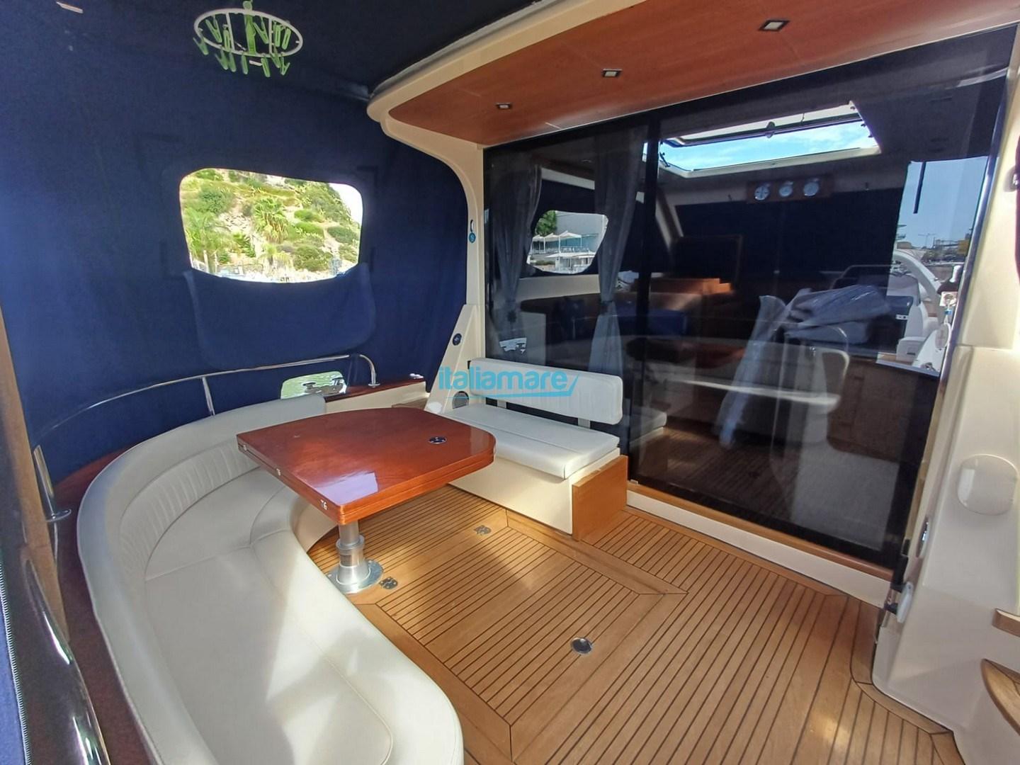 Extérieurement, le profil du gozzo est élégant, pont en teck fin, toit rigide fixe et passerelle hydraulique. Le cockpit en teck abrite un espace détente, une table fixe, une échelle de bain et une douche extérieure, tandis qu’un coussin extérieur offre un espace de bronzage confortable pour 6 à 8 personnes.