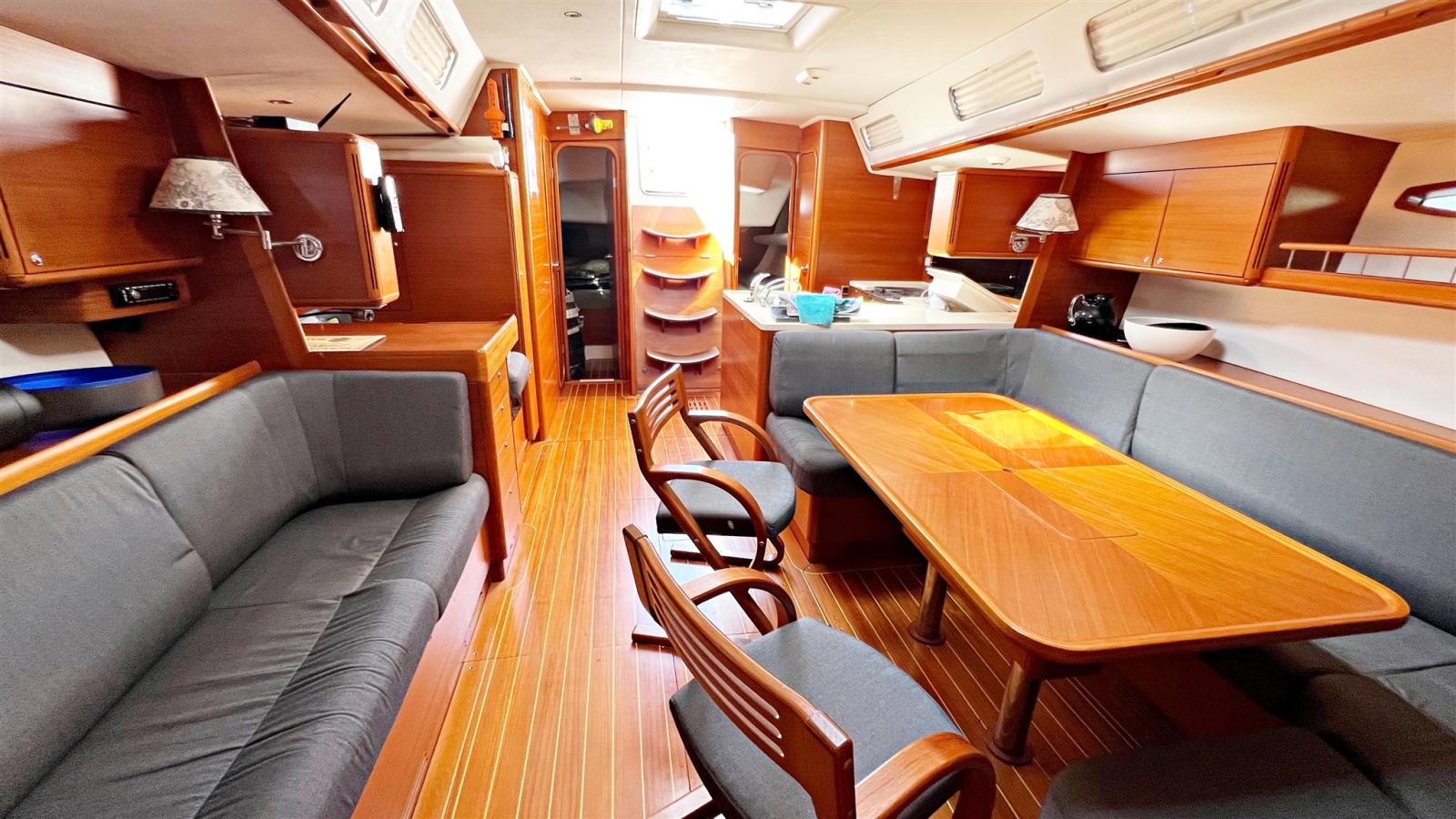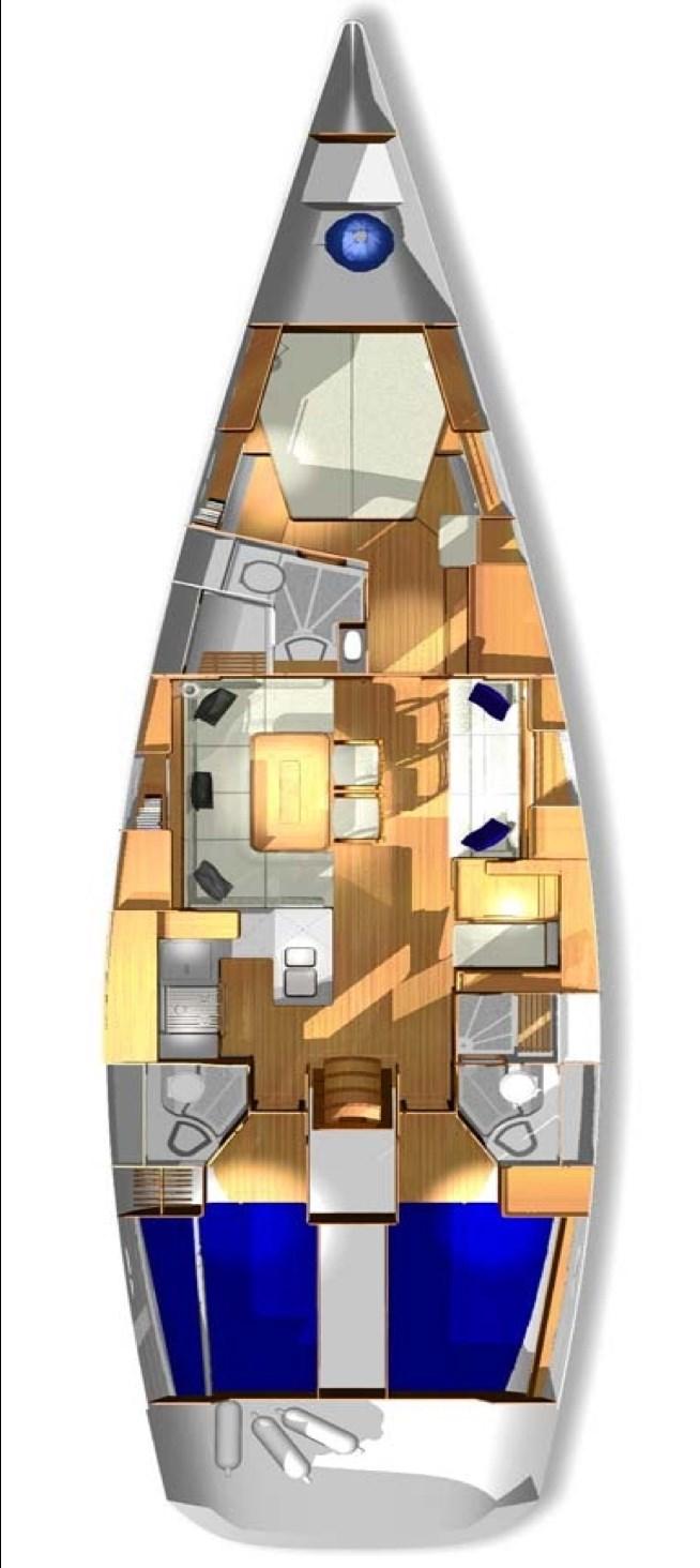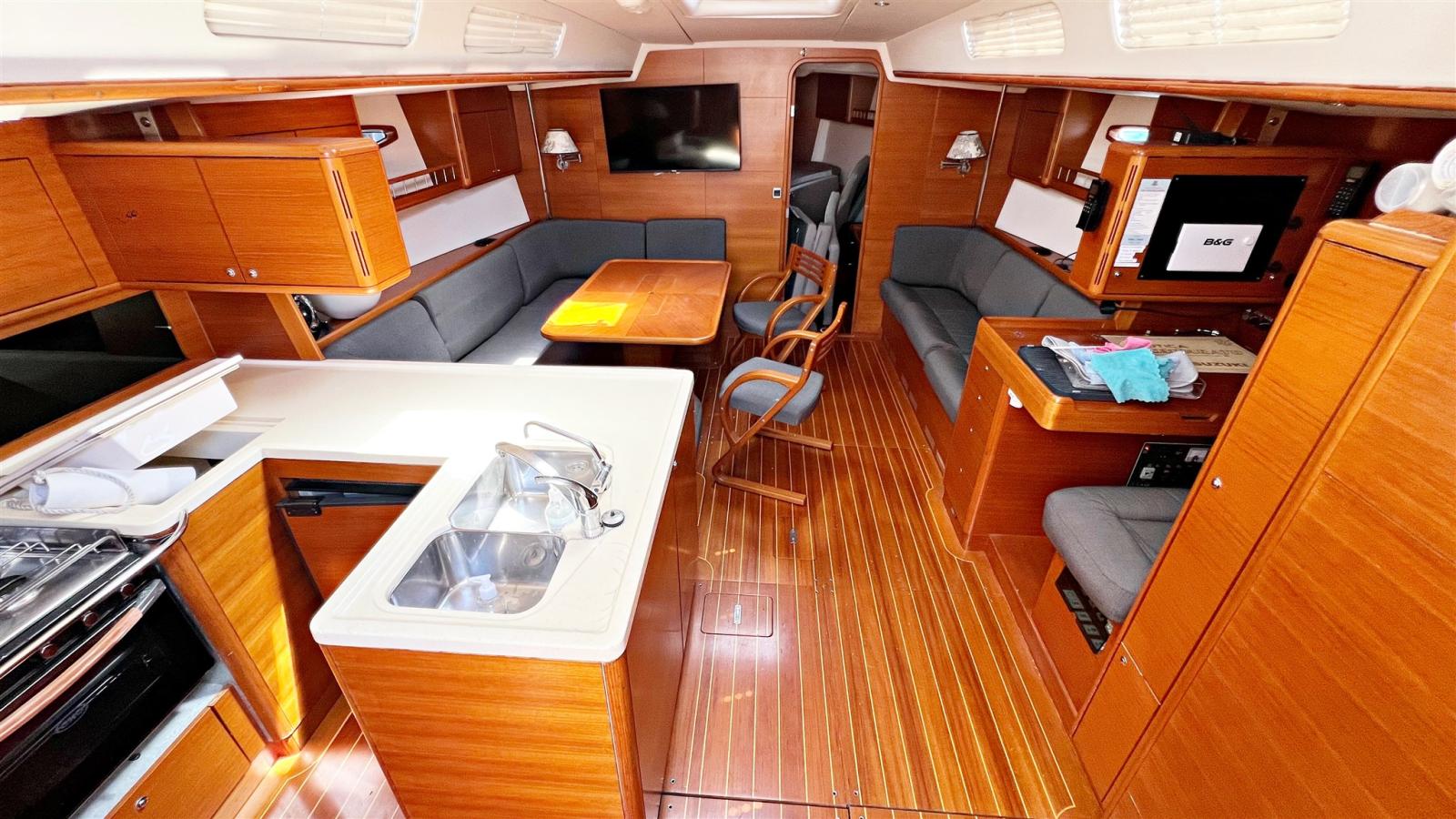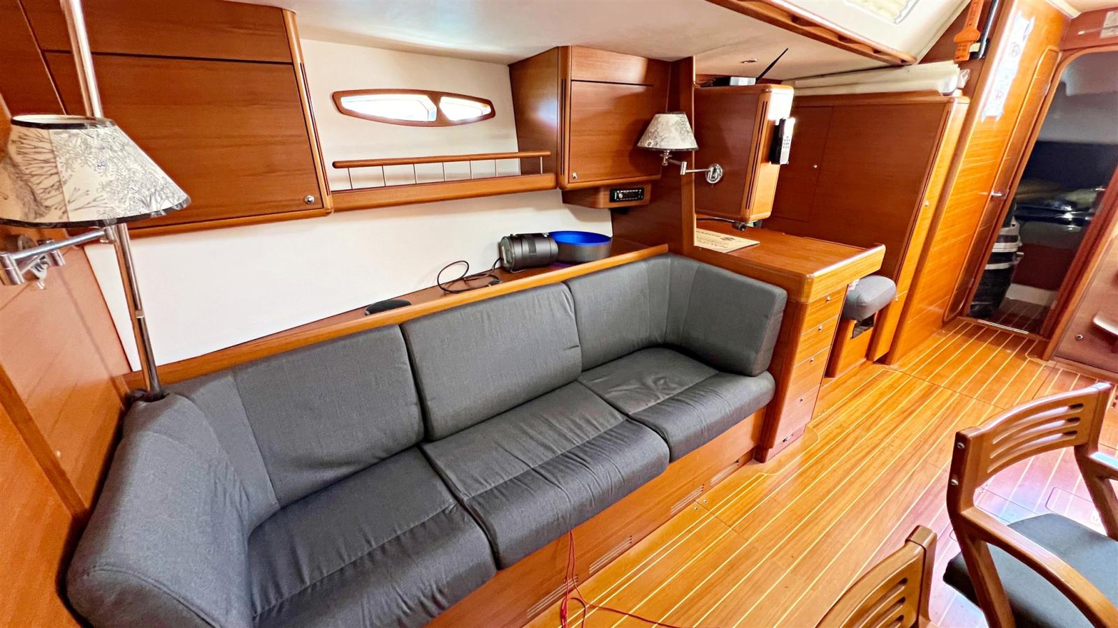 3 cabines, 3 salles de bain. Instrumentation électronique complète B&G et Simrad avec Radar. Instrumentation de régate Astra Yacht. Double timonerie avec roues en carbone. Pont et cockpit en teck. Propulseur d’étrave Max Power. Chaudière. Dessalinisateur Schenker. Chauffage Eberspacher. Groupe électrogène Fisher-Panda 6,8 kw. Système TV avec TV. Annexe avec moteur hors-bord.