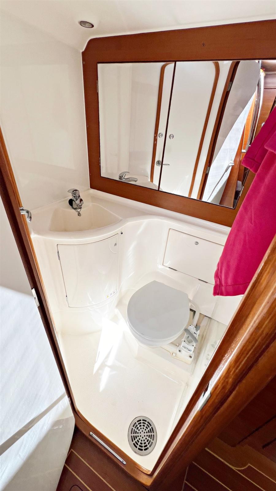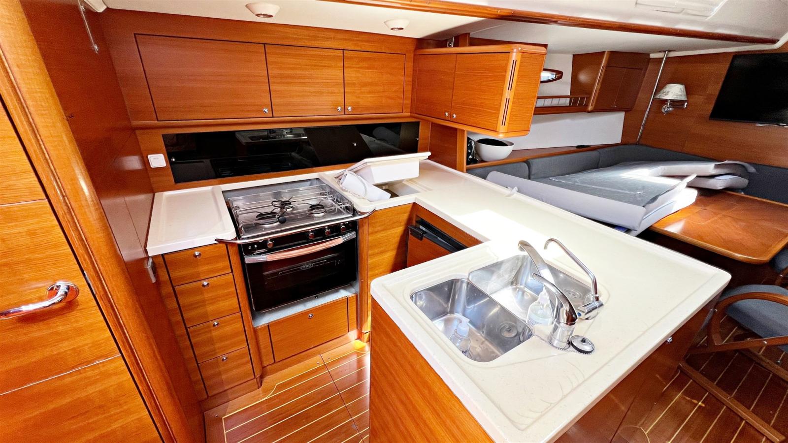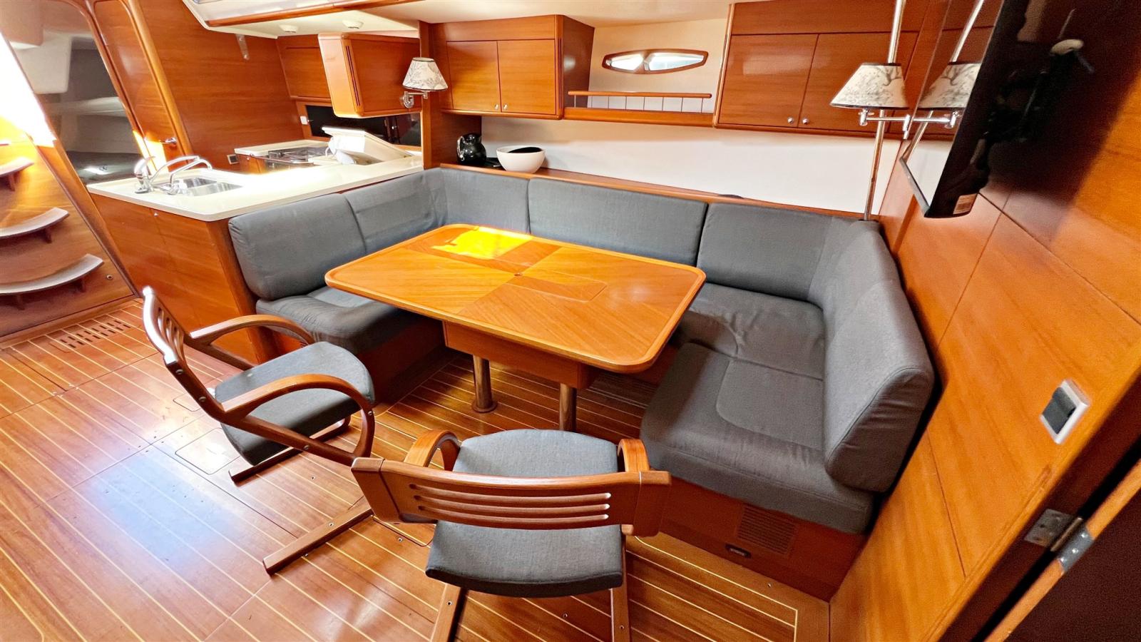 3 cabines, 3 salles de bain. Instrumentation électronique complète B&G et Simrad avec Radar. Instrumentation de régate Astra Yacht. Double timonerie avec roues en carbone. Pont et cockpit en teck. Propulseur d’étrave Max Power. Chaudière. Dessalinisateur Schenker. Chauffage Eberspacher. Groupe électrogène Fisher-Panda 6,8 kw. Système TV avec TV. Annexe avec moteur hors-bord.