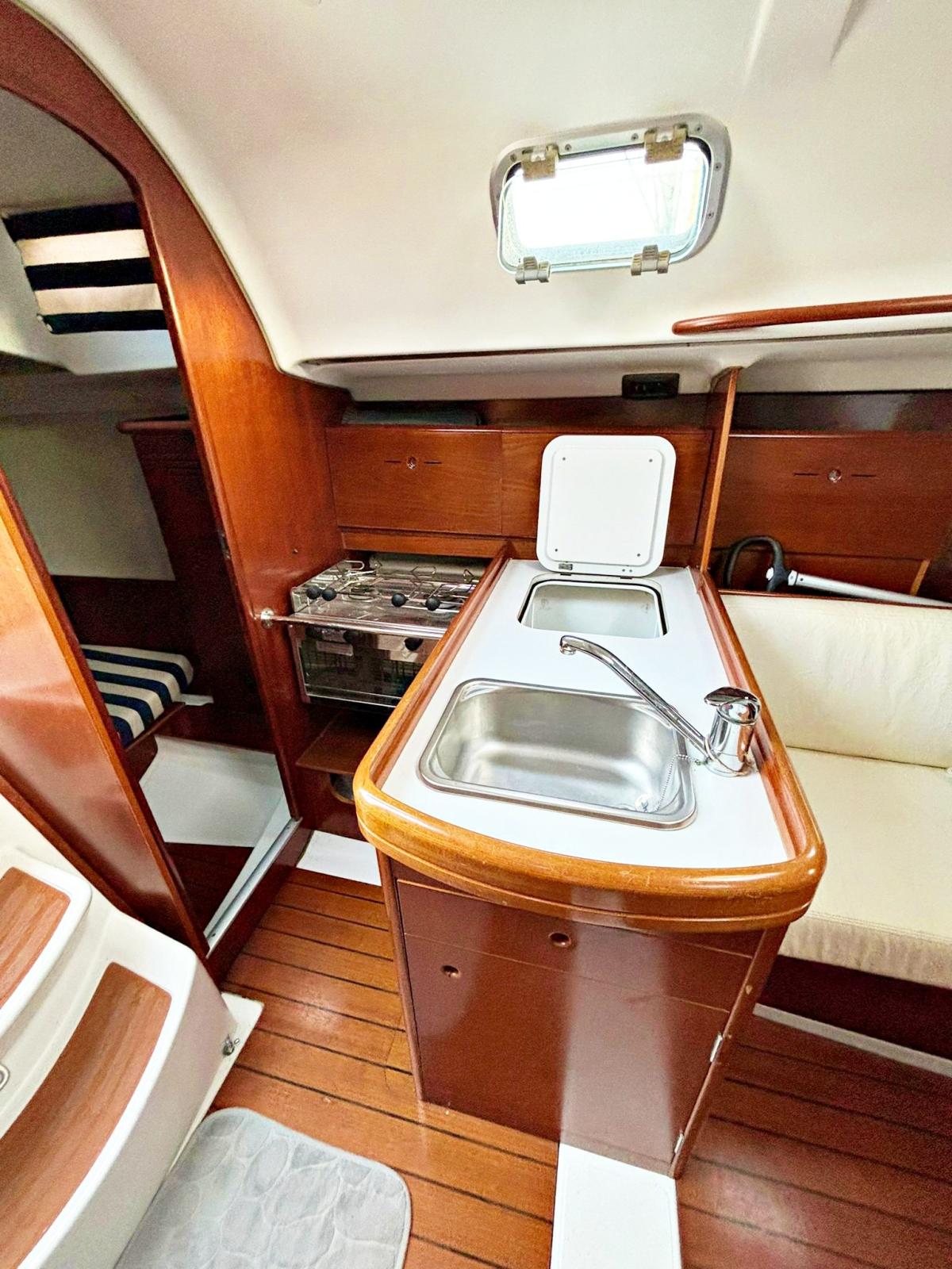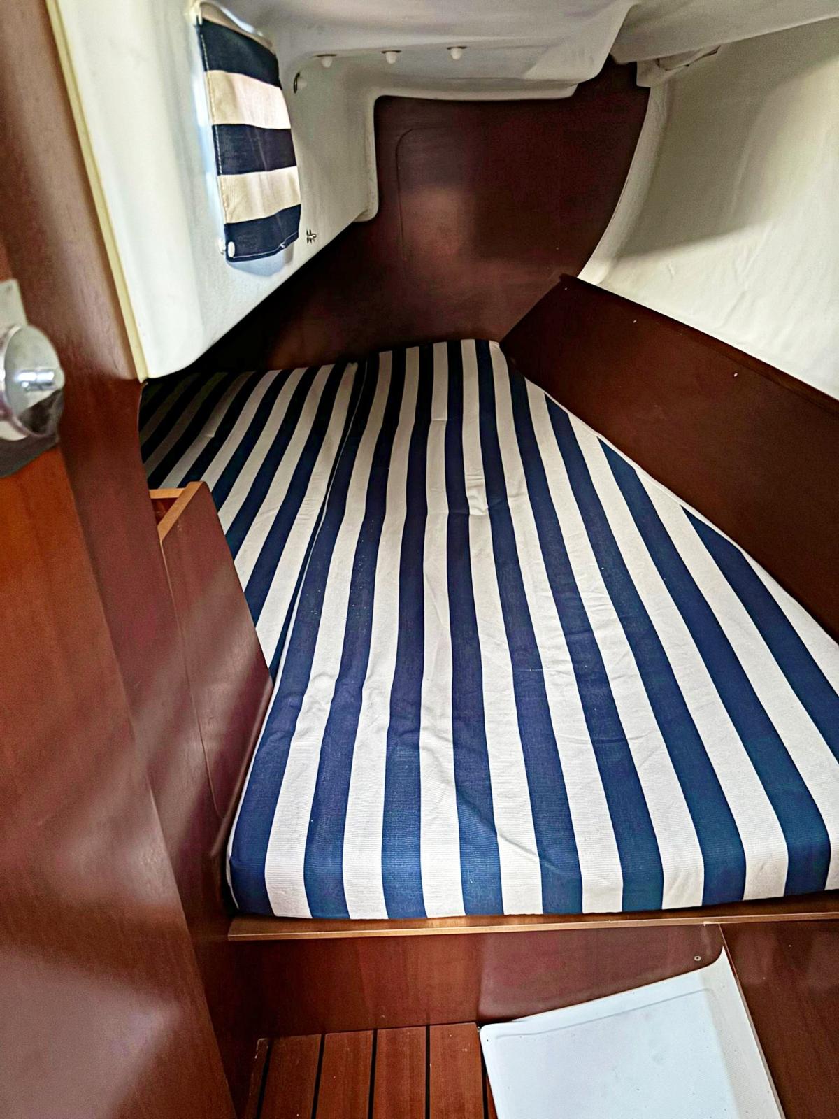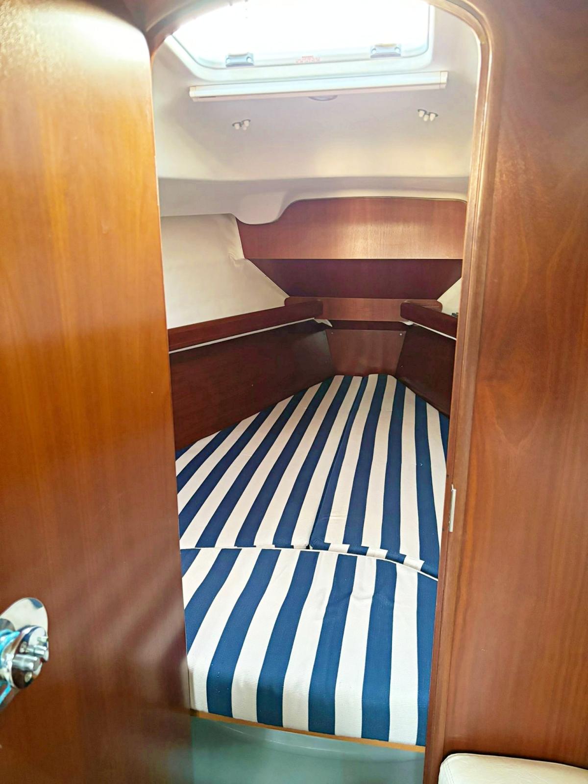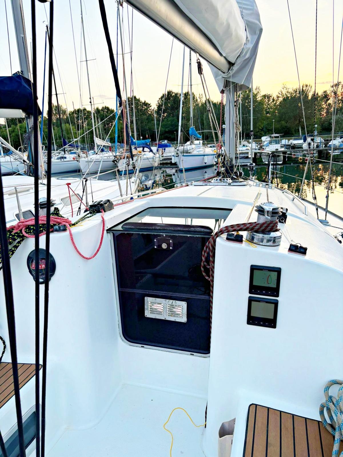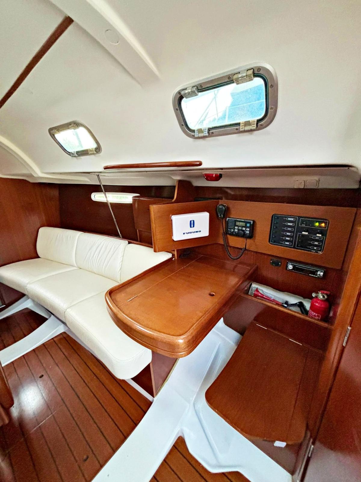 2 cabines, 1 salle de bain, coin repas. Instrumentation complète Garmin 2022 avec nouveau pilote automatique Raymarine ST4000. Teck synthétique sur les bancs de cockpit 2023. Chaudière. Nouvelles batteries 2023. Garde-boue et chaussettes 2022. Sac paresseux 2022. Auvent articulé sur lazy bag 2022. Delfiniera 2021. Traîneau rigide 2023. Lignes de vie textiles. Guindeau électrique. Encore avec 50mt de chaîne 2021. Trappe d’étrave neuve 2023.
