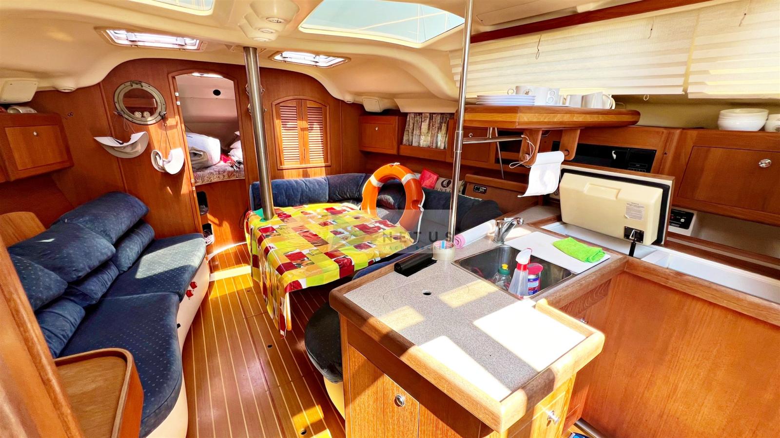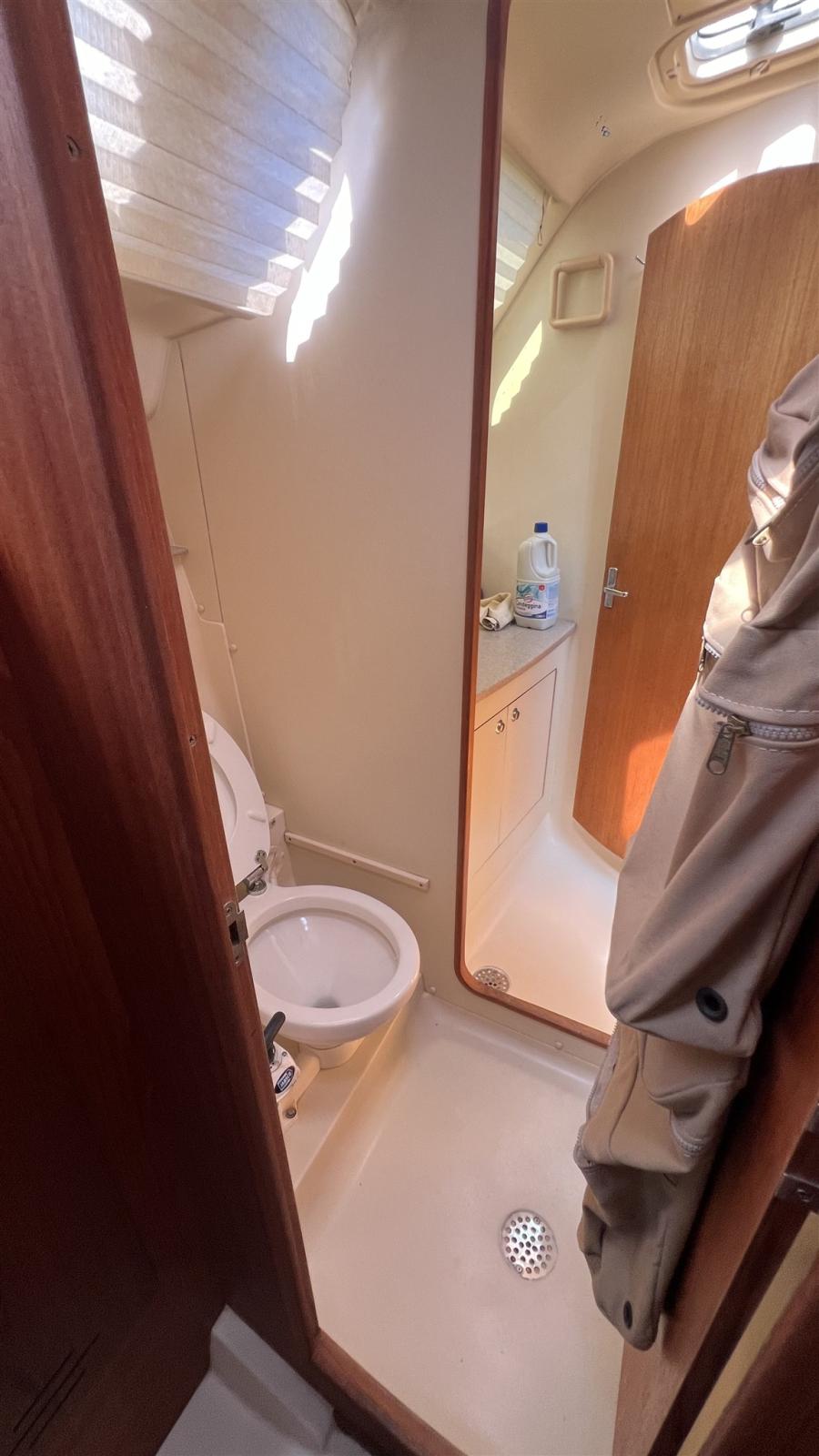 2 cabines, 1 salle de bain avec toilettes manuelles. Dinette décapotable. Instrumentation Raymarine complète avec radar. Propulseur d’étrave. Panneaux solaires 2013. Cockpit en teck synthétique. 1 treuil électrique. Séries 2022.
