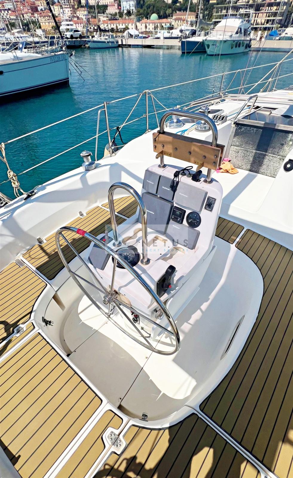Ancre (Rocna), Eau sous pression, 3 Batteries, Douche de cockpit, Bossoirs pour annexe, Panneau solaire, Passerelle, Pompe de cale manuelle, Cockpit en teck, Prise de quai, Guindeau électrique, Gréement monotoron, Echelle de bain, Chaise support HB, table de cockpit, 5 Winch, Windex.