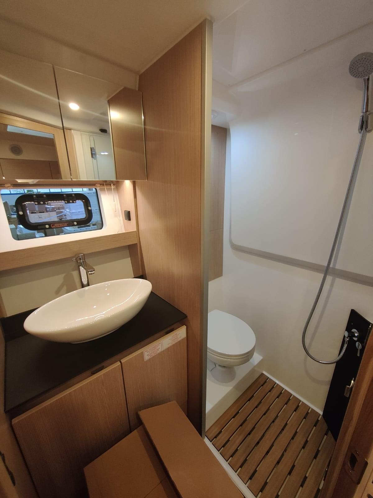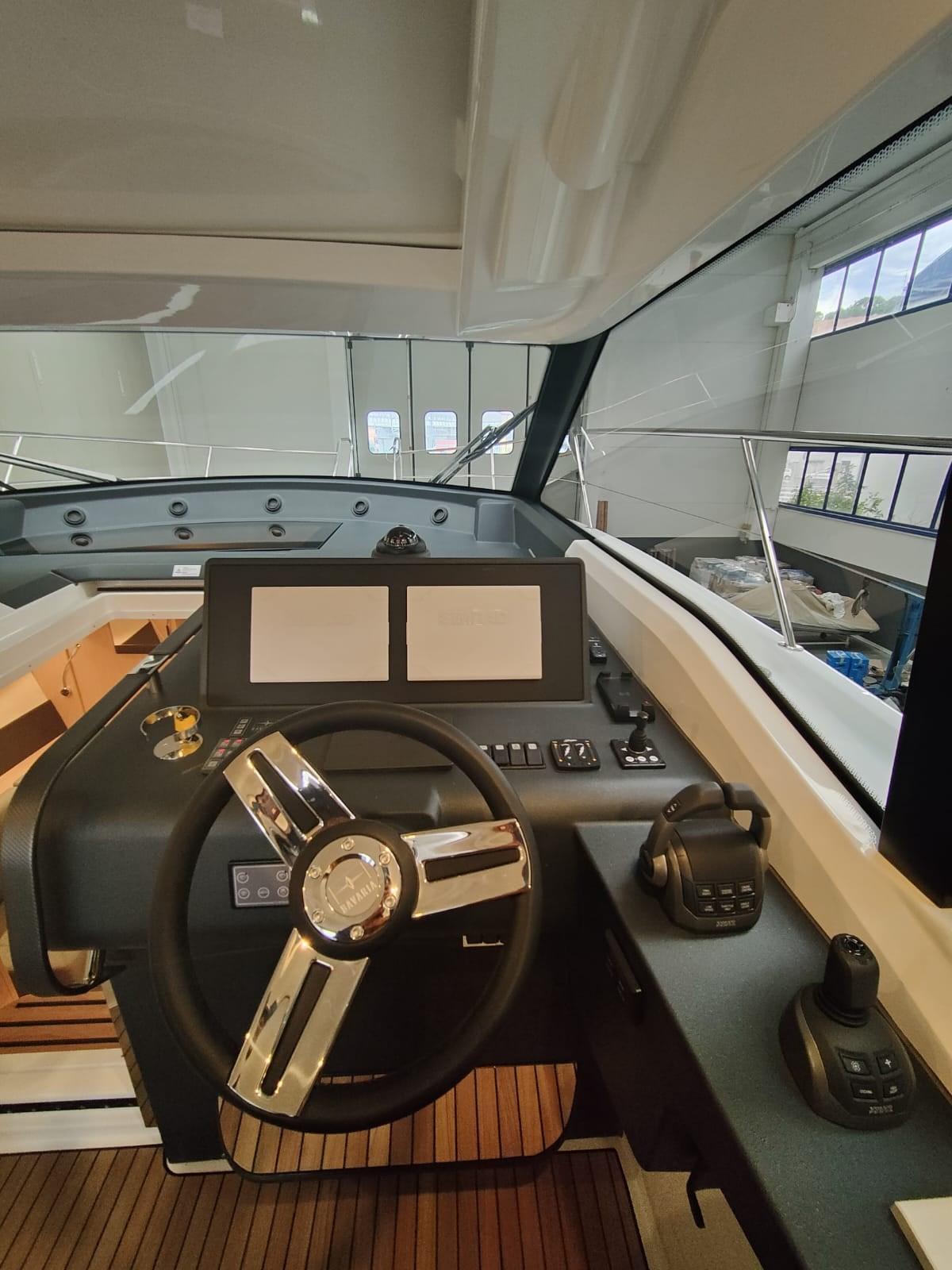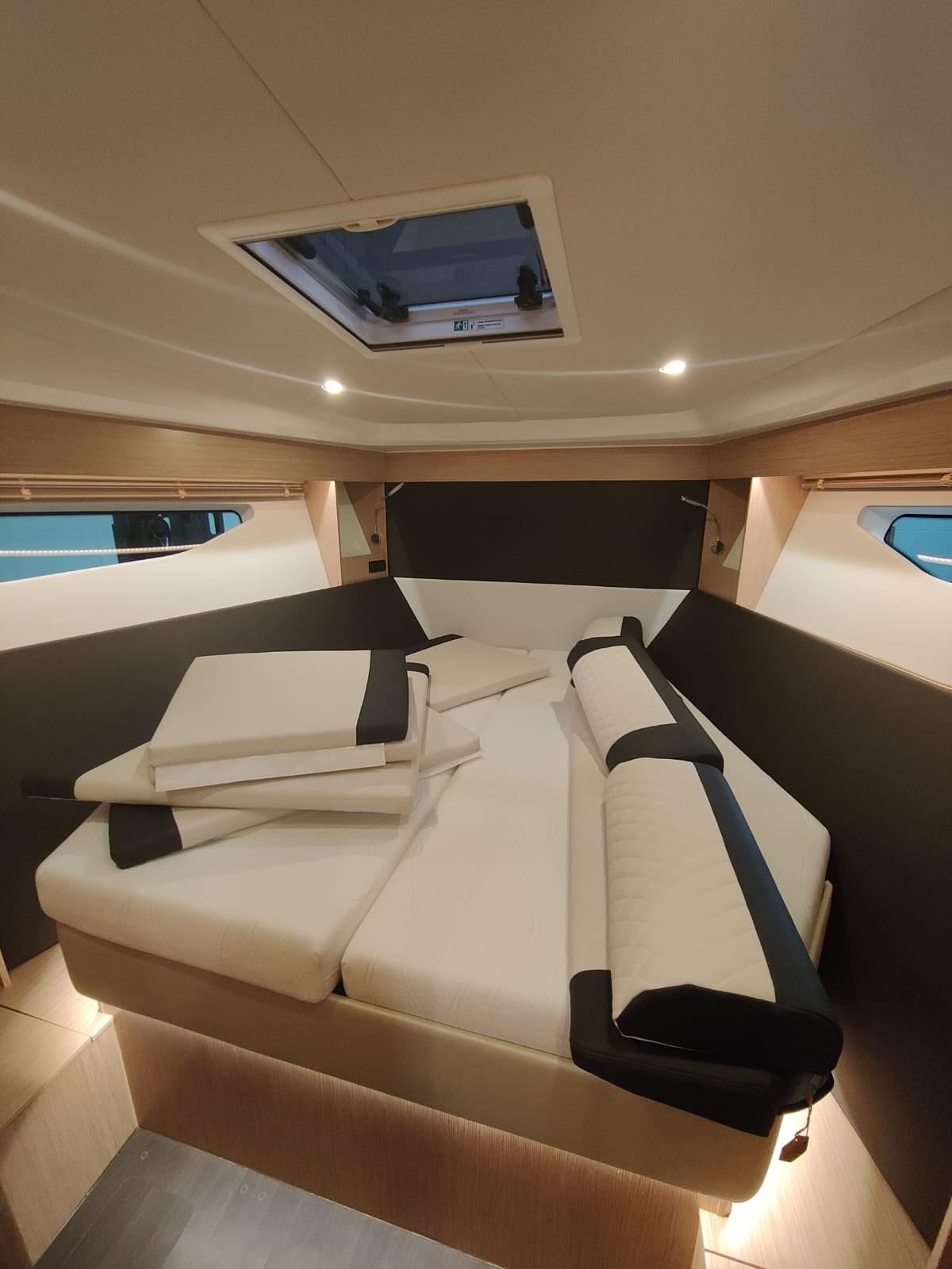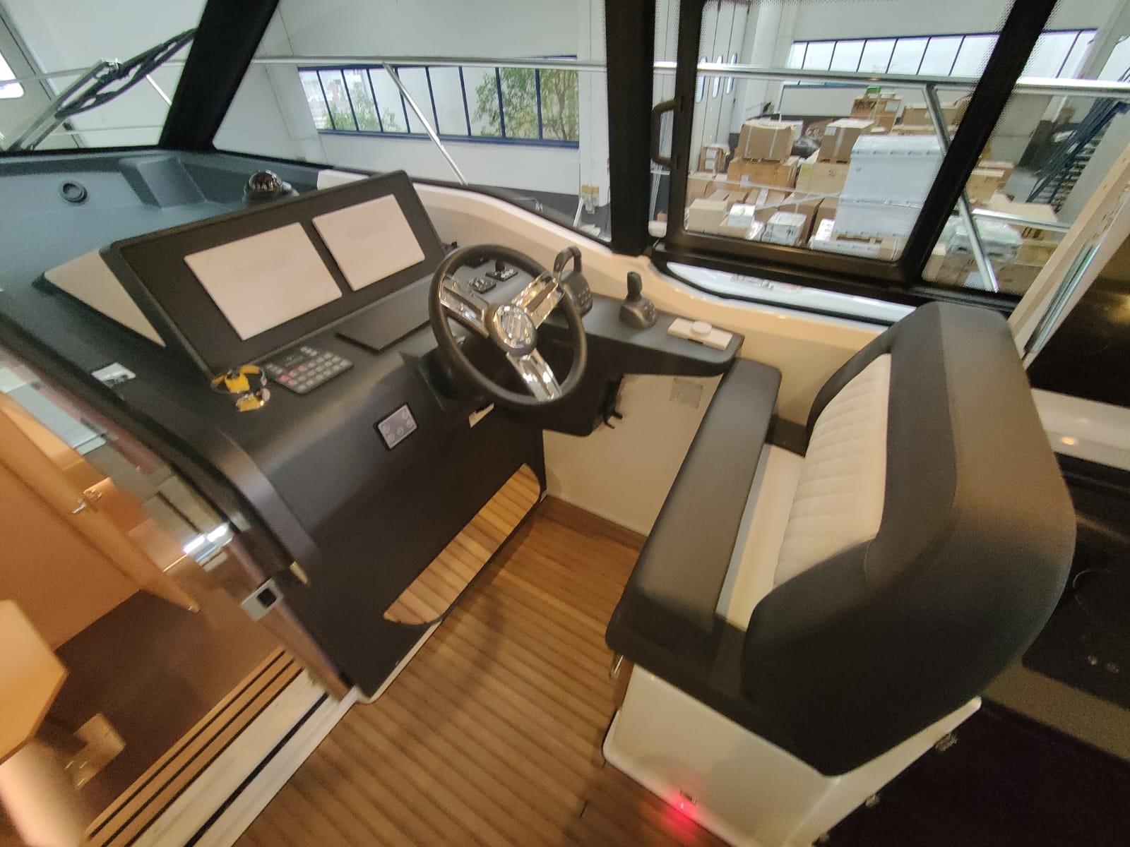Accessoires : joystick, réfrigérateur dans le cockpit, teck dans le cockpit et sur la plateforme surdimensionnée, pack audio Fusion Apollo, volets électriques, propulseur d’étrave, 2 GPS Simrad, VHF, pilote automatique, 2 cabines, 1 salle de bain, 1 salle de bande décapotable, cuisine, guindlard électrique, ancre et chaîne en acier inoxydable, toit à ouverture électrique du véhicule, calandre électrique dans le cockpit, housse de camping-car.