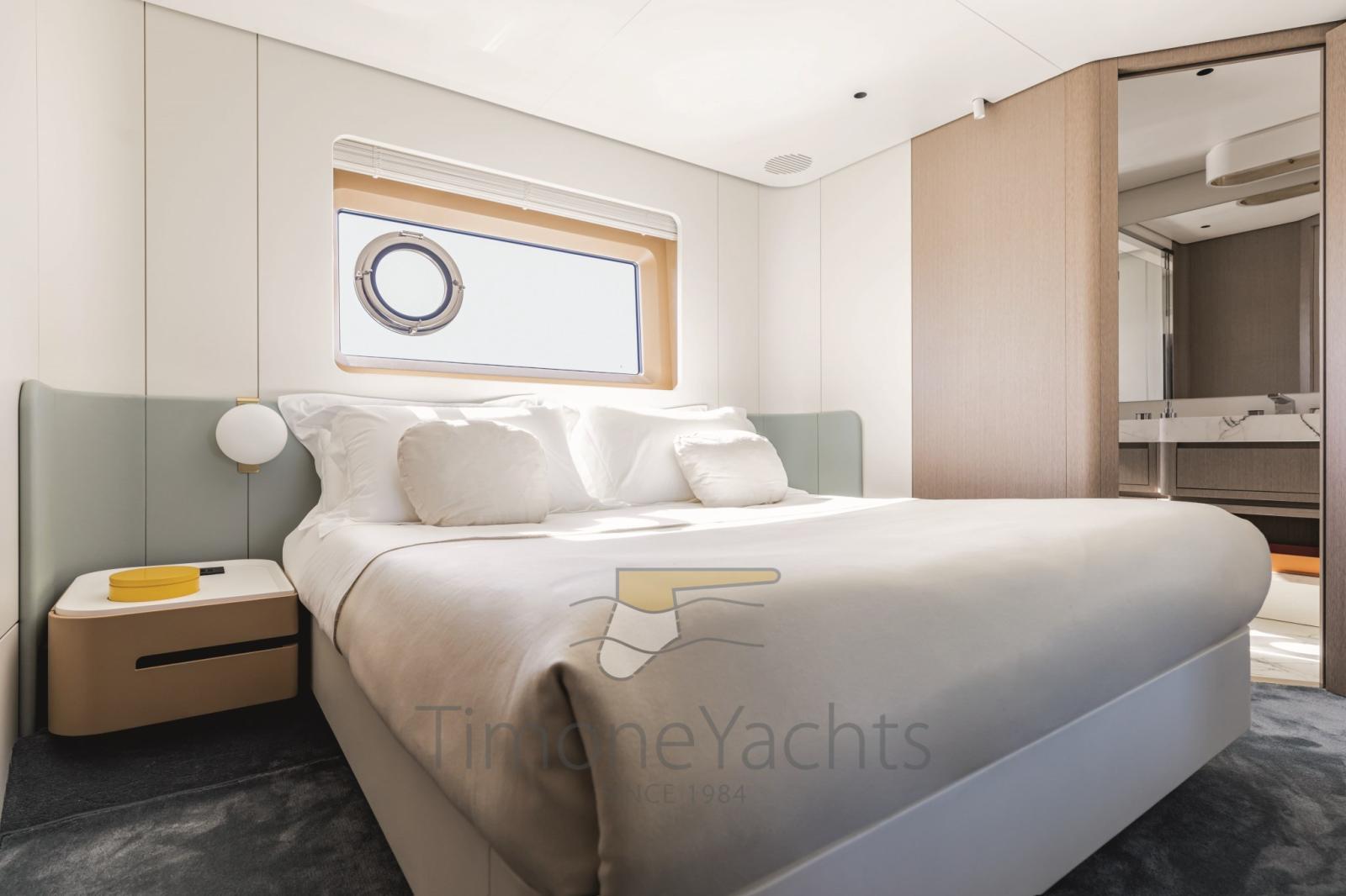 Les fenêtres du sol au plafond de la suite du propriétaire offrent une vue sur la mer incomparable. Le bureau de la coiffeuse est positionné pour permettre à la lumière de filtrer et de mettre en valeur l’espace. La cabine continue vers la proue avec un vestiaire également inondé de lumière grâce à un jeu habile de reflets et aux ouvertures latérales qui renforcent la sensation d’espace.