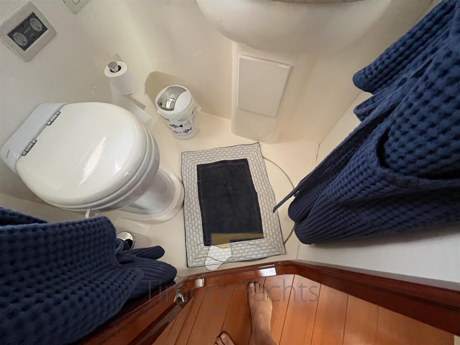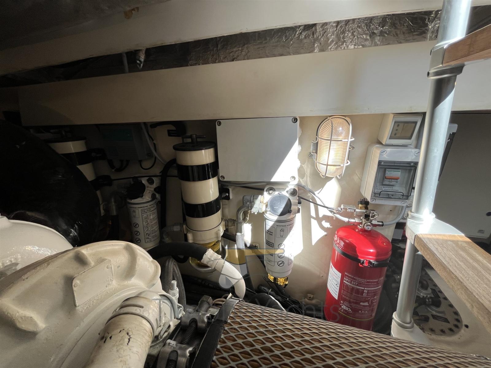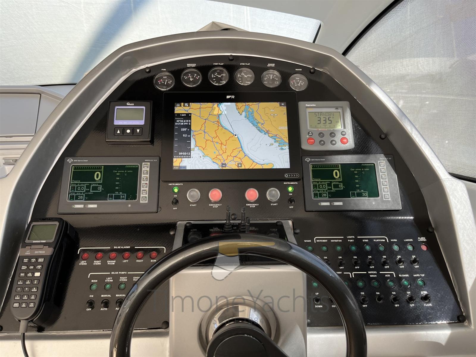 Alarme moteur, Alarme de pompe de cale, Eau sous pression, Douche de cockpit, Flaps hydrauliques, Hard top, Extincteur(s) fixe(s), Indicateurs de flaps, Lavage de chaine, Éclairage de courtoisie, Spots sous-marins, Passerelle, Plateforme arrière (teak), Pompe de cale automatique, Pompe de cale manuelle, Cockpit en teck, Prise de quai, Connexion eau sous pression à quai, Guindeau électrique, Echelle de bain, table de cockpit, Corne, Winch électrique arrière, Winch électrique avant.