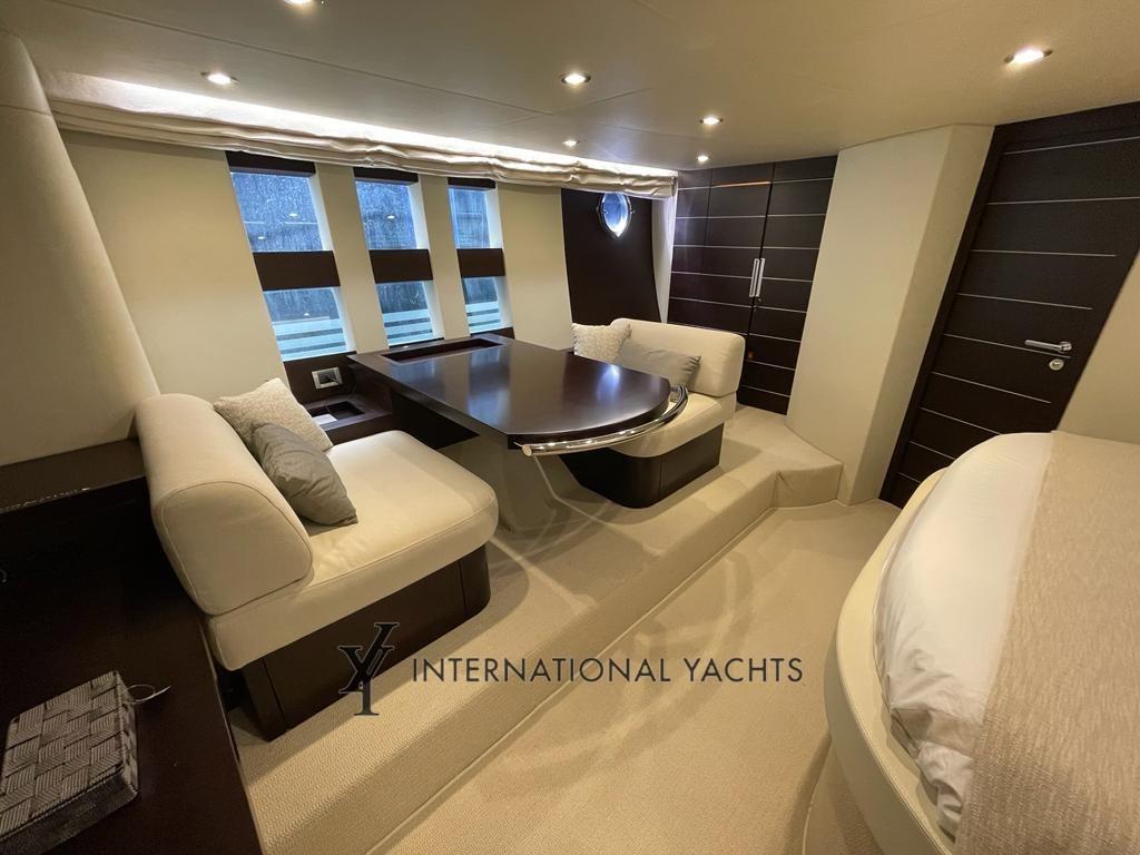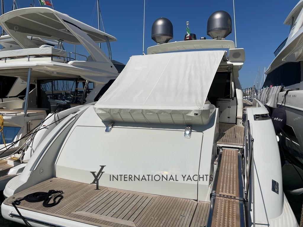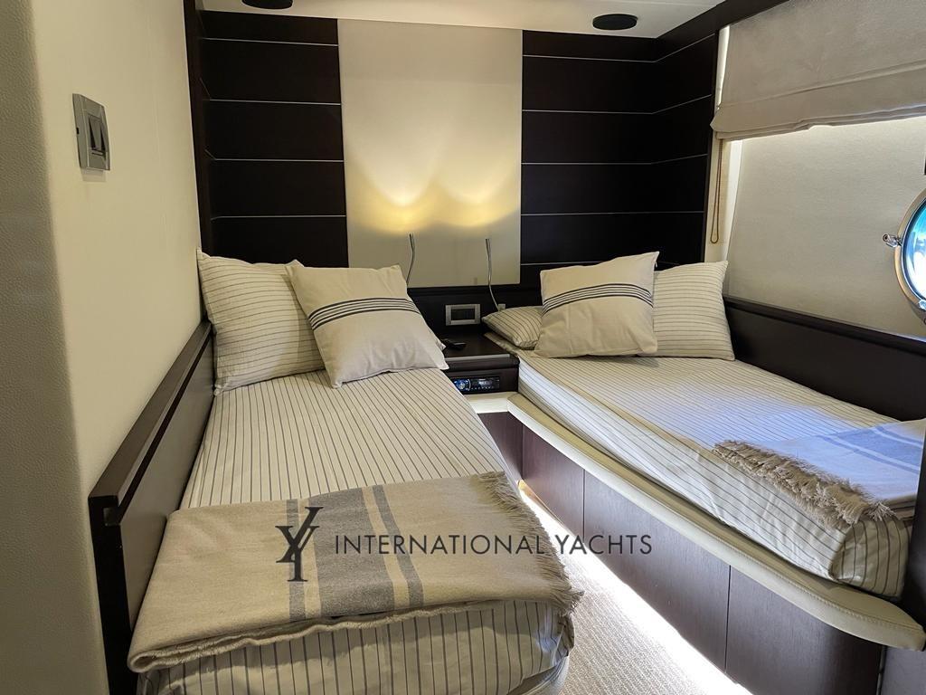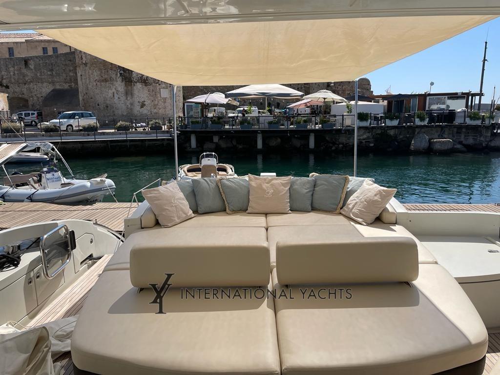 Alarme moteur, Eau sous pression, Passavant en teck, Douche de cockpit, Flaps hydrauliques (N°2), Garage à annexe, Hard top, Lavabo dans le cockpit, Spots sous-marins, Passerelle, Plateforme arrière, Pompe de cale automatique, Cockpit en teck, Prise de quai, Connexion eau sous pression à quai, Onduleur, Rollbar, Guindeau électrique, Echelle de bain, Stabilisateurs (Seakeeper), table de cockpit, Corne.