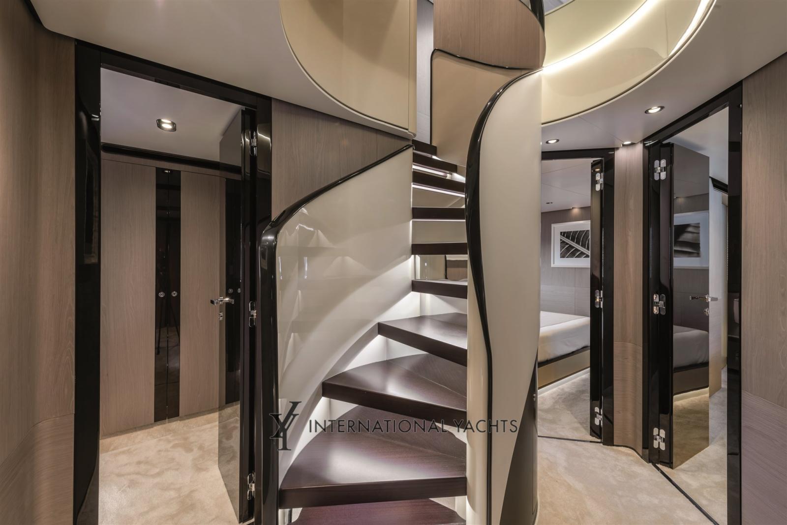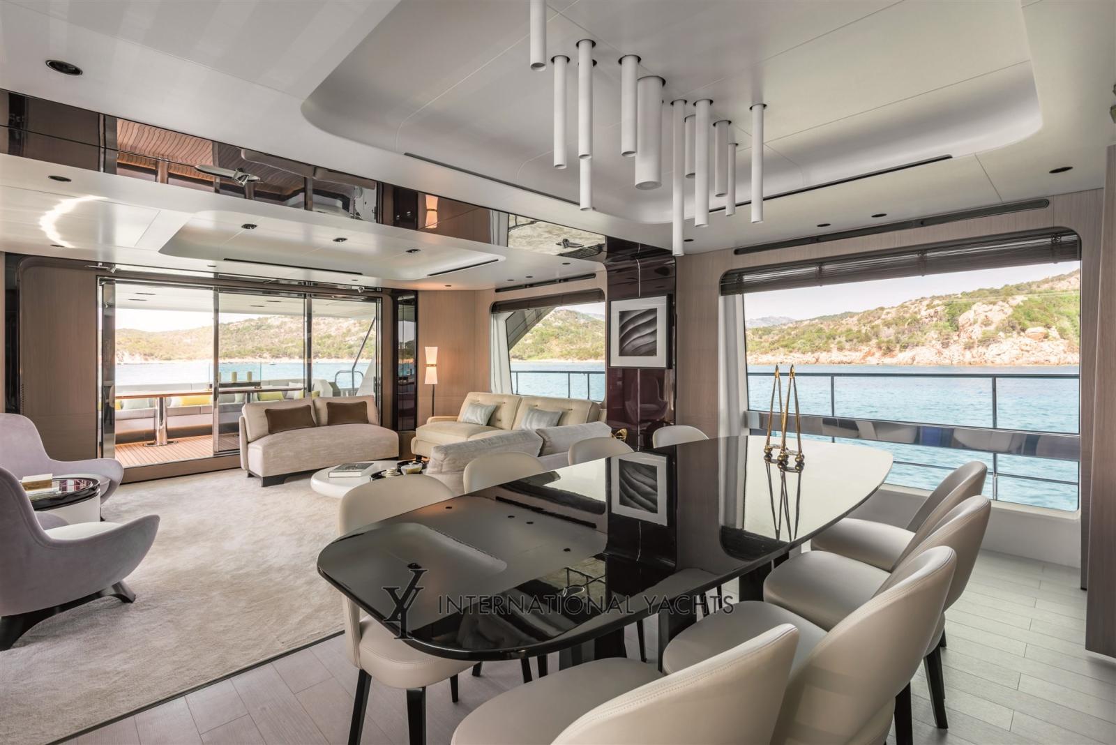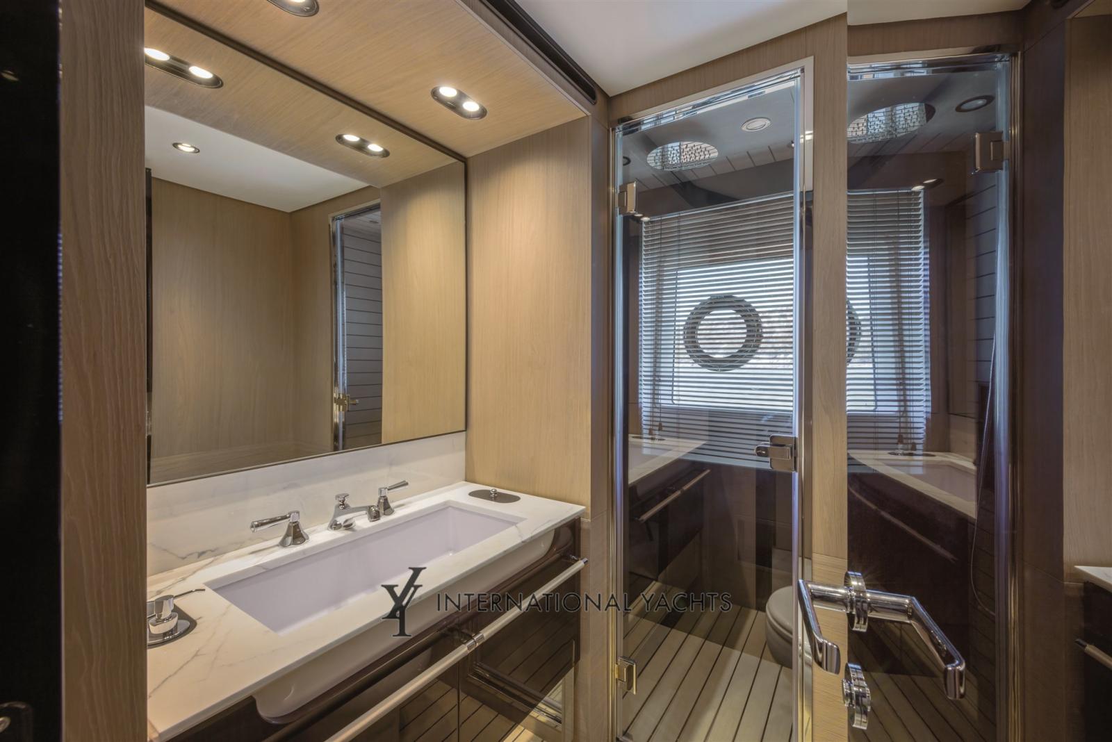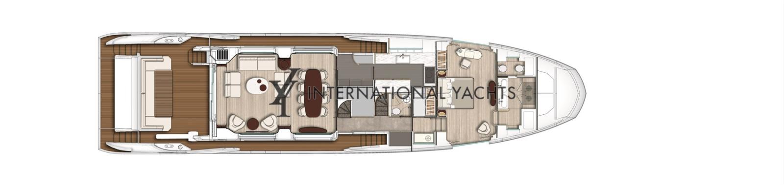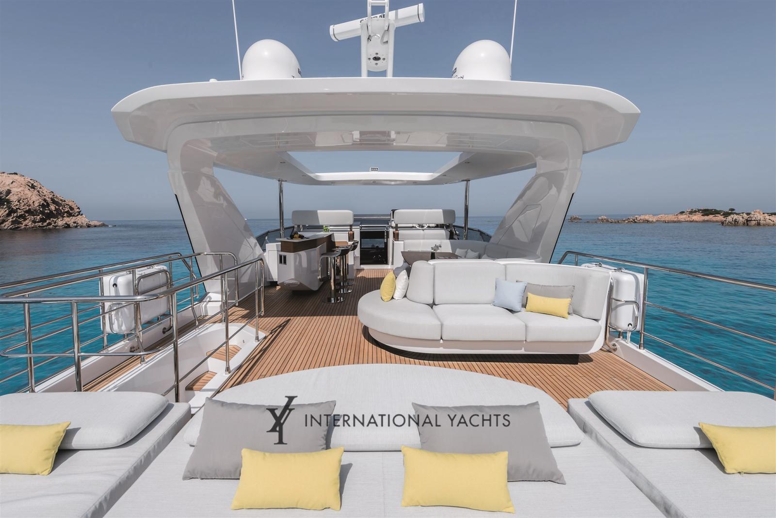 Eau sous pression, Passavant en teck, Couleur spéciale, Douche de cockpit, Double barre à roue, Phare de poursuite, Garage à annexe, Éclairage de courtoisie, Spots sous-marins, Passerelle, Plateforme arrière, Porte latérale, Porte latérale, Cockpit en teck, Prise de quai, Connexion eau sous pression à quai, Guindeau électrique, Echelle de bain, Stabilisateurs, table de cockpit, Annexe.