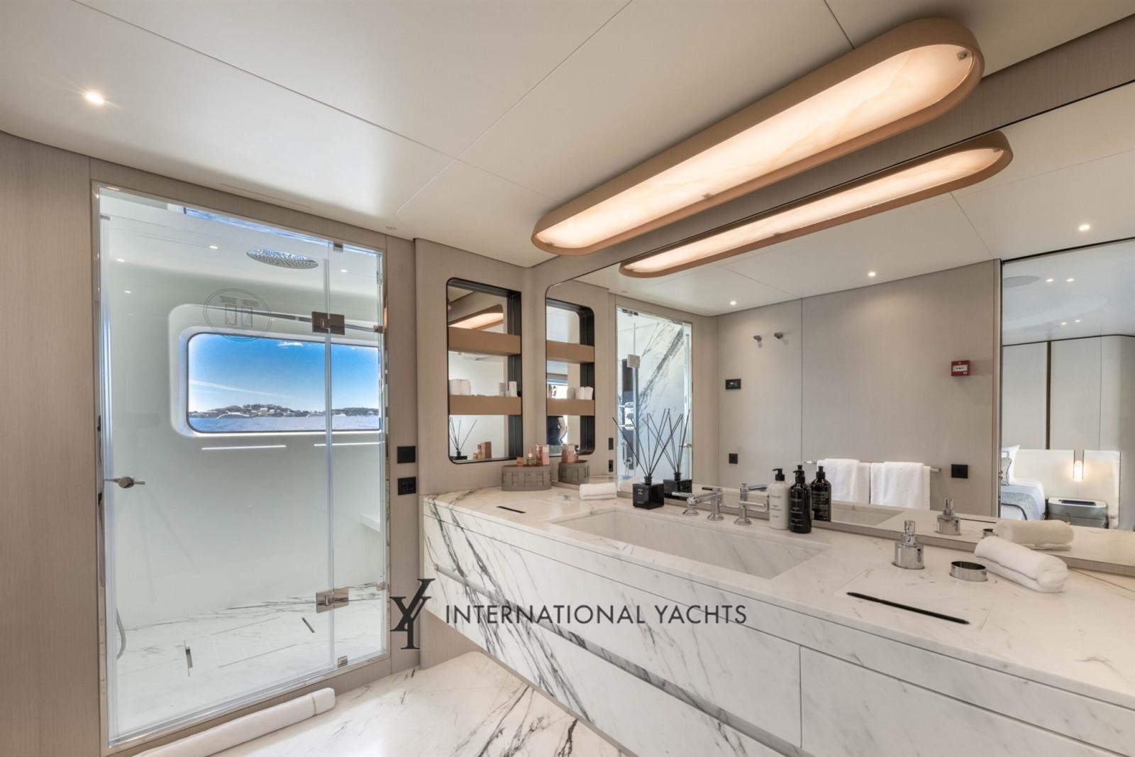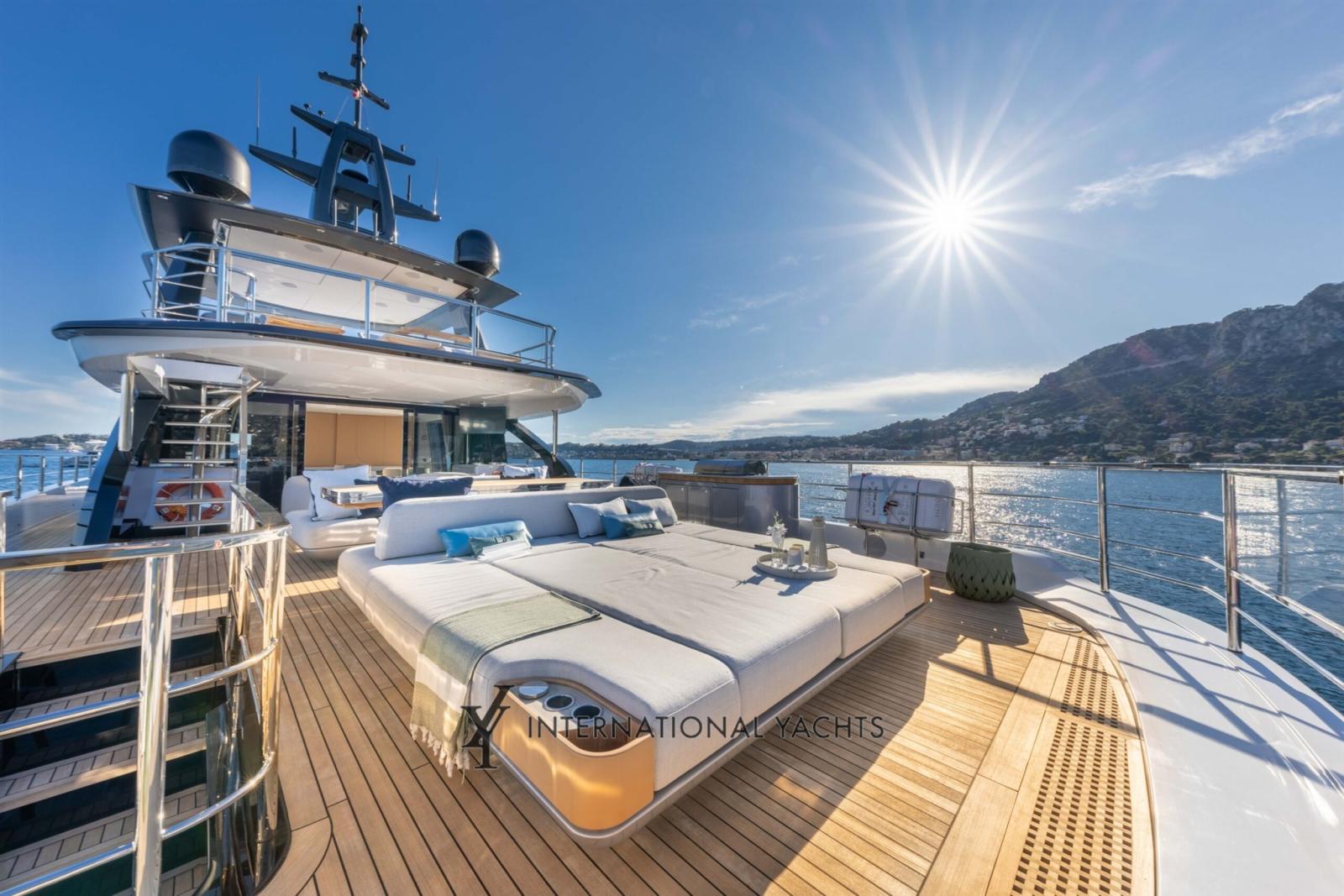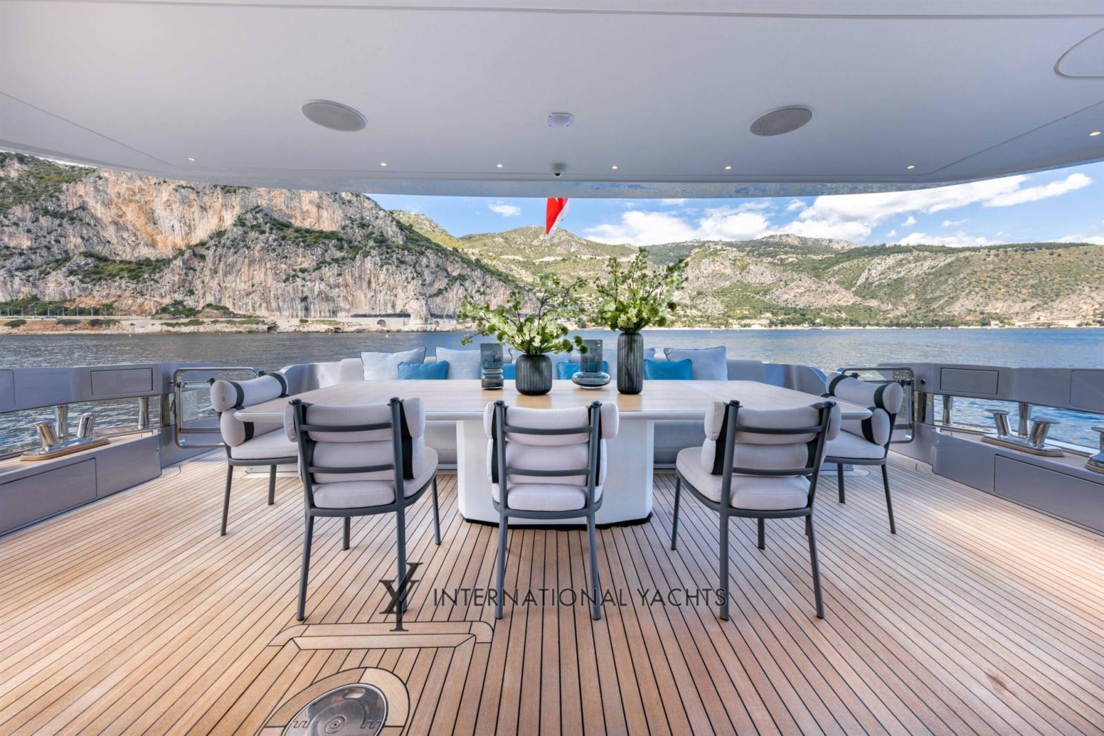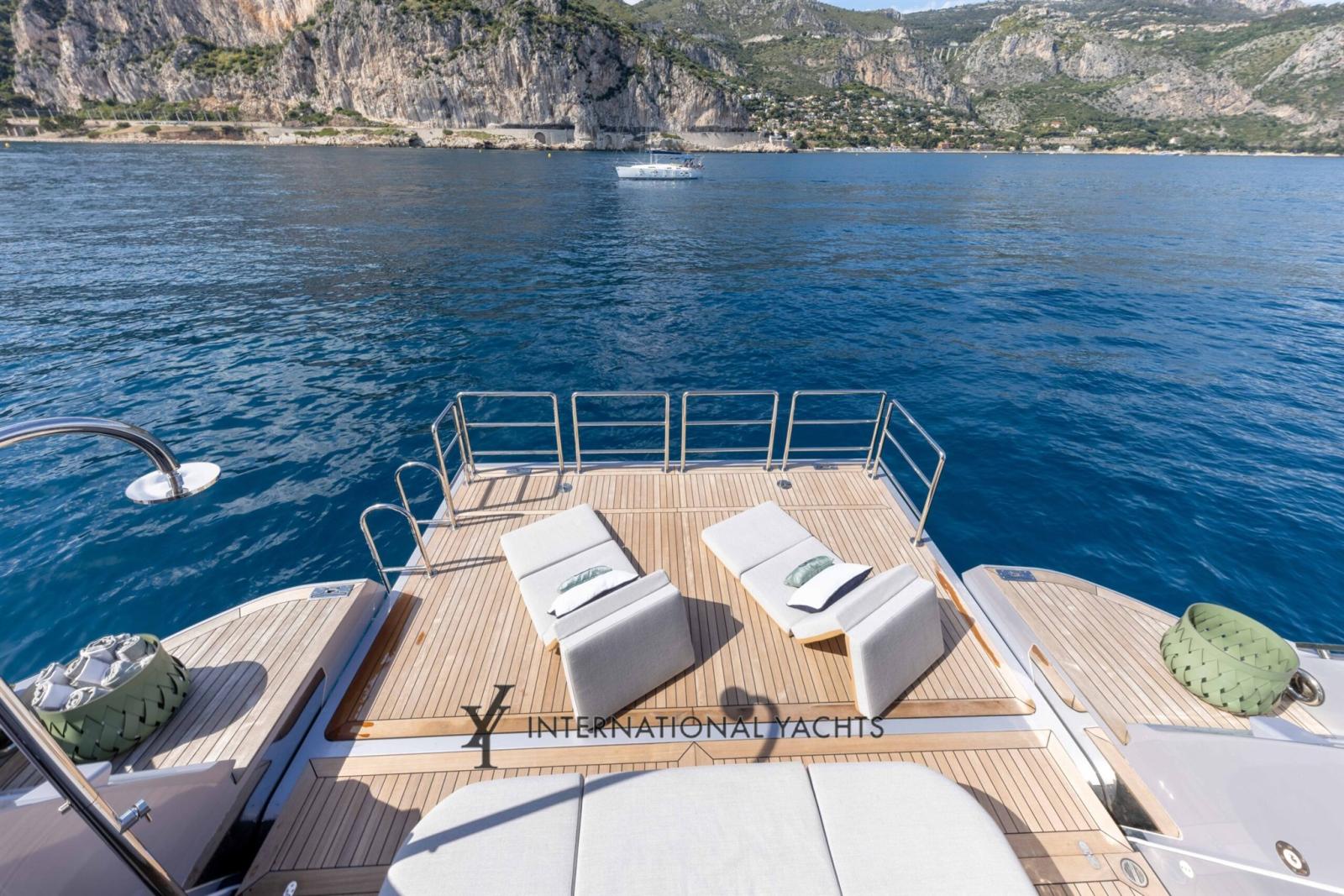 Passavant en teck, Douche de cockpit, Garage à annexe, Hard top, Passerelle, Plateforme arrière, Porte latérale, Porte latérale, Cockpit en teck, Prise de quai, Connexion eau sous pression à quai, Guindeau électrique, Stabilisateurs, Annexe, Corne, Winch électrique arrière, Winch électrique avant.