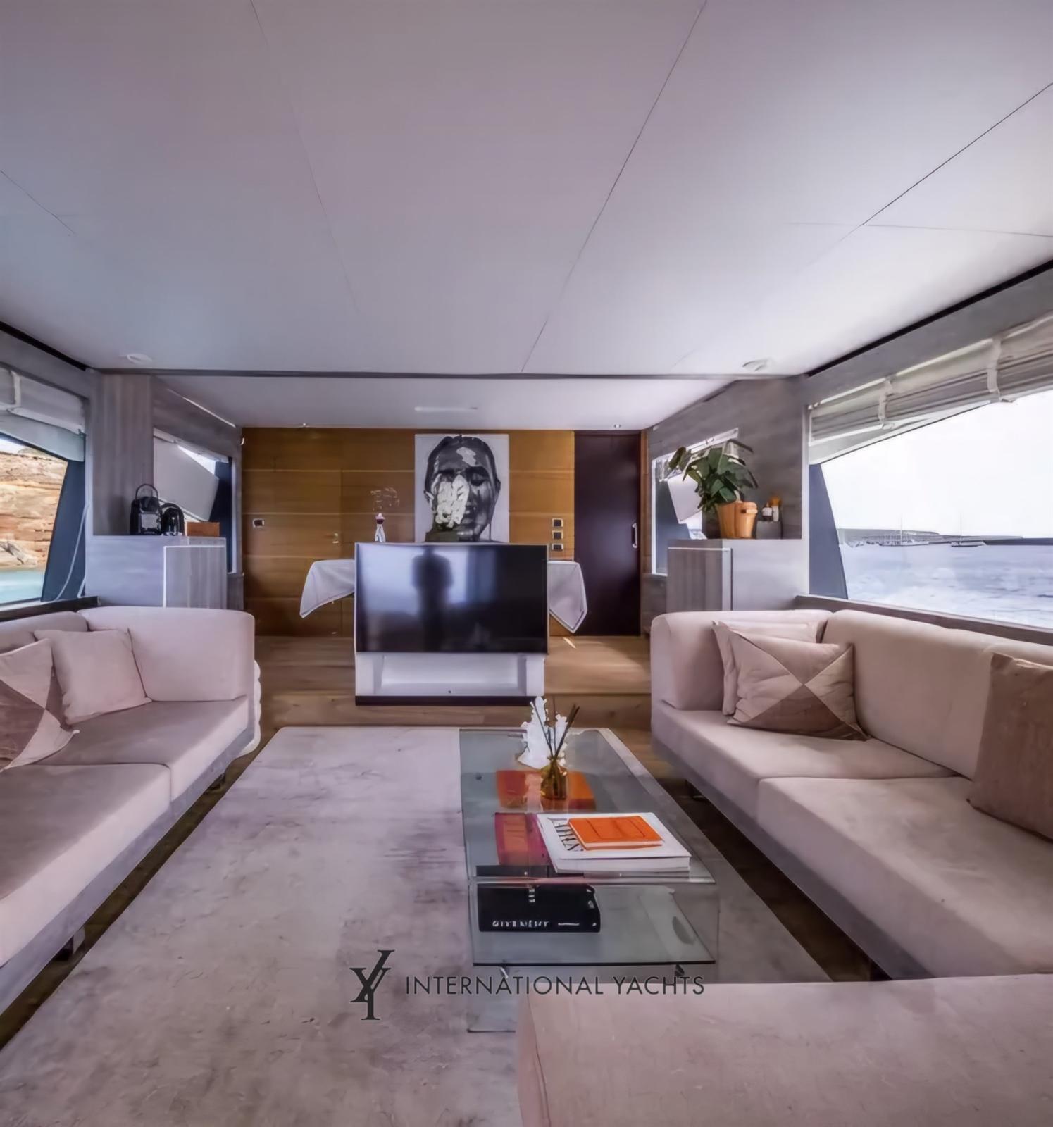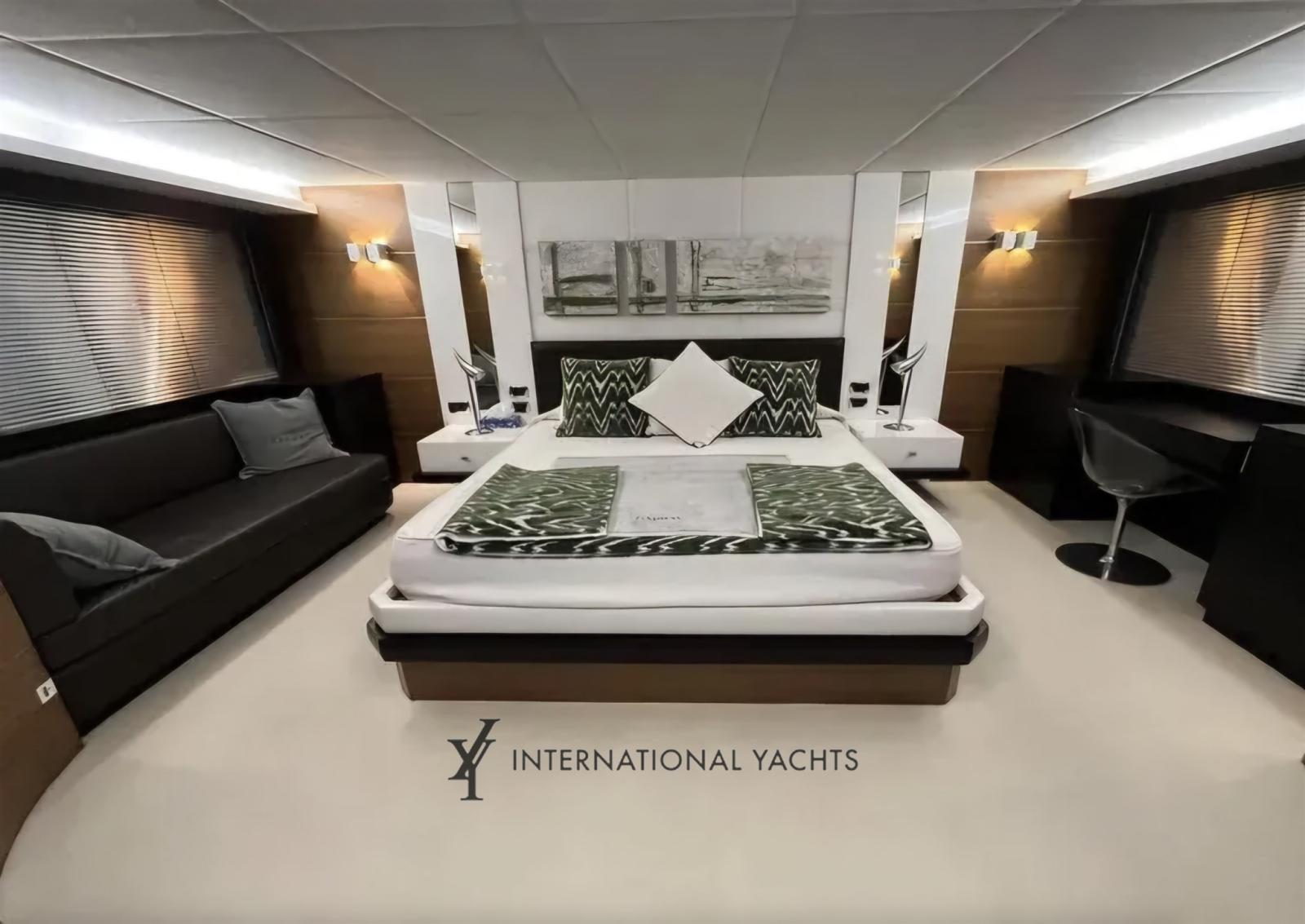 Eau sous pression, Passavant en teck, Grue de flybridge, Hard top (Flybridge), Passerelle, Plateforme arrière (Idraulica), Pompe de cale automatique, Porte latérale, Cockpit en teck, Prise de quai, Connexion eau sous pression à quai, Guindeau électrique, Echelle de bain, Stabilisateurs (Quick), table de cockpit, Annexe, Corne.