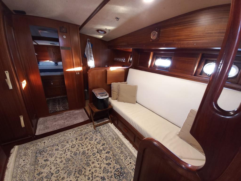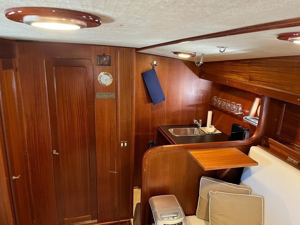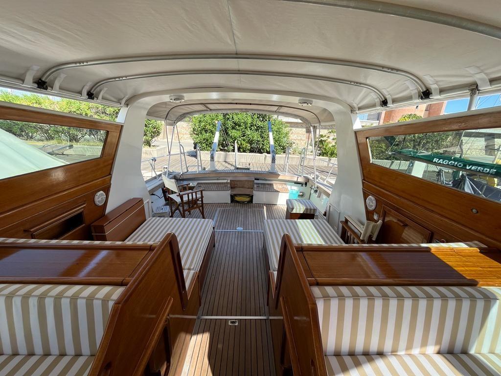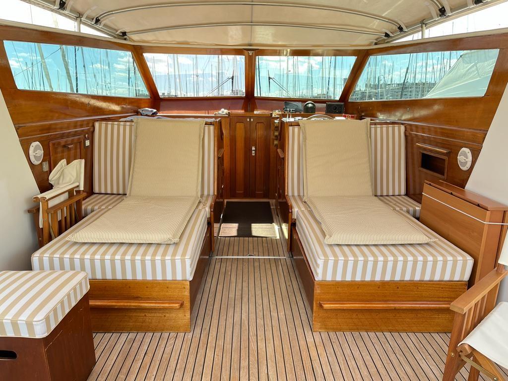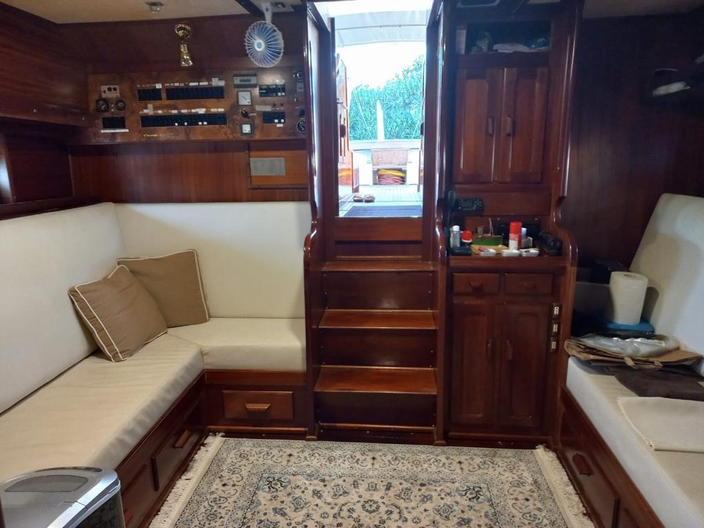 2022 : Nouvelle sellerie similicuir ivoire pour le poste de barre - Nouveaux coussins - Actionneurs de volets remplacés - Remplacement de la dinette et de la moquette de la cabine - Nouveau réflecteur radar - Nouveaux couvercles de bord