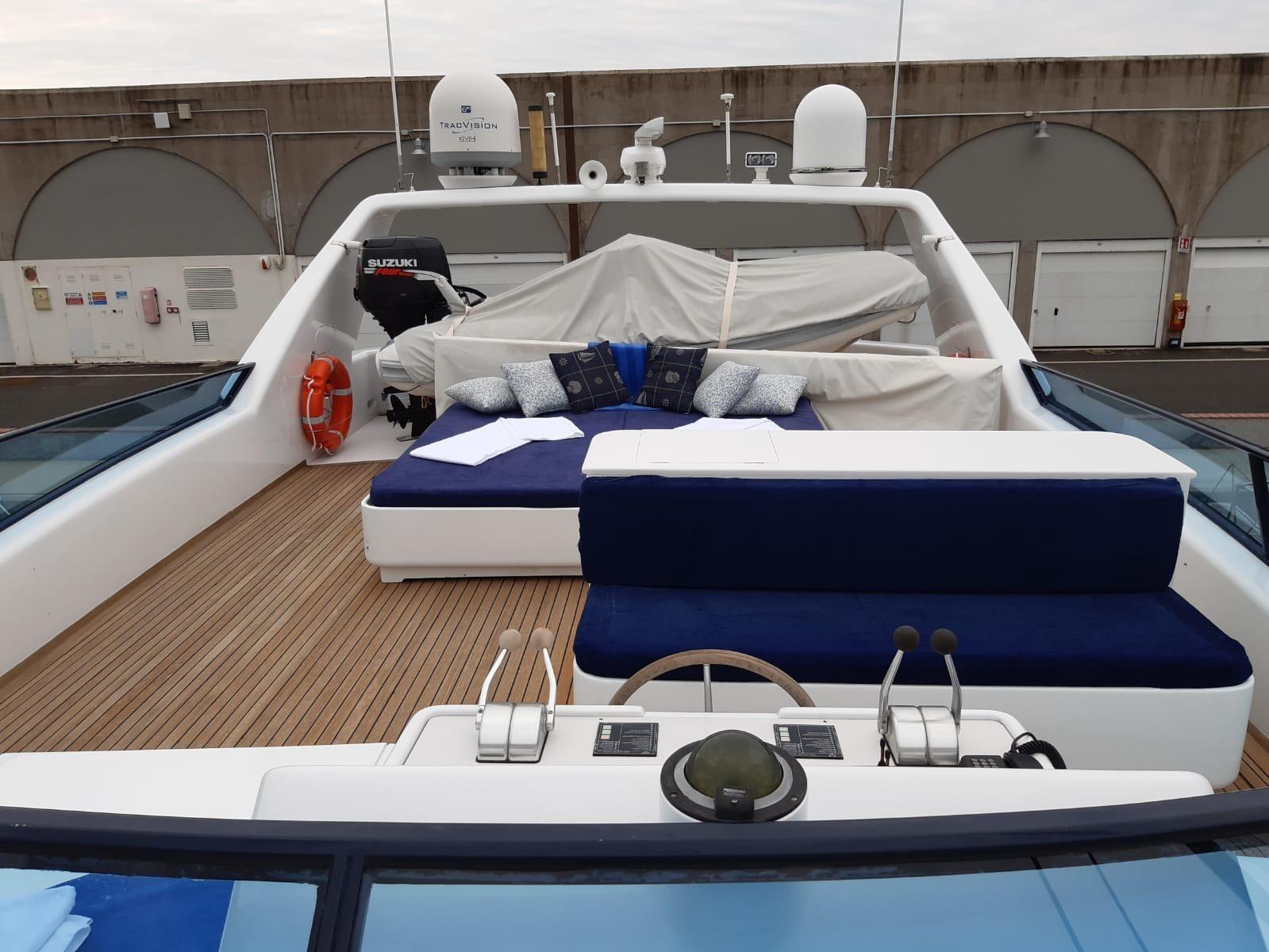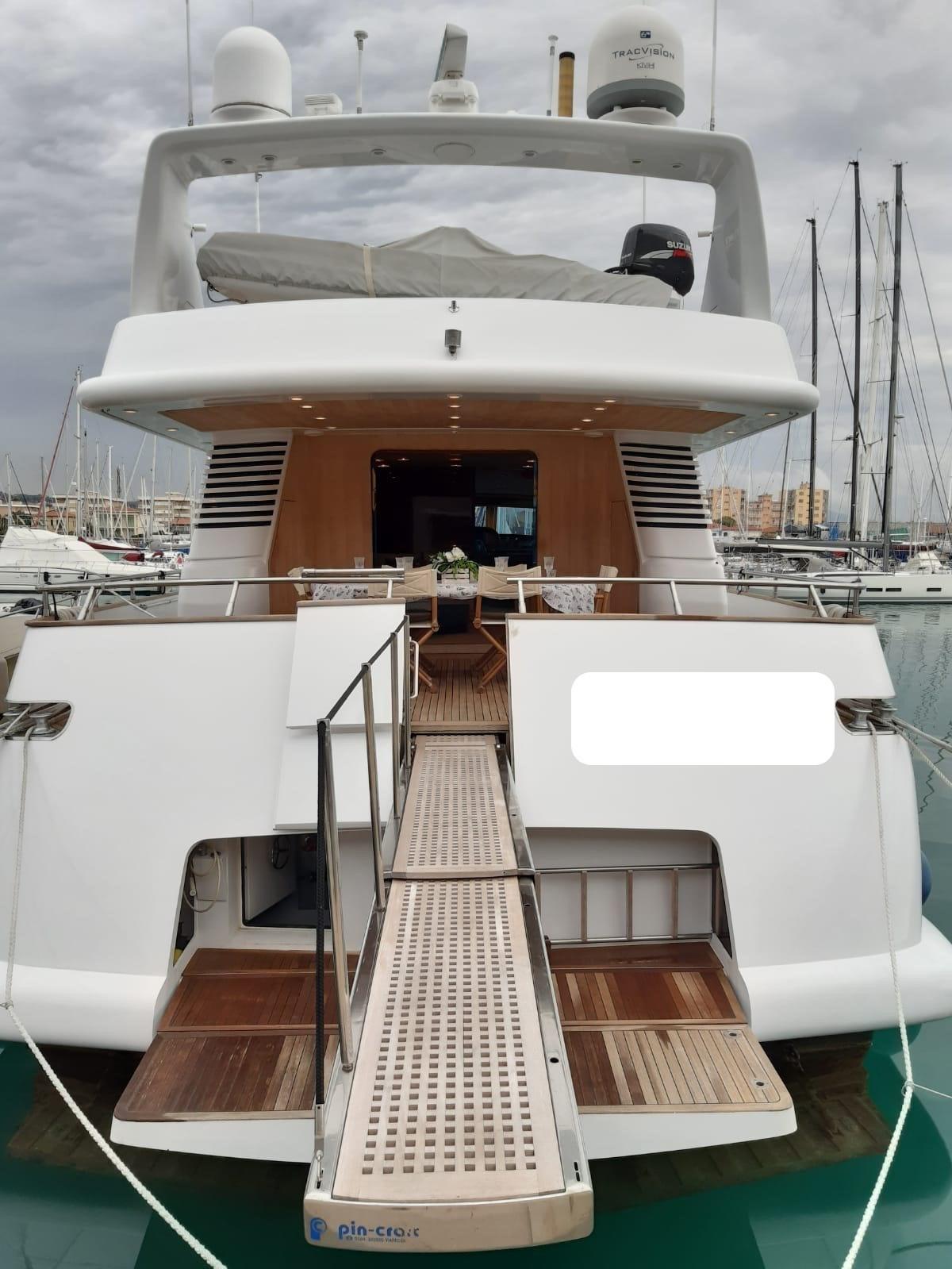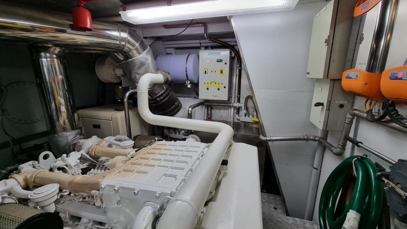 Alarme moteur, Alarme de pompe de cale, Eau sous pression, 2 Radeau de sauvetage (8 persone), 12 Batteries (8 servizi e 4 motori da 220 a), Passavant en teck, Double barre à roue, Phares fixes arrière, Phare de poursuite, Flaps hydrauliques, Extincteur(s) fixe(s), Spots sous-marins, Passerelle, Pompe de cale automatique, Pompe de cale manuelle, Porte latérale, Porte latérale, Cockpit en teck, Prise de quai, Onduleur, Répétiteur électronique, Rollbar, Guindeau électrique, Echelle de bain, table de cockpit, Annexe (4 mt con motore suzuki 40 hp), 2 Winch électrique arrière.