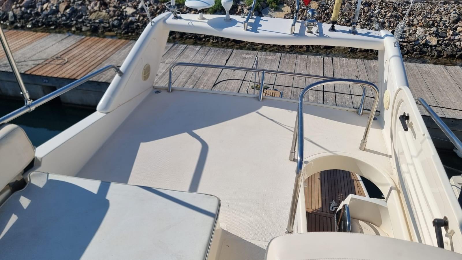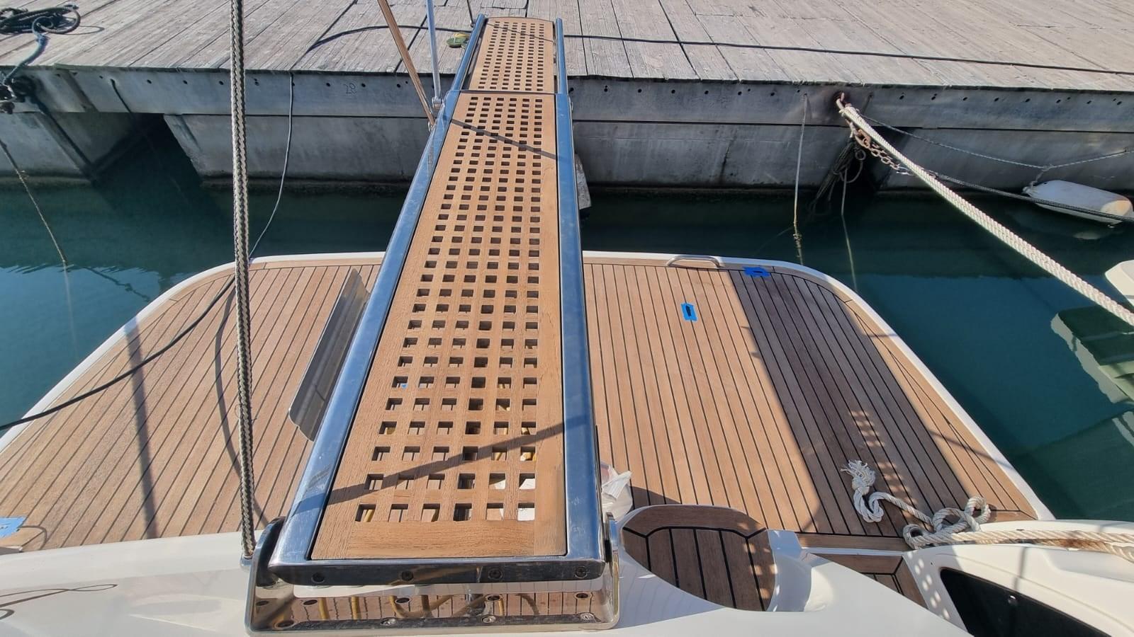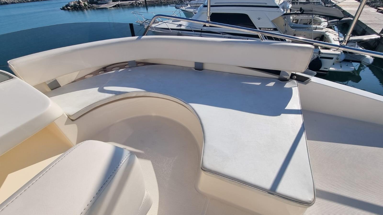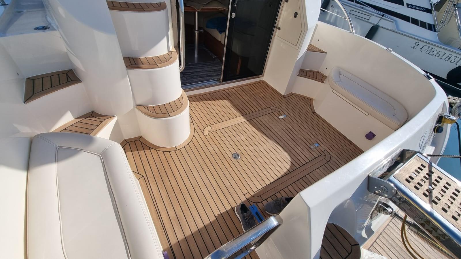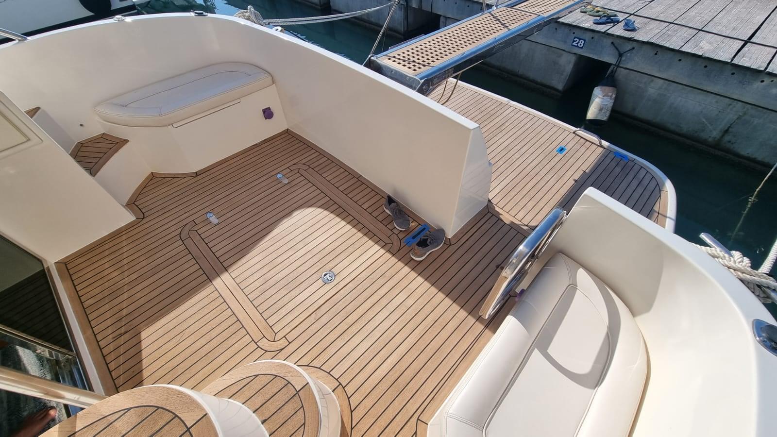 Travaux réalisés : Polissage complet, Revêtements silicone des vitres latérales et avant, Revêtements silicone teck sur marches et plate-forme du cockpit, Montage du bimini inox 4 arches pour flybridge, Montage de deux prises de courant cockpit 12 V, Montage de 3 batteries de 180 A pour les services 1 moteur et 1 batterie pour le propulseur d’étrave 105 En juillet 2024, Construction d’un système d’eaux noires, Remplacement de l’éclairage du cockpit, accouplement en silicone du rouf, installation de la télécommande du pilote automatique, caoutchoutage de la plate-forme arrière, protection de l’ancre d’étrave en acier inoxydable, nouveau radeau Eurovinyl COASTAL DRY 10 places, nouveaux coussins d’étrave avec housse de protection relative, nouveaux coussins de double-toit canapé et chaise longue complets, nouveaux coussins de poupe sièges et dossiers ronds, Fermeture totale du double-toit, fermeture totale du cockpit, protection de la passerelle, nouvelle moquette, nouvelles couvertures de vitres latérales et avant.
