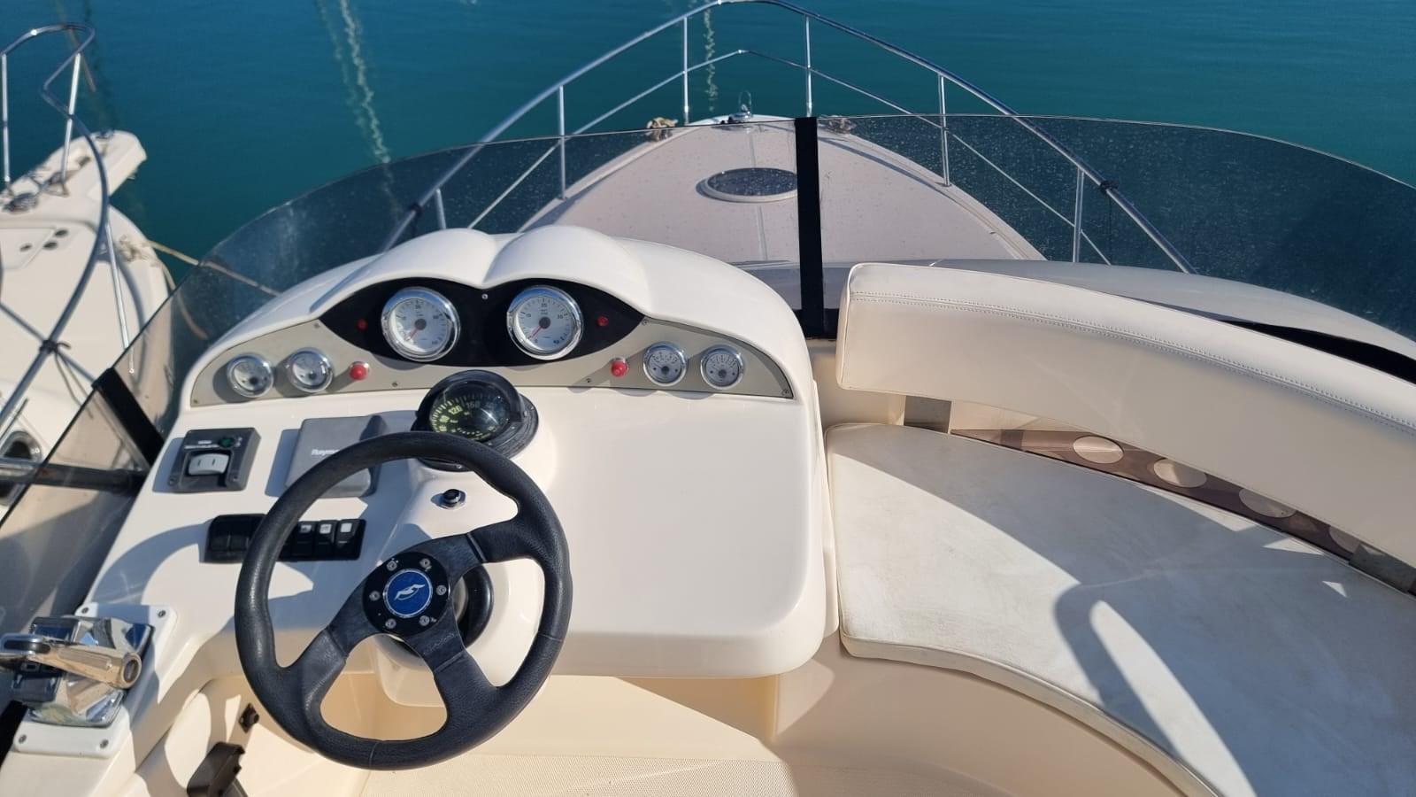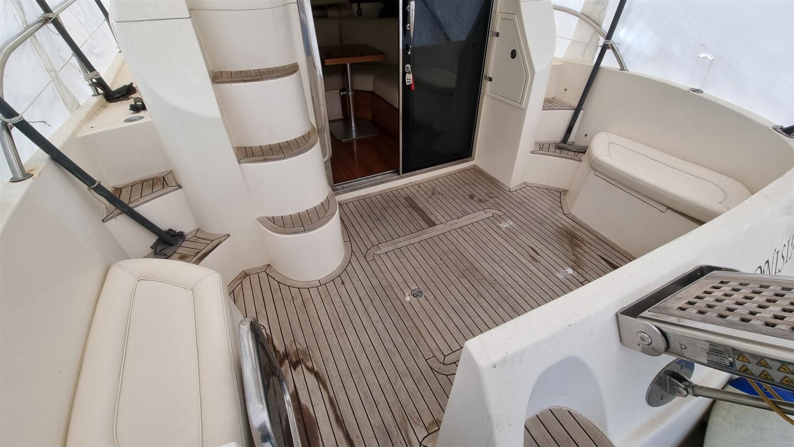 Alarme moteur, Alarme de pompe de cale, Eau sous pression, Radeau de sauvetage (Da revisionare), 3 Batteries (1 Motori 1 servizi 1 elica di prua), 2 Système de vidange, Douche de cockpit, Flaps hydrauliques, Extincteur(s) fixe(s), Éclairage de courtoisie, Passerelle (Idraulica opacmare), Plateforme arrière, Pompe de cale automatique, Pompe de cale manuelle, Porte latérale, Cockpit en teck, Prise de quai, Connexion eau sous pression à quai, Onduleur, Guindeau électrique, Echelle de bain, Corne.