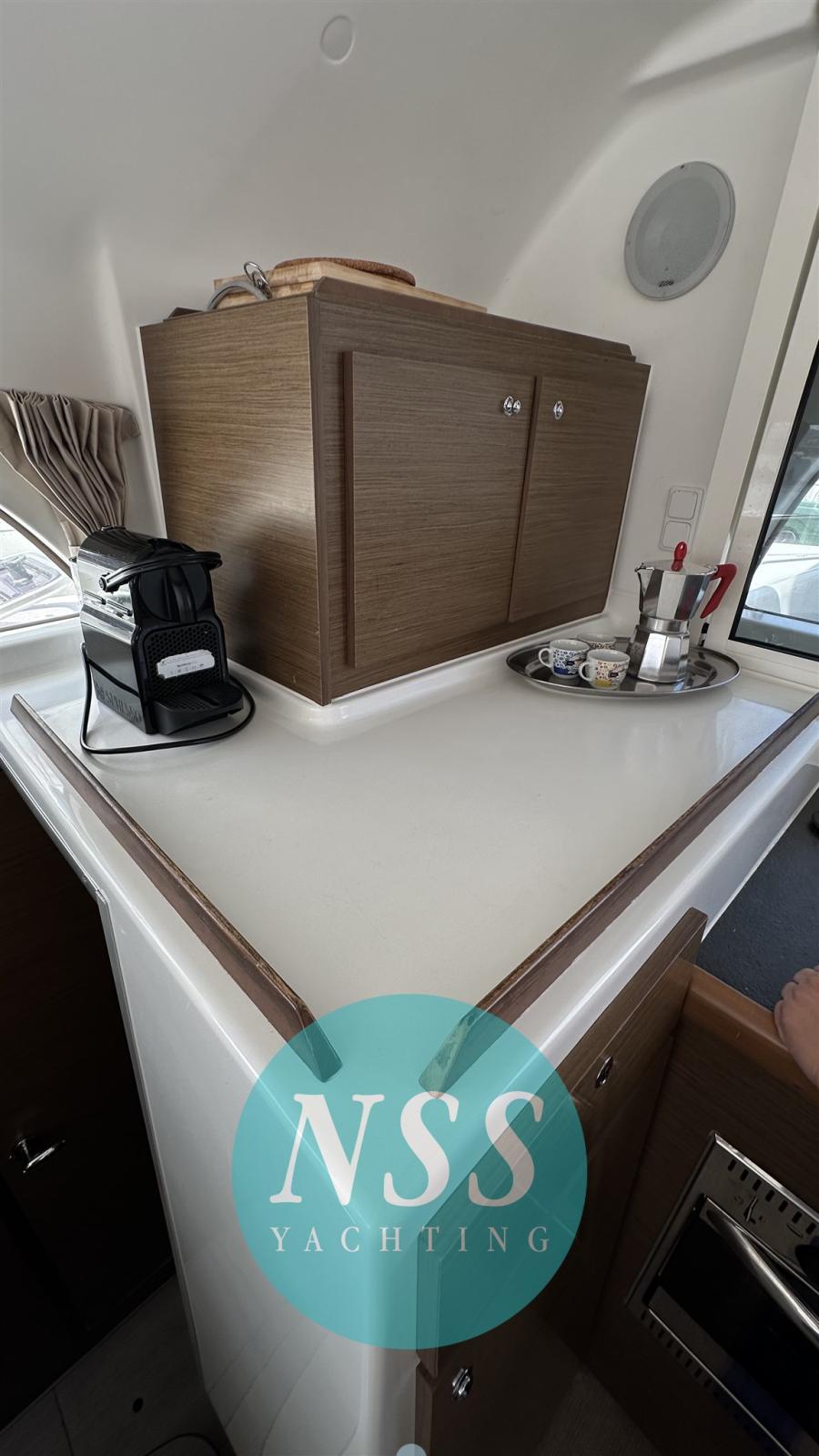 Eau sous pression, Douche de cockpit, Bossoirs pour annexe, Éclairage de courtoisie, Panneau solaire, Prise de quai, Guindeau électrique, Echelle de bain, Chaise support HB, table de cockpit, Winch, Windex.