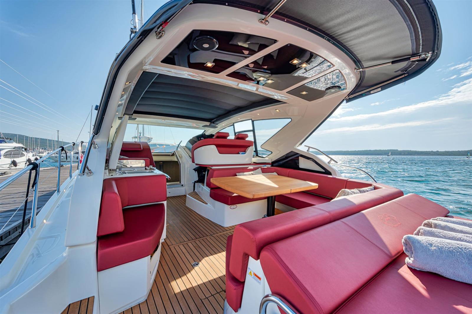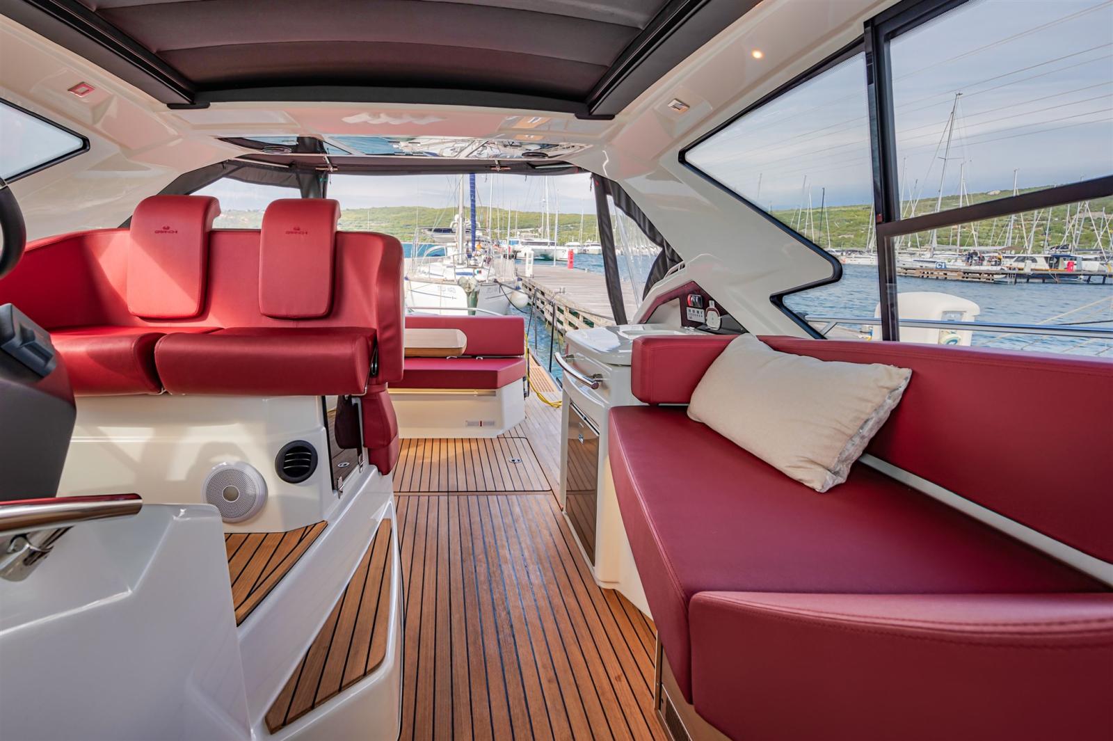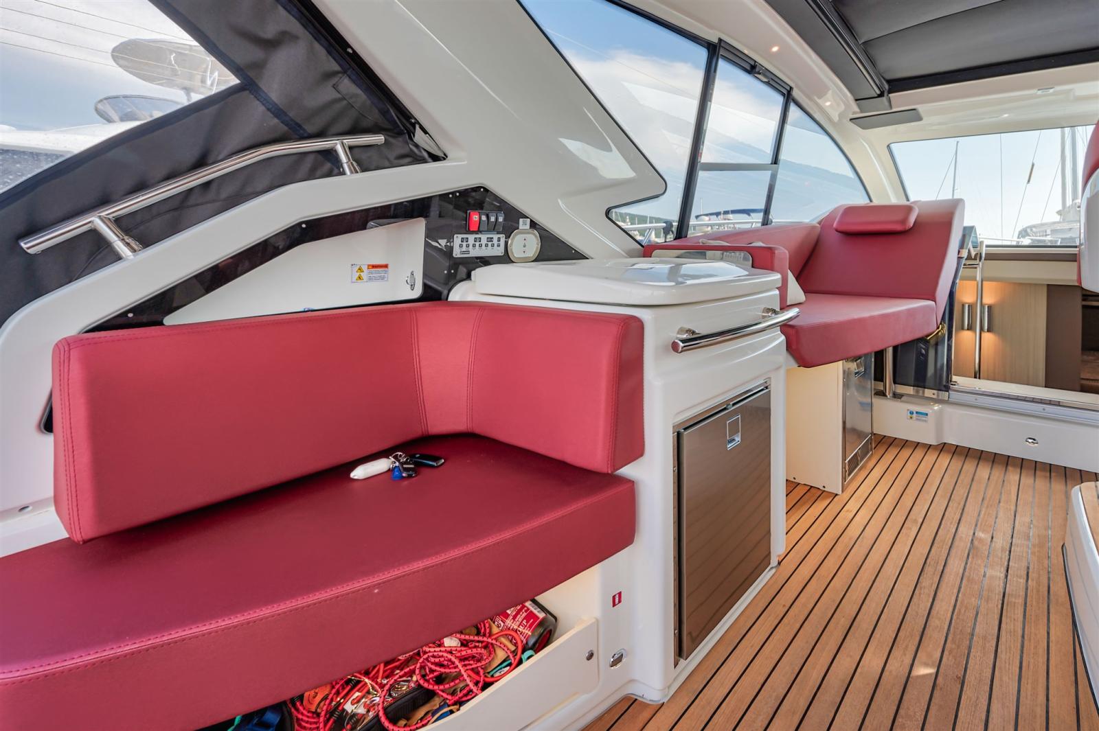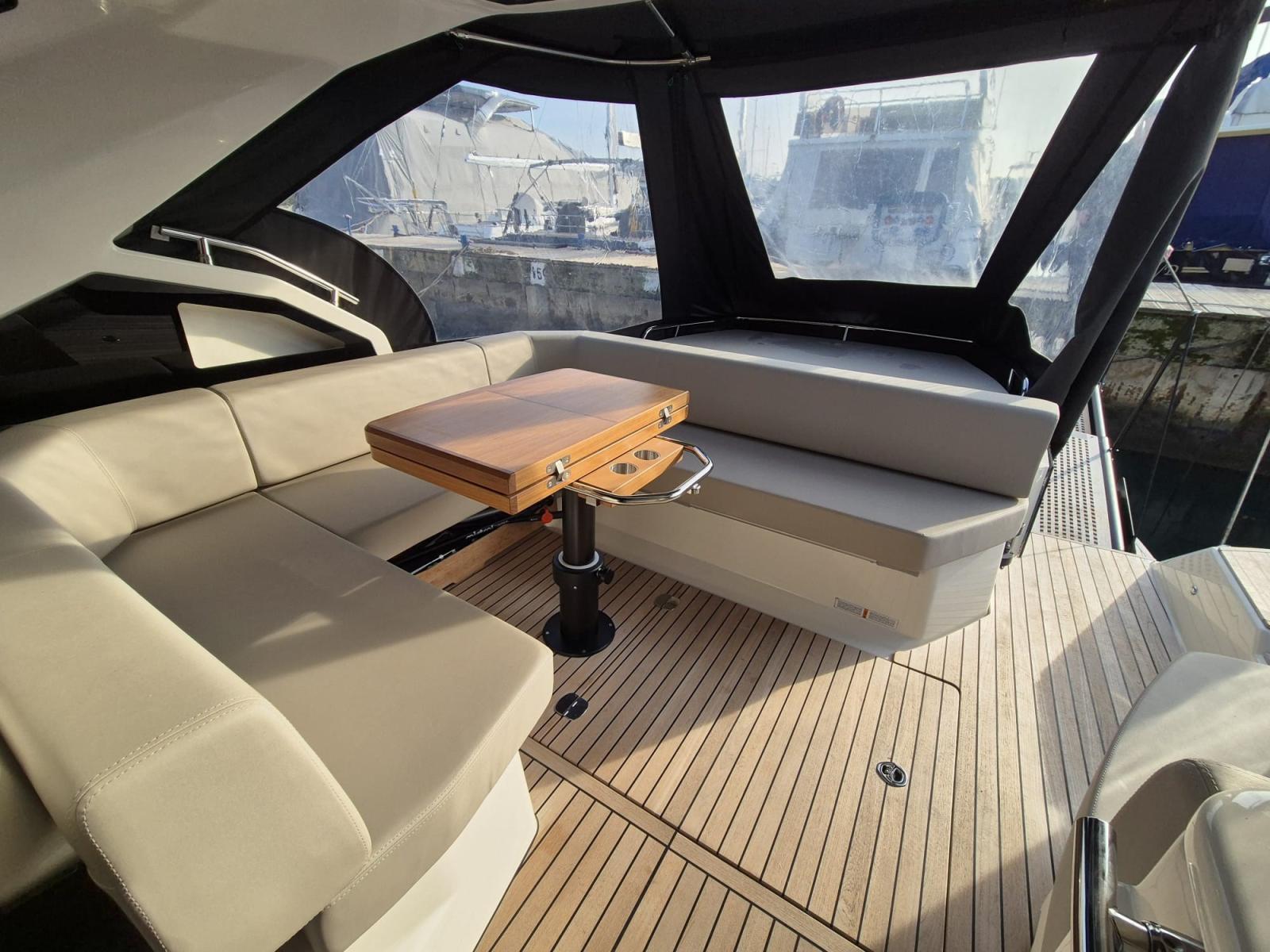 Alarme moteur, Alarme de pompe de cale (Acoustic and visual on dashboard), Ancre (21kg stainless steel), Eau sous pression, 3 Batteries, Système de vidange, Chargeur de batterie (35ah), 2 Douche de cockpit (bow and stern), Propulseur d'étrave (Sidepower), Phare de poursuite, Flaps électriques, Garage à annexe, 4 Extincteur(s) fixe(s), Indicateurs de flaps, Éclairage de courtoisie, 3 Spots sous-marins, Passerelle (Besenzoni 3m), Plateforme arrière (Hydraulic HI LO platform), Pompe de cale automatique, Pompe de cale manuelle, Porte latérale, Cockpit en teck, Prise de quai, Guindeau électrique, Echelle de bain, table de cockpit, Table pliante de salon, Corne.