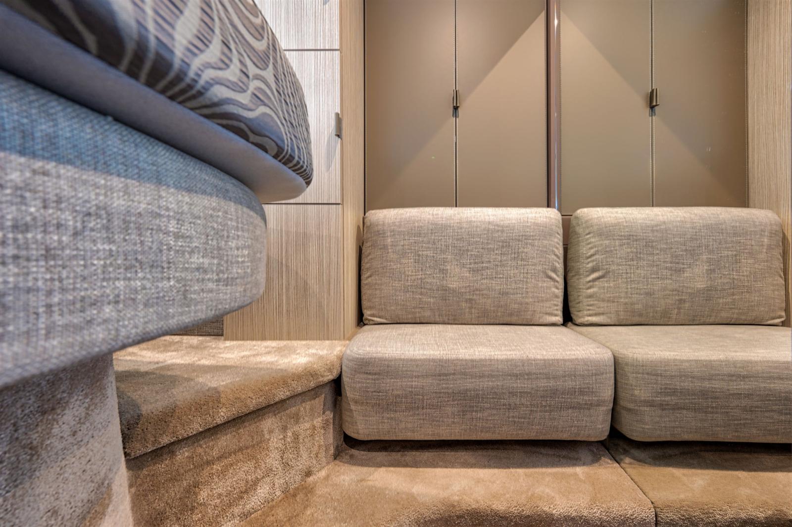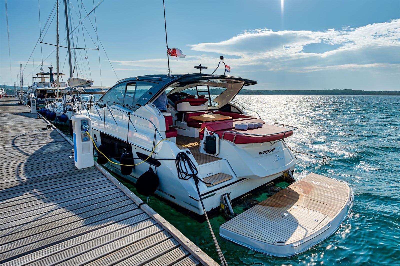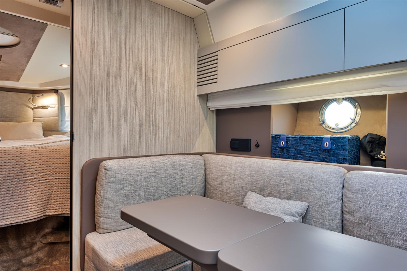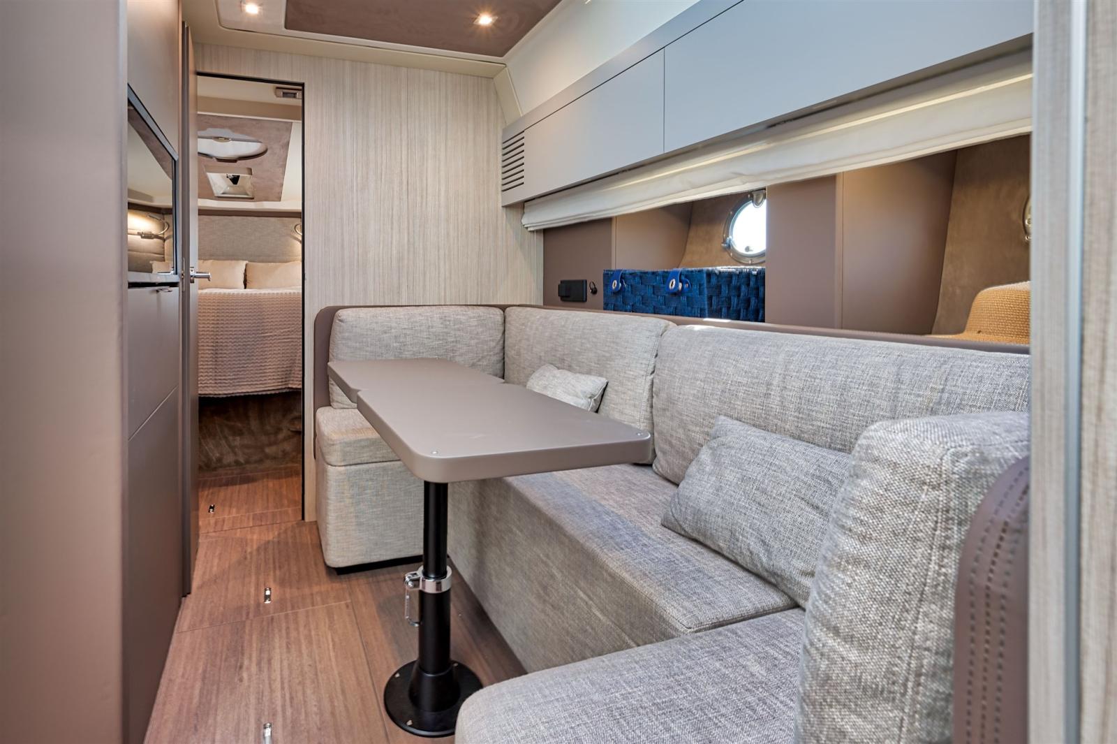 Alarme moteur, Alarme de pompe de cale (Acoustic and visual on dashboard), Ancre (21kg stainless steel), Eau sous pression, 3 Batteries, Système de vidange, Chargeur de batterie (35ah), 2 Douche de cockpit (bow and stern), Propulseur d'étrave (Sidepower), Phare de poursuite, Flaps électriques, Garage à annexe, 4 Extincteur(s) fixe(s), Indicateurs de flaps, Éclairage de courtoisie, 3 Spots sous-marins, Passerelle (Besenzoni 3m), Plateforme arrière (Hydraulic HI LO platform), Pompe de cale automatique, Pompe de cale manuelle, Porte latérale, Cockpit en teck, Prise de quai, Guindeau électrique, Echelle de bain, table de cockpit, Table pliante de salon, Corne.