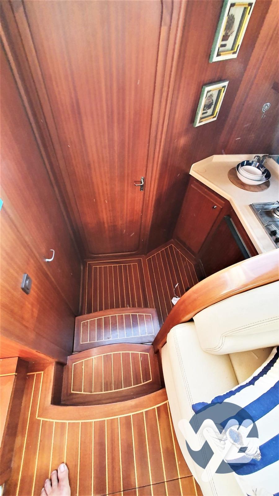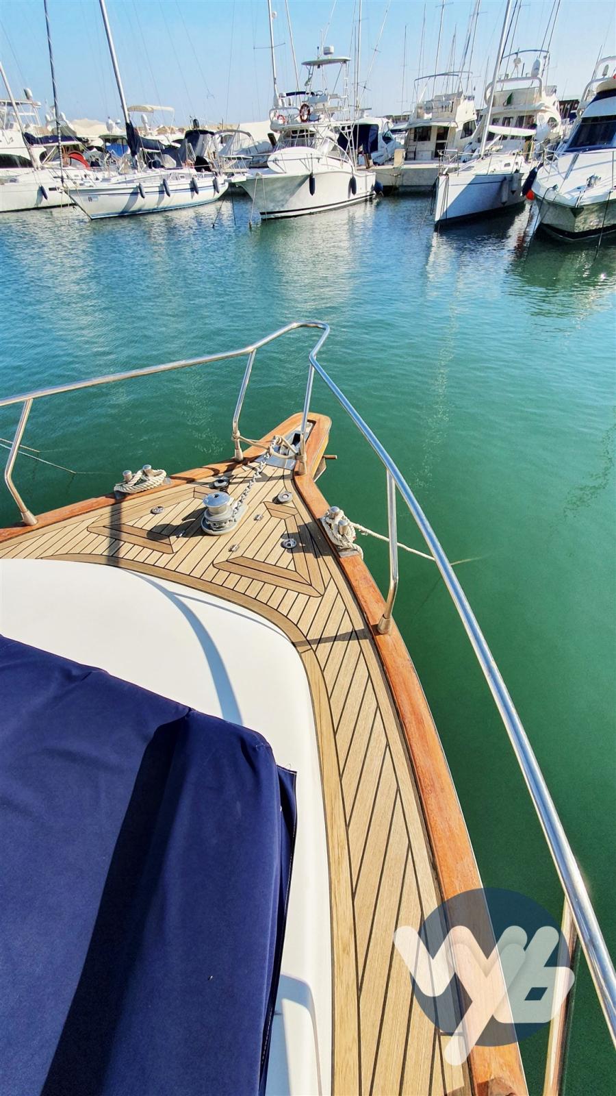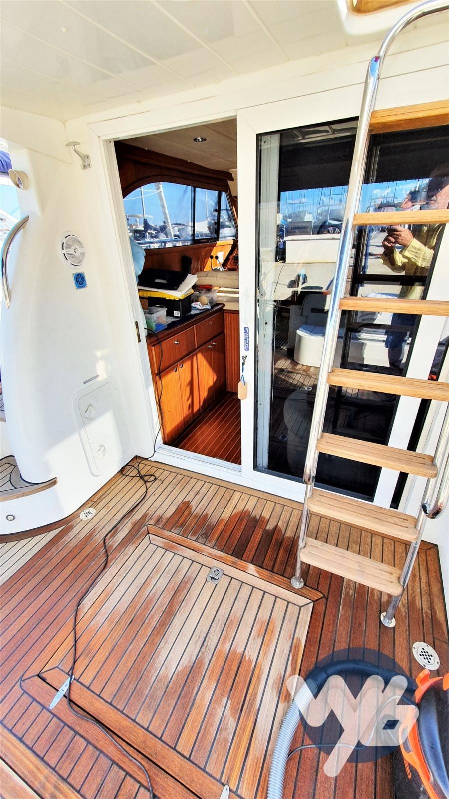 Alarme moteur, Alarme de pompe de cale, Eau sous pression, Passavant en teck, Douche de cockpit, Double barre à roue, Phare de poursuite, Flaps hydrauliques, Passerelle, Pompe de cale manuelle, Porte latérale, Cockpit en teck, Prise de quai, Connexion eau sous pression à quai, Guindeau électrique, Echelle de bain.