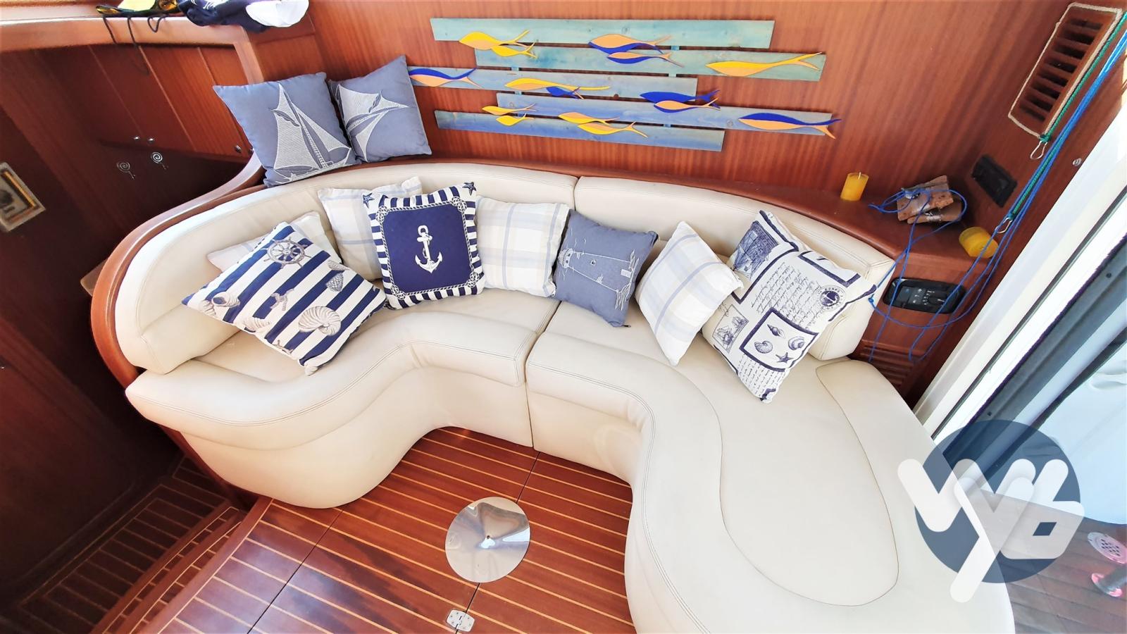 Passerelle hydraulique-Windlhead-propulseur d’étrave-douche extérieure et intérieure-phare réglable-manœuvres de nuit-lumière-volets électriques-cockpit en teck et bain de plage-cabines en acajou de plancher-système de climatisation Webasto diesel-auvent et coussins complets